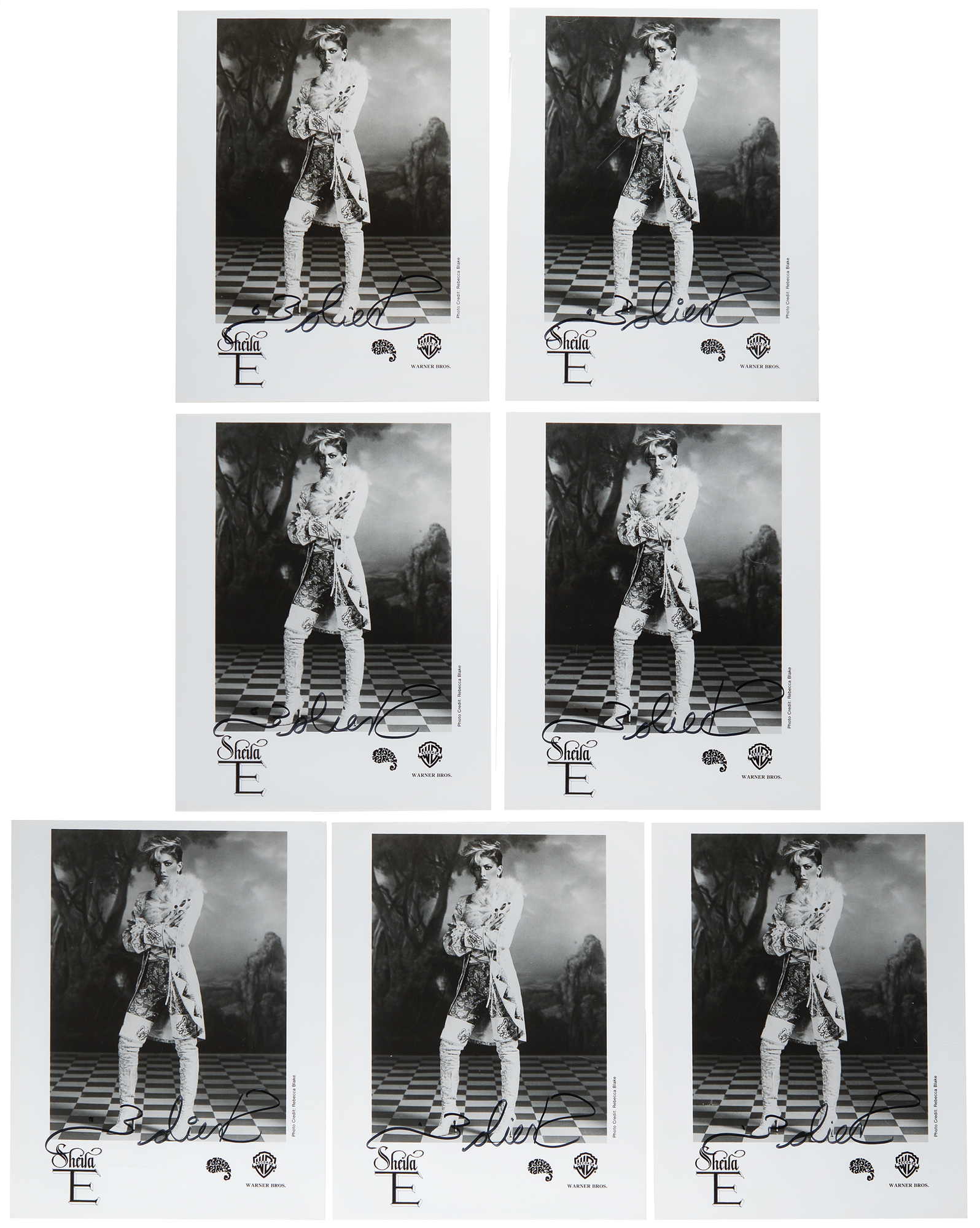 - seven glossy 8 x 10 Warner Bros. Records/Paisley Park photos of Sheila E. for her Romance 1600 album, each signed in black felt tip, with Sheila E. impressively writing each signature backward