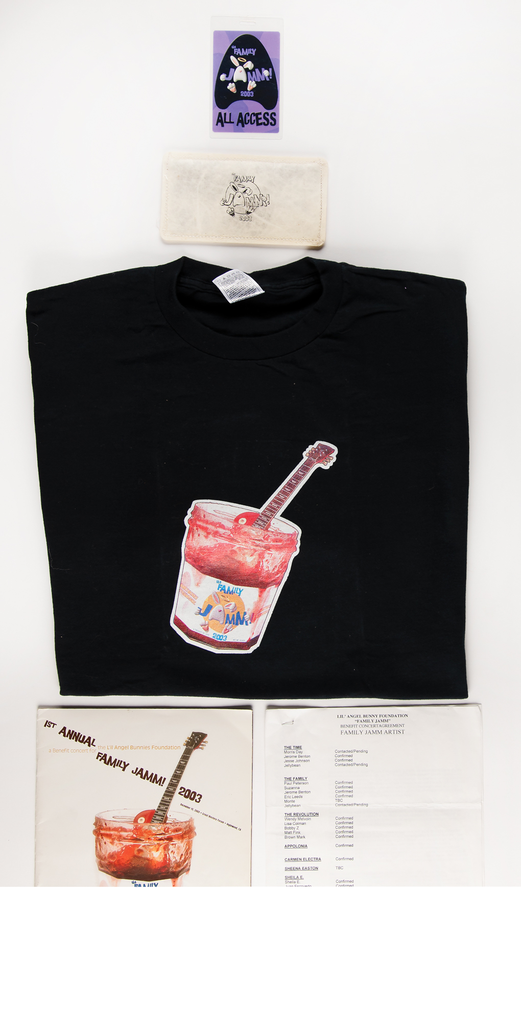 - ephemera group lot from ‘Family Jamm 2003,’ a December 2003 concert benefiting the Lil' Angel Bunny Foundation, which includes a multi-signed program, a laminated all-access pass, a black event t-shirt (XL), an artist attendance list, and an event shaker