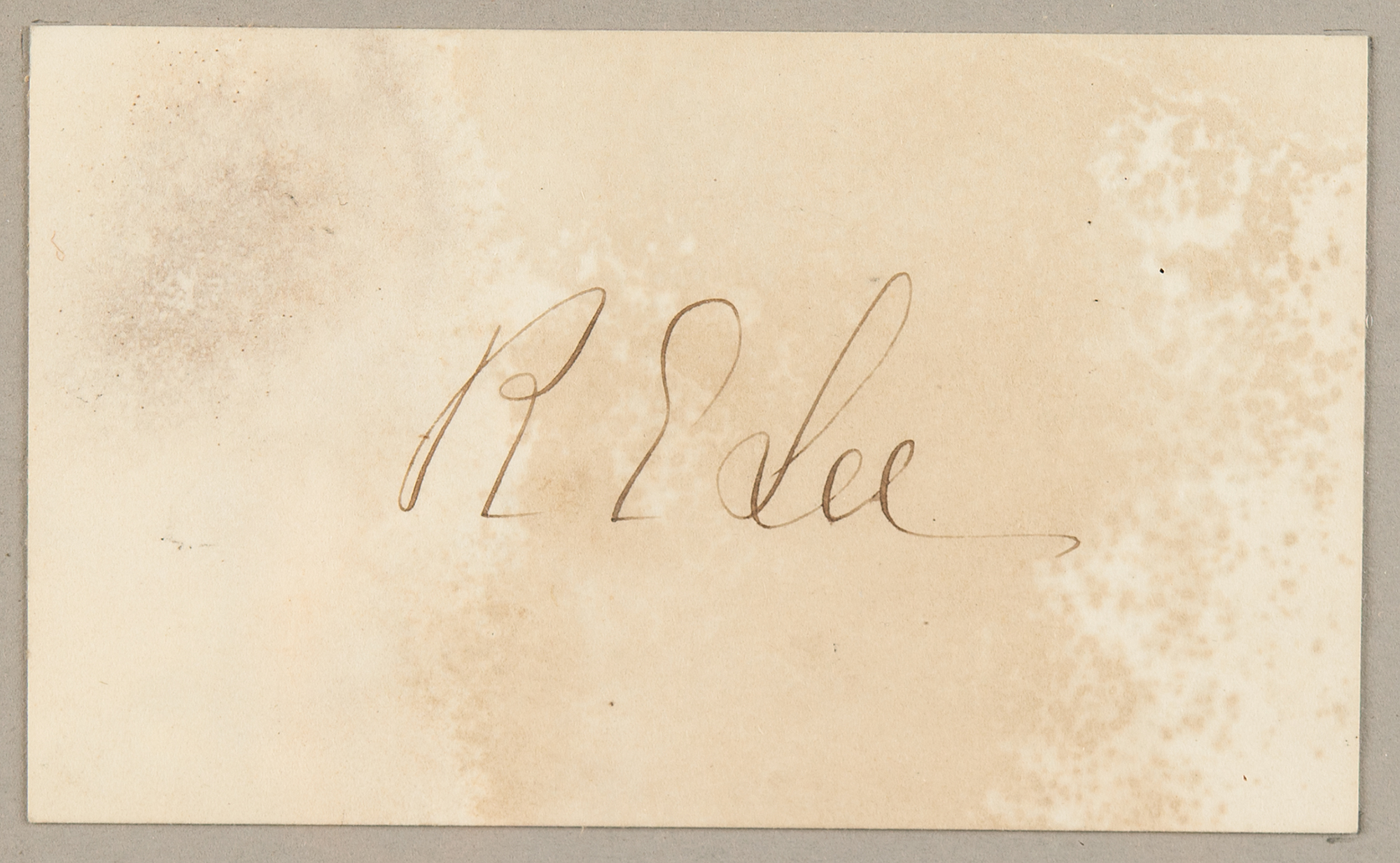 Ink signature, "R. E. Lee," on an off-white 3.25 x 2 card, mounted to a mat also featuring an ALS from his son George Washington Custis Lee, signed "G. W. C. Lee," dated May 10, 1871, in part: "Although having but few of my father's autographs left I send you one of them in accordance with your request." An original pencil sketch of Lee is also drawn on the mat above the affixed signature. Framed to an overall size of 14.75 x 12.5. In very good condition, with irregular staining affecting the overall appearance. A highly desirable Civil War autograph with excellent direct familial provenance.