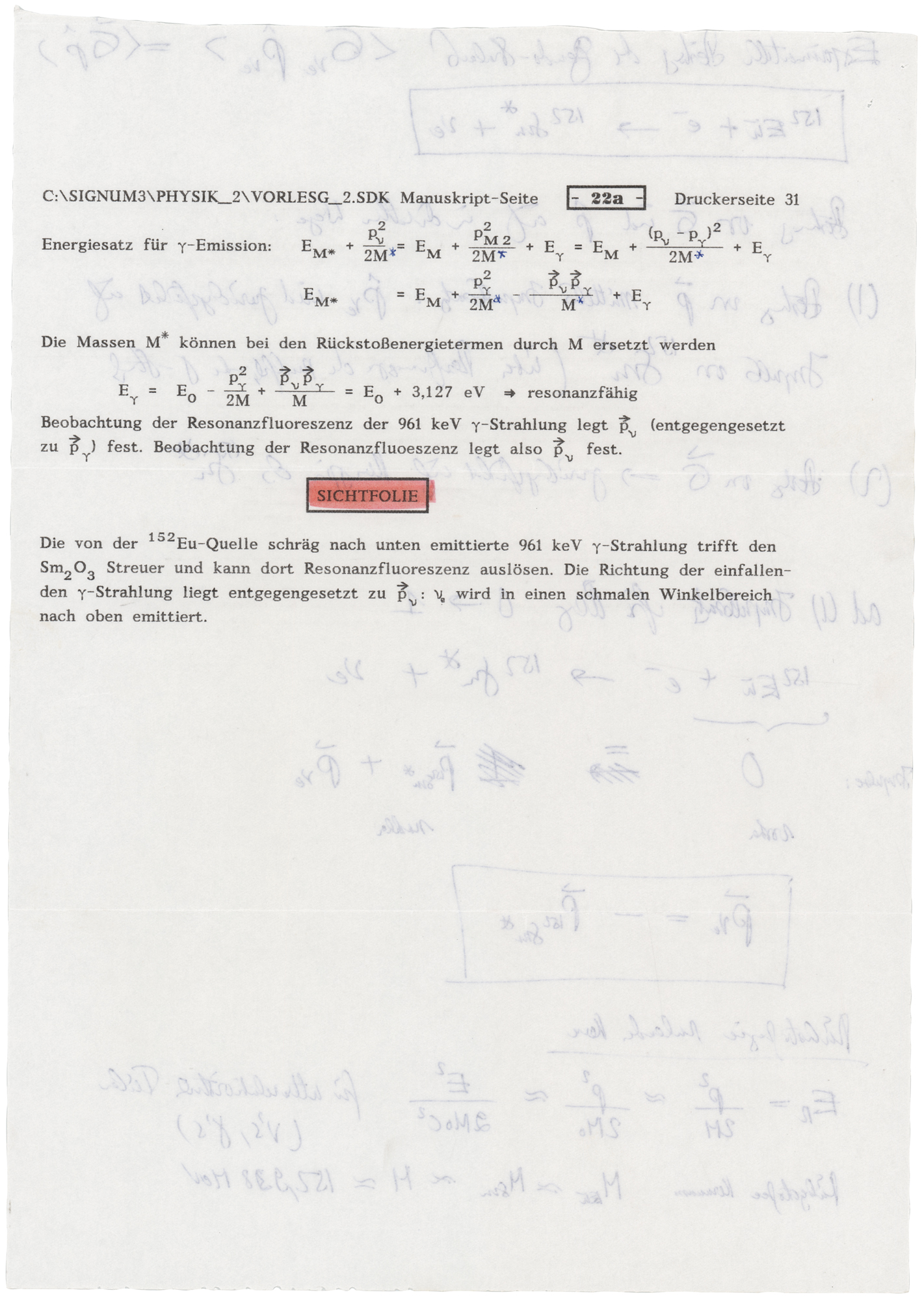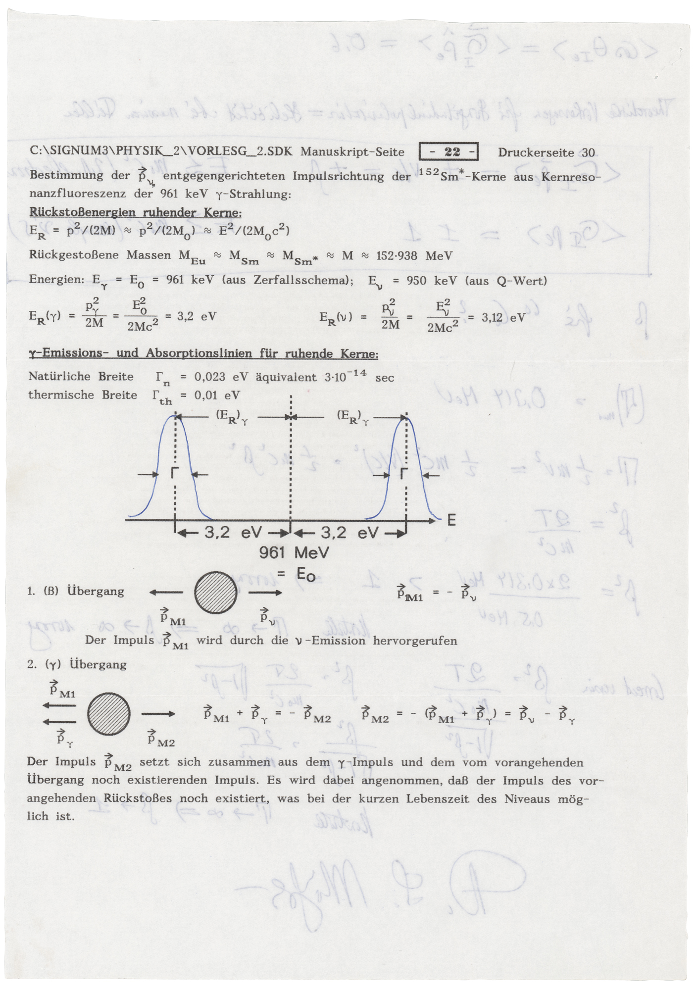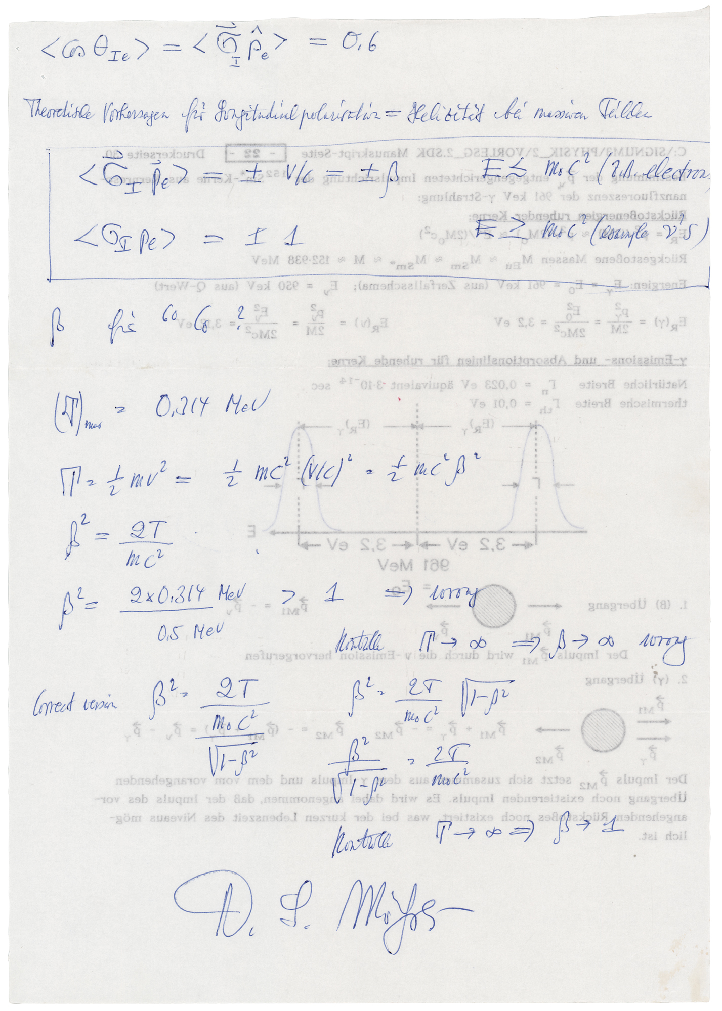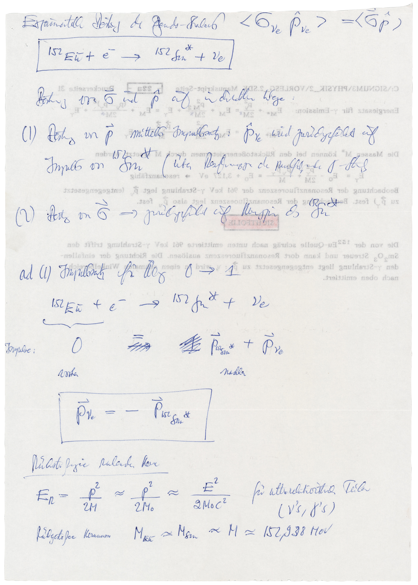 German physicist (1929–2011) who received the 1961 Nobel Prize in Physics for his discovery of recoilless nuclear resonance fluorescence, now known as the 'Mossbauer effect.' Handwritten mathematical expressions and notes penned in blue ballpoint by Mossbauer on the reverse of two 8.25 x 11.75 German worksheets, no date, signed at the bottom of one page, "R. L. Mossbauer." The worksheets appear to be related to energy emission and absorption rates. In fine condition. Accompanied by the original mailing envelope, postmarked January 20, 1993.