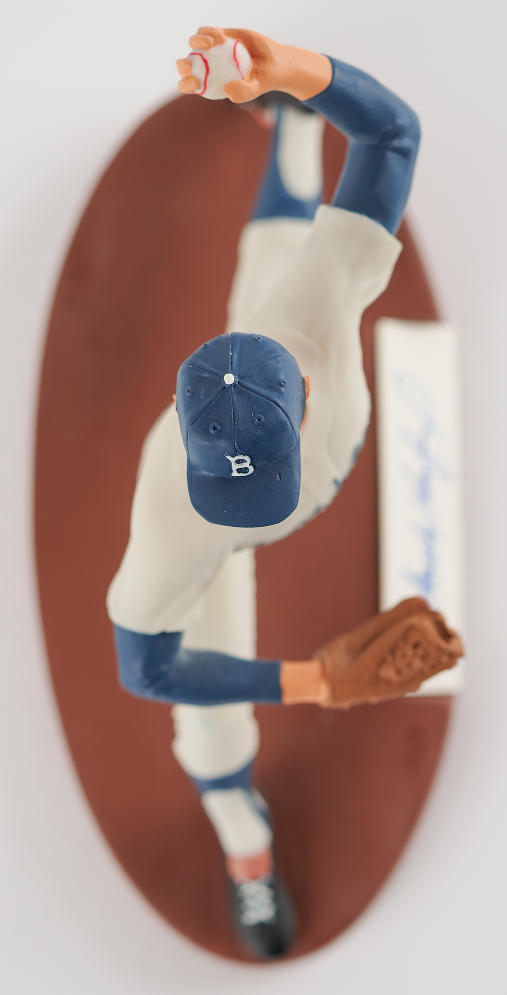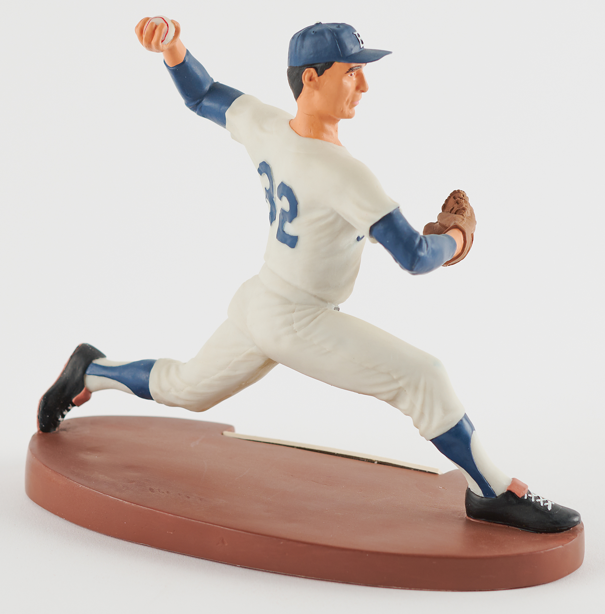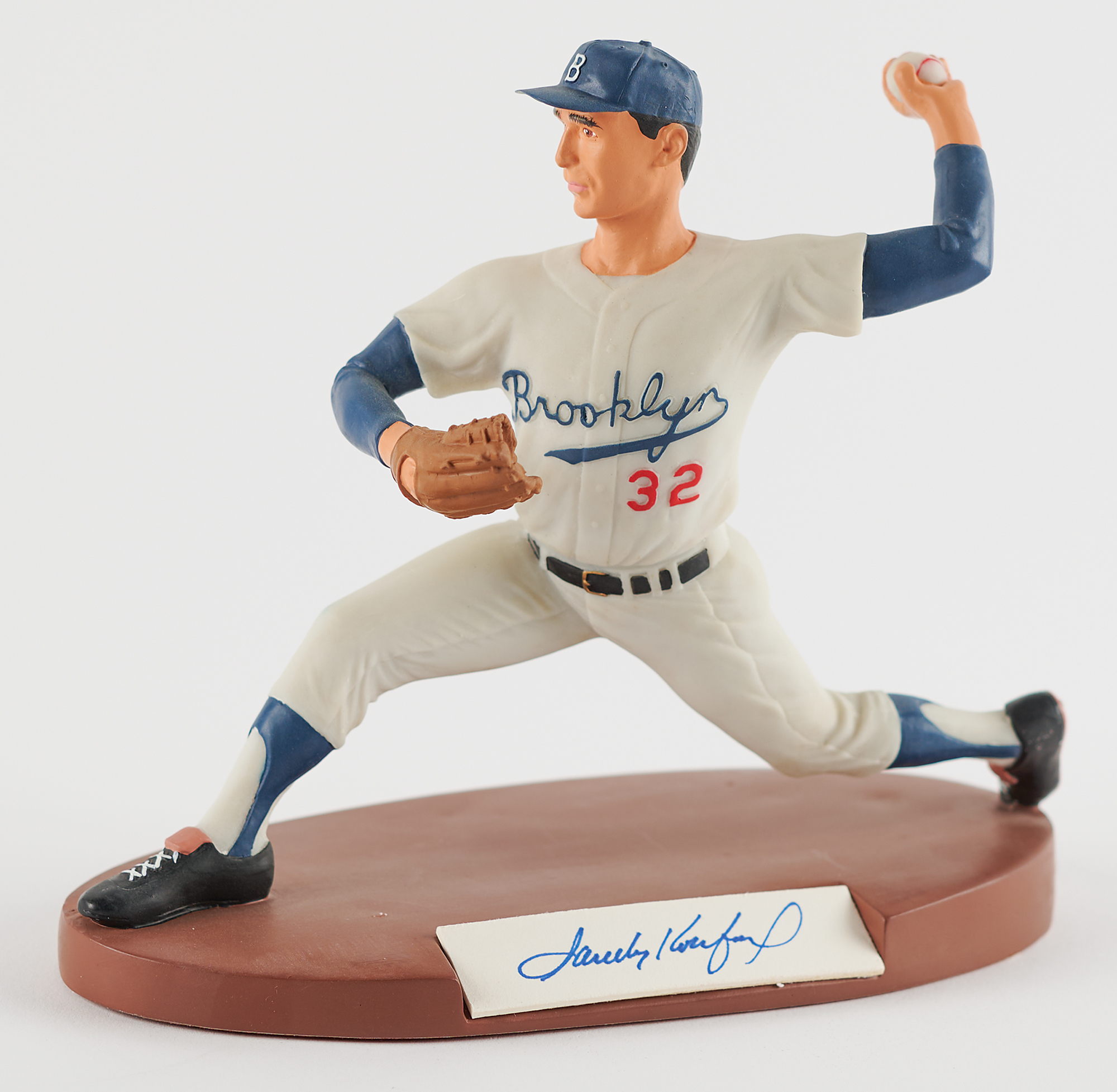 Outstanding limited edition hand-painted figurine of legendary Brooklyn Dodgers southpaw Sandy Koufax by Salvino Sports Legends, standing 7˝ in height and set upon a 7.75˝ x 3.75˝ base, the front of which bears an affixed card signed in blue felt tip by Koufax. The underside of the base features a label numbered 0601/2500. In very fine condition. Accompanied by the original Salvino box.