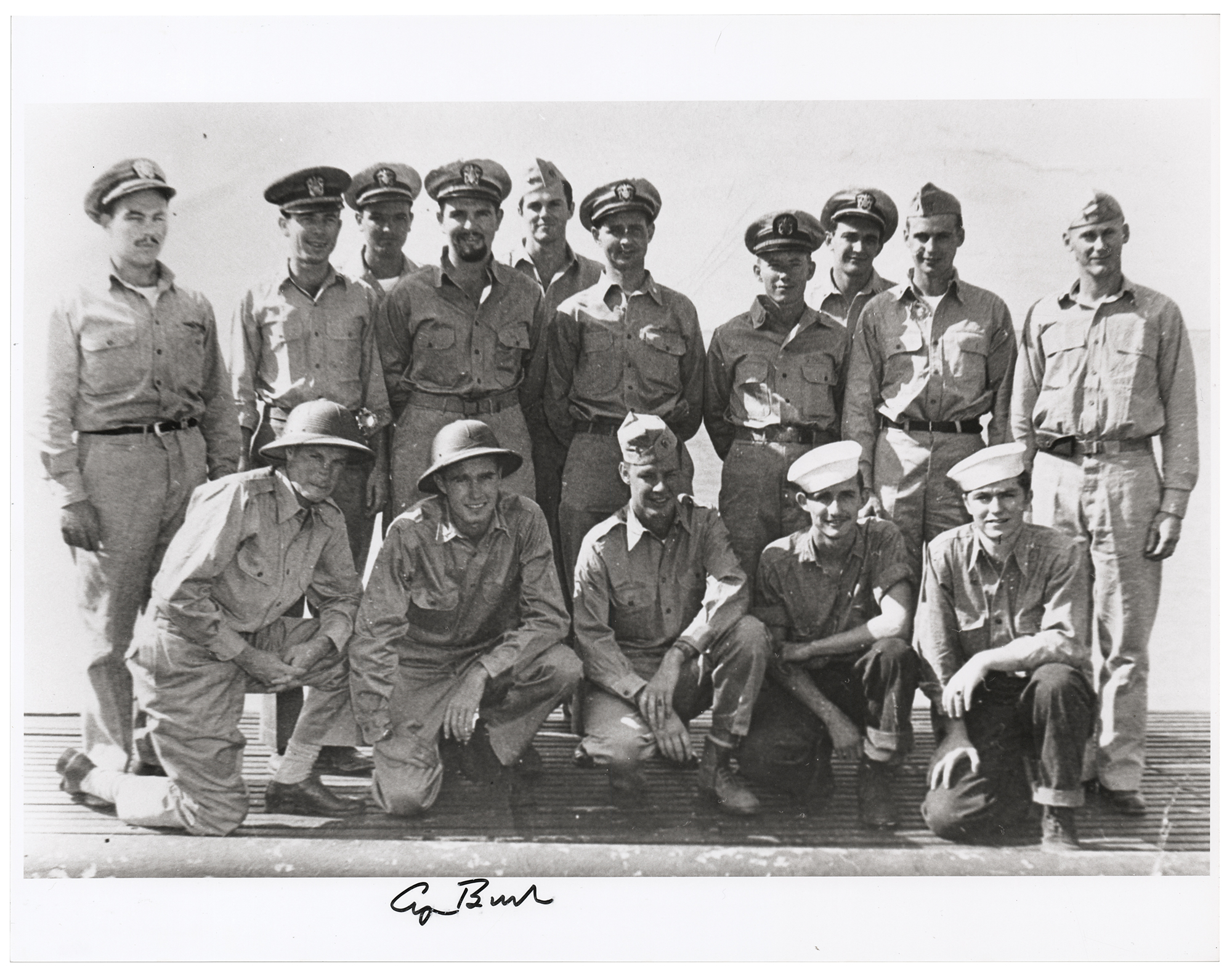 Glossy 14 x 11 photo of officers and crew of the USS Finback with rescued Navy pilot George Bush kneeling second from the left, signed in the lower border in black felt tip by Bush. In fine condition.