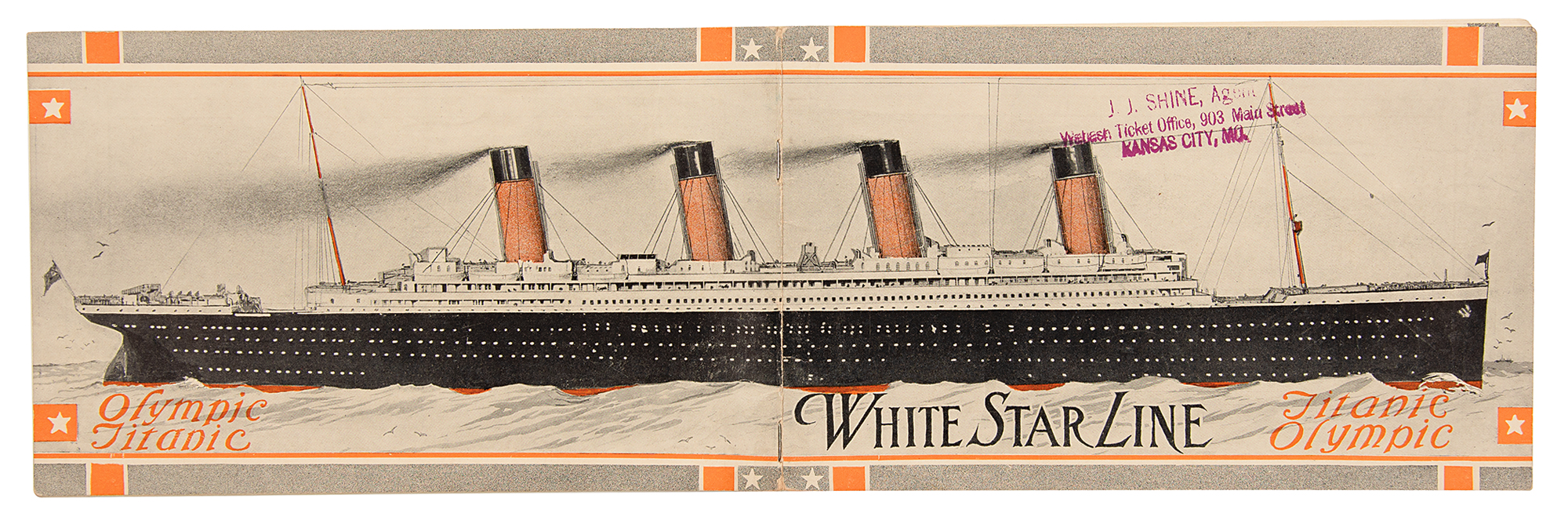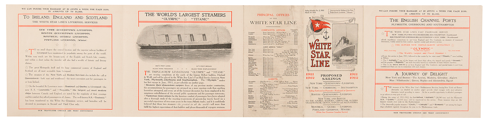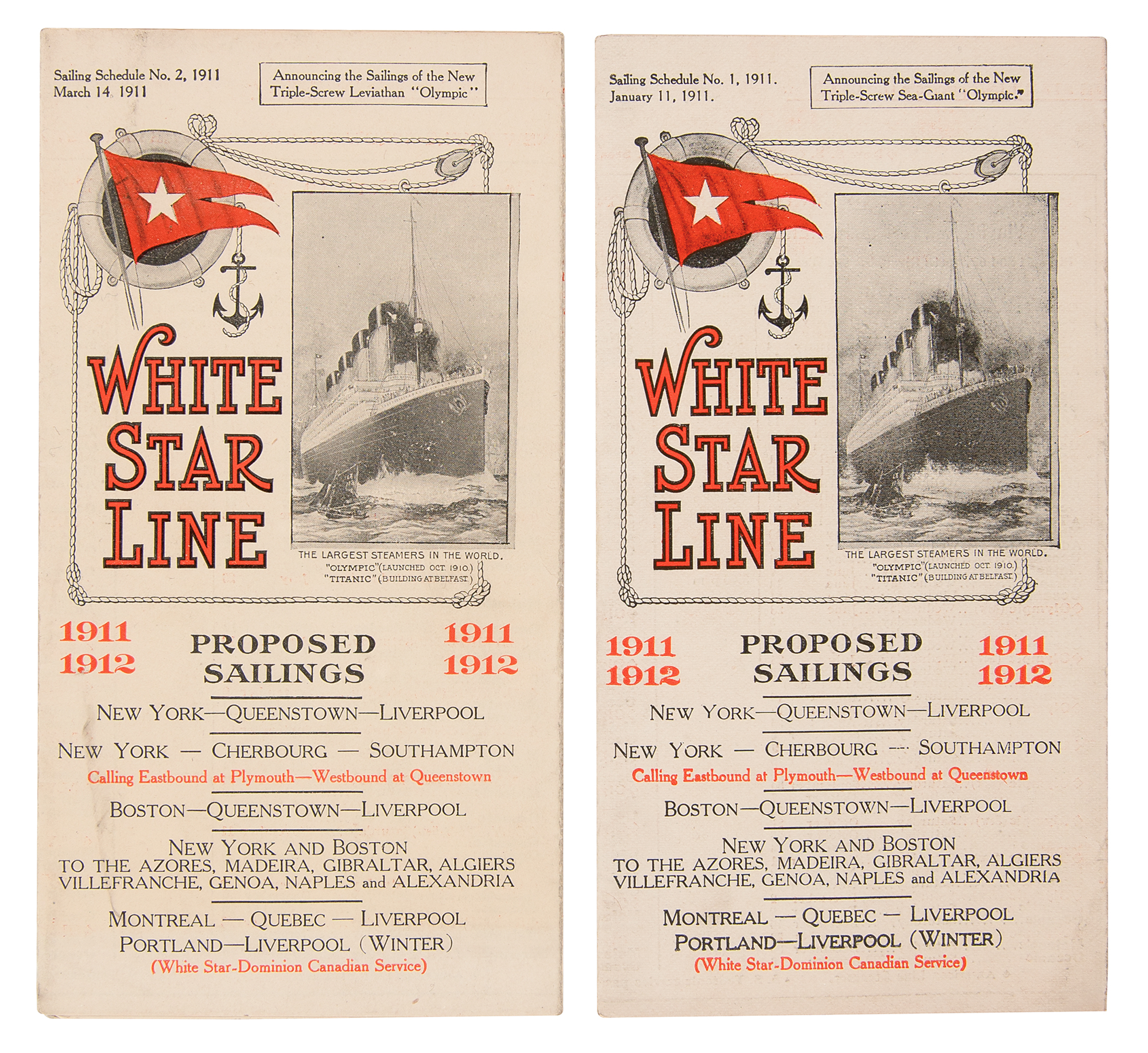 - Two “Proposed Sailings” fold-out booklets from the White Star Line, 3.5 x 6.5 (both measure 27.25 x 6.5 unfolded), identified as “Sailing Schedule No. 1, 1911. January 11, 1911” and “Sailing Schedule No. 2, 1911, March 14, 1911,” both of which feature several mentions of the under-construction Titanic: under an image of the Olympic on the front page, “‘Titanic’ (Building at Belfast)”; the opening section notes how the Olympic will be “followed in due course by her sister-vessel ‘Titanic,’ now building at Belfast”; the upper border of the inner schedule section is marked twice, “The Largest Steamers in the World, ‘Olympic (Launched)’ and ‘Titanic (Building),’ 45,000 Tons Each”; and another section is devoted to the “Triple-Screw Sea Giants ‘Olympic’ and ‘Titanic,’” which are “nearing completion at the yards of the famous Belfast builders, Harland & Wolff.”