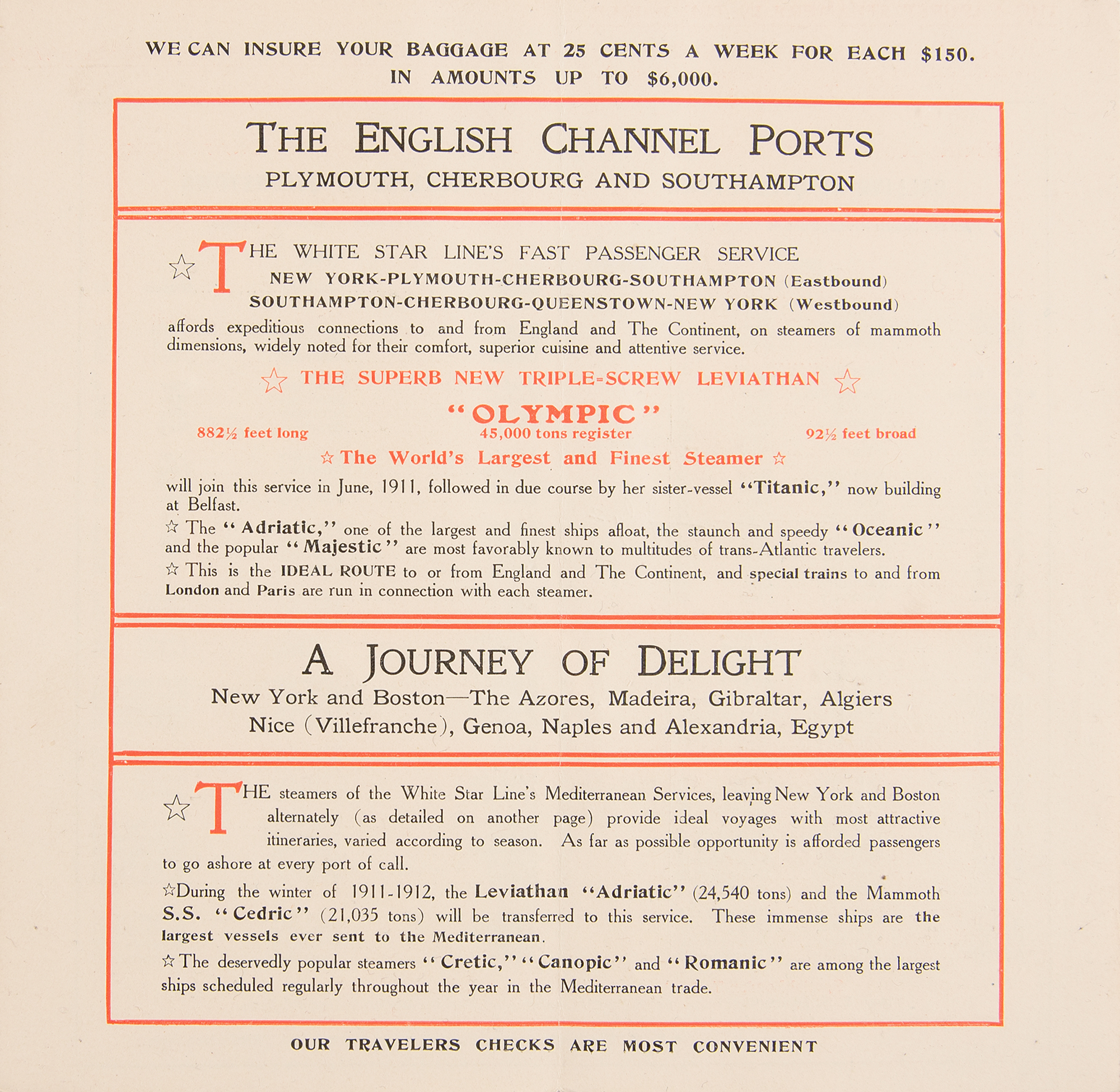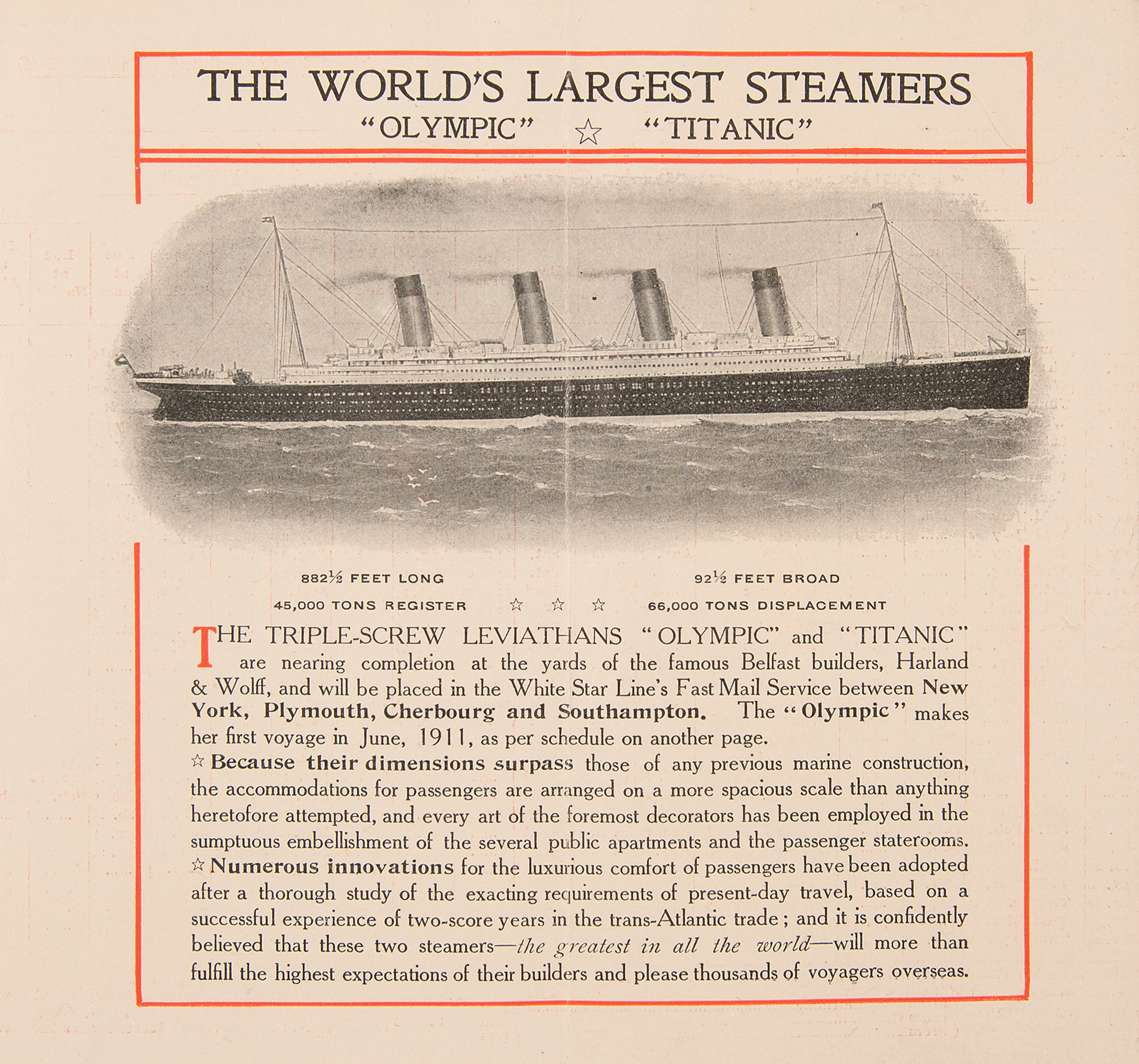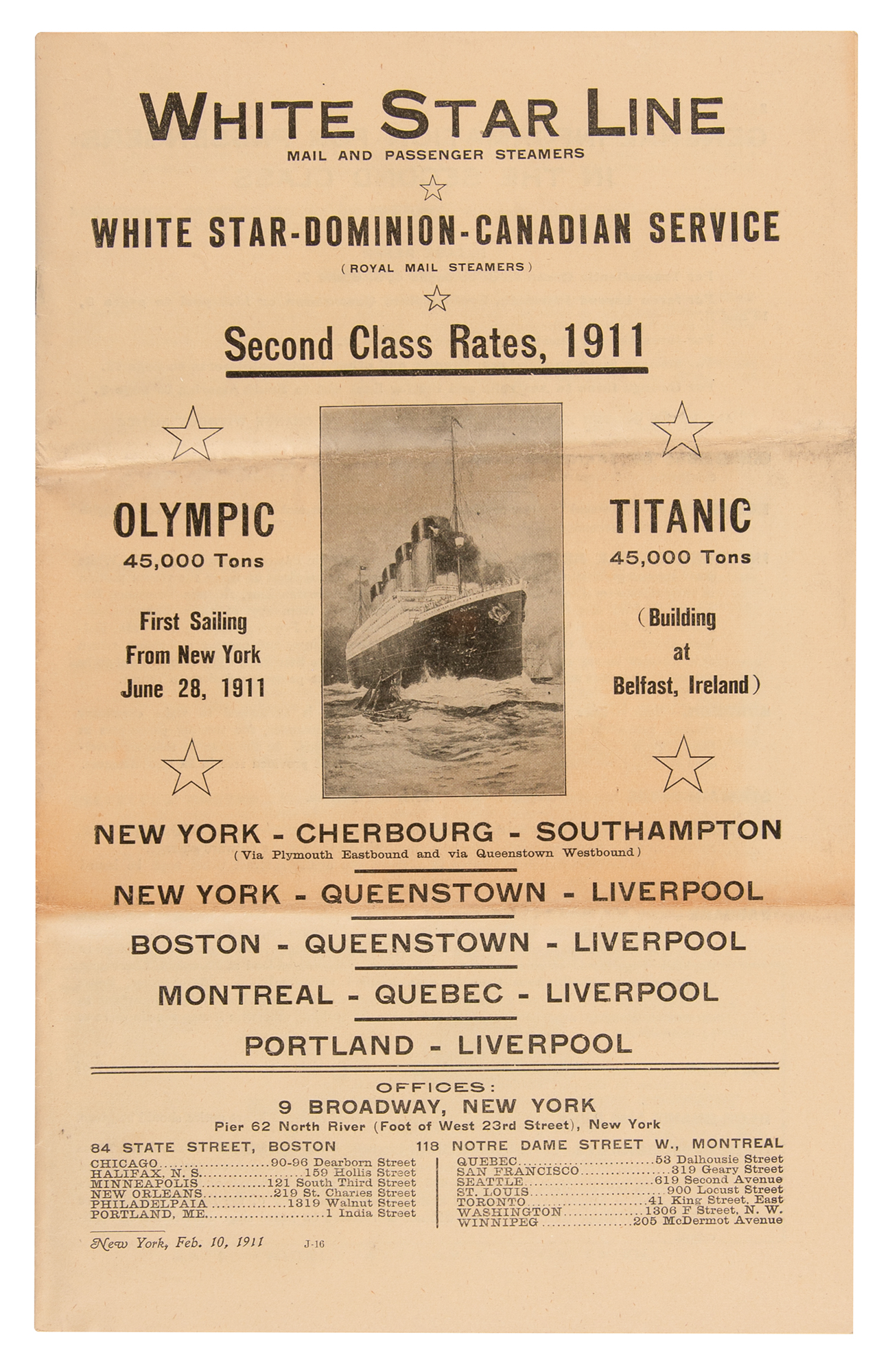 - Pamphlet for ‘Second Class Rates, 1911’ issued for the White Star Line and the White Star-Dominion-Canadian Service on February 10, 1911, twelve pages, 6.75 x 10.75, with the cover promoting the “Titanic, 45,000 Tons (Building at Belfast, Ireland),” next to an image of the Olympic, “First Sailing from New York, June 28, 1911.”