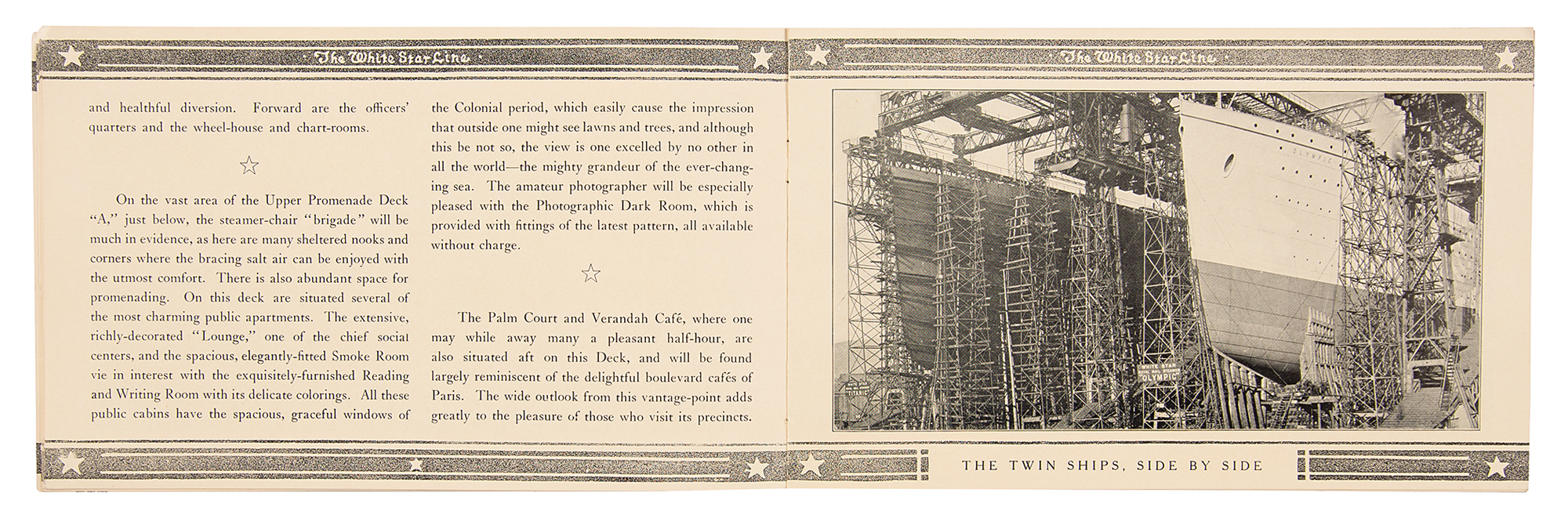 - Rare circa 1910 booklet entitled ‘The Largest Steamers in the World: Olympic / Titanic,’ twenty-two pages, 8.5 x 5.25, which contains images and detailed information on the construction of both ships at the Harland & Wolf shipyard in Belfast, Northern Ireland.
