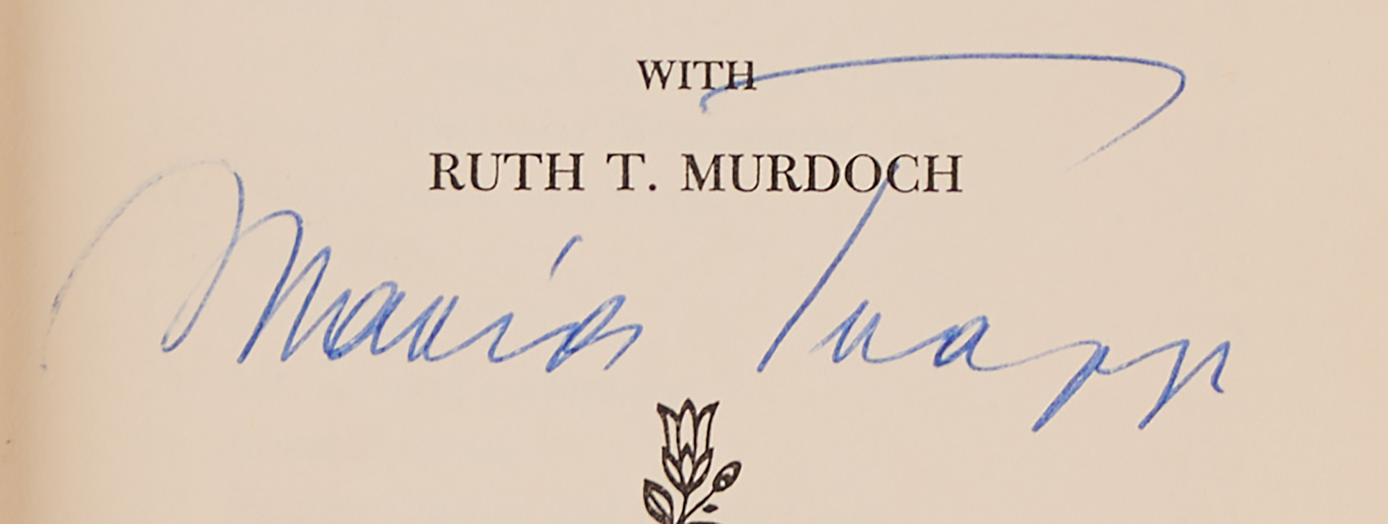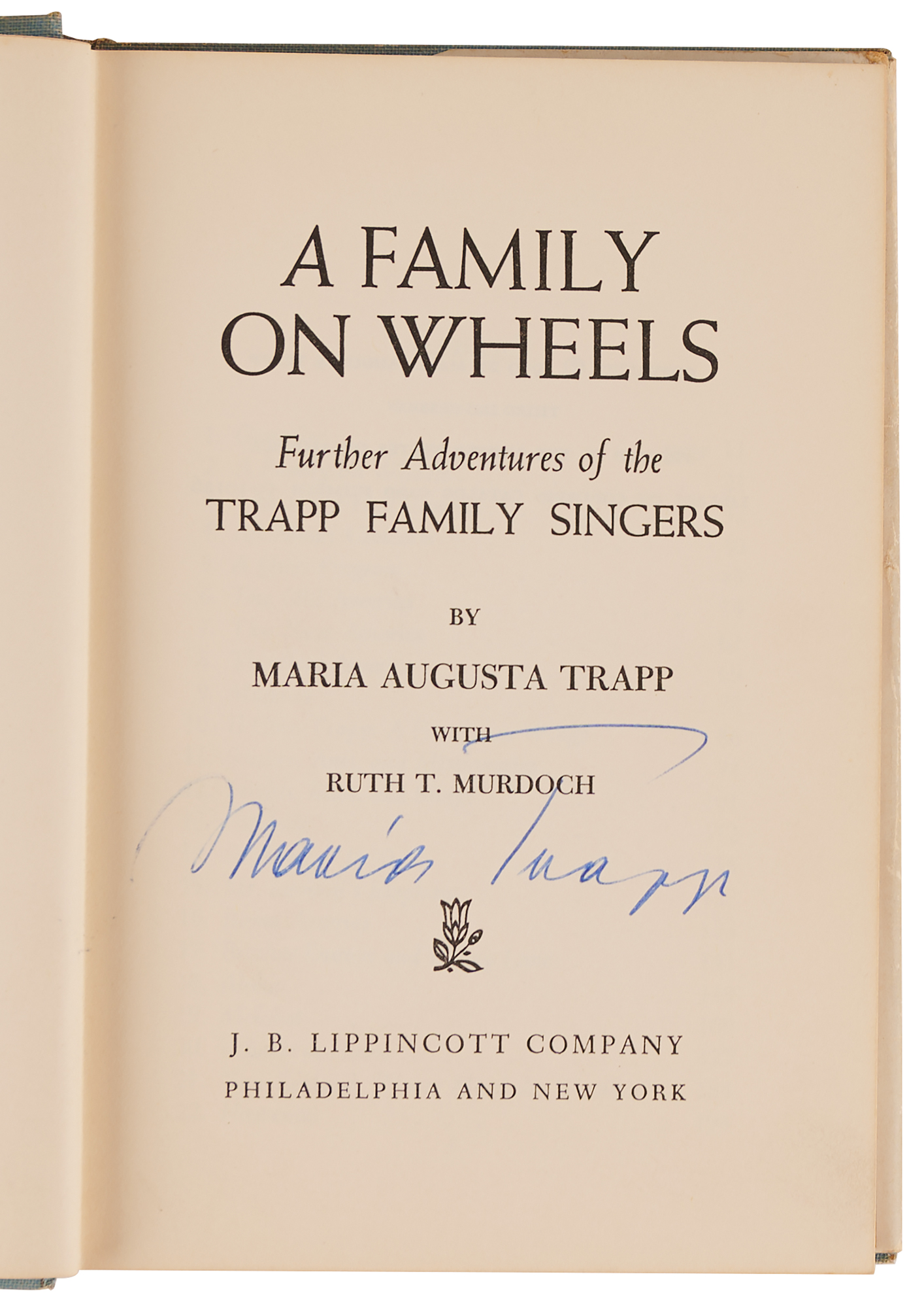 Signed book: A Family on Wheels: Further Adventures of the Trapp Family Singers. Later printing. Philadelphia: J. B. Lippincott, 1959. Hardcover with dust jacket, 5.5 x 8, 222 pages. Signed on the title page in blue ballpoint, "Maria Trapp." In fine condition, with light wear to the dust jacket.