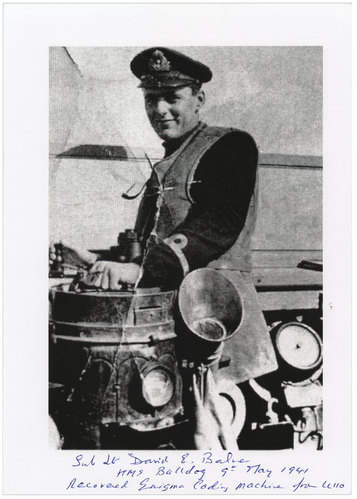 British naval hero (1920–2016) who led Operation Primrose in May 1941, a successful effort to capture German submarine U-110 with an intact Enigma machine and a wealth of signals intelligence, leading to the Allied breakthrough into cracking the German naval Enigma code. Cardstock 8.25 x 11.75 photo of the British naval officer on the bridge of HMS Bulldog, signed in the lower border in blue ballpoint, "Sub Lt. David E. Balme, HMS Bulldog, 9th May 1941, Recovered Enigma Coding Machine from U110." In very fine condition.
