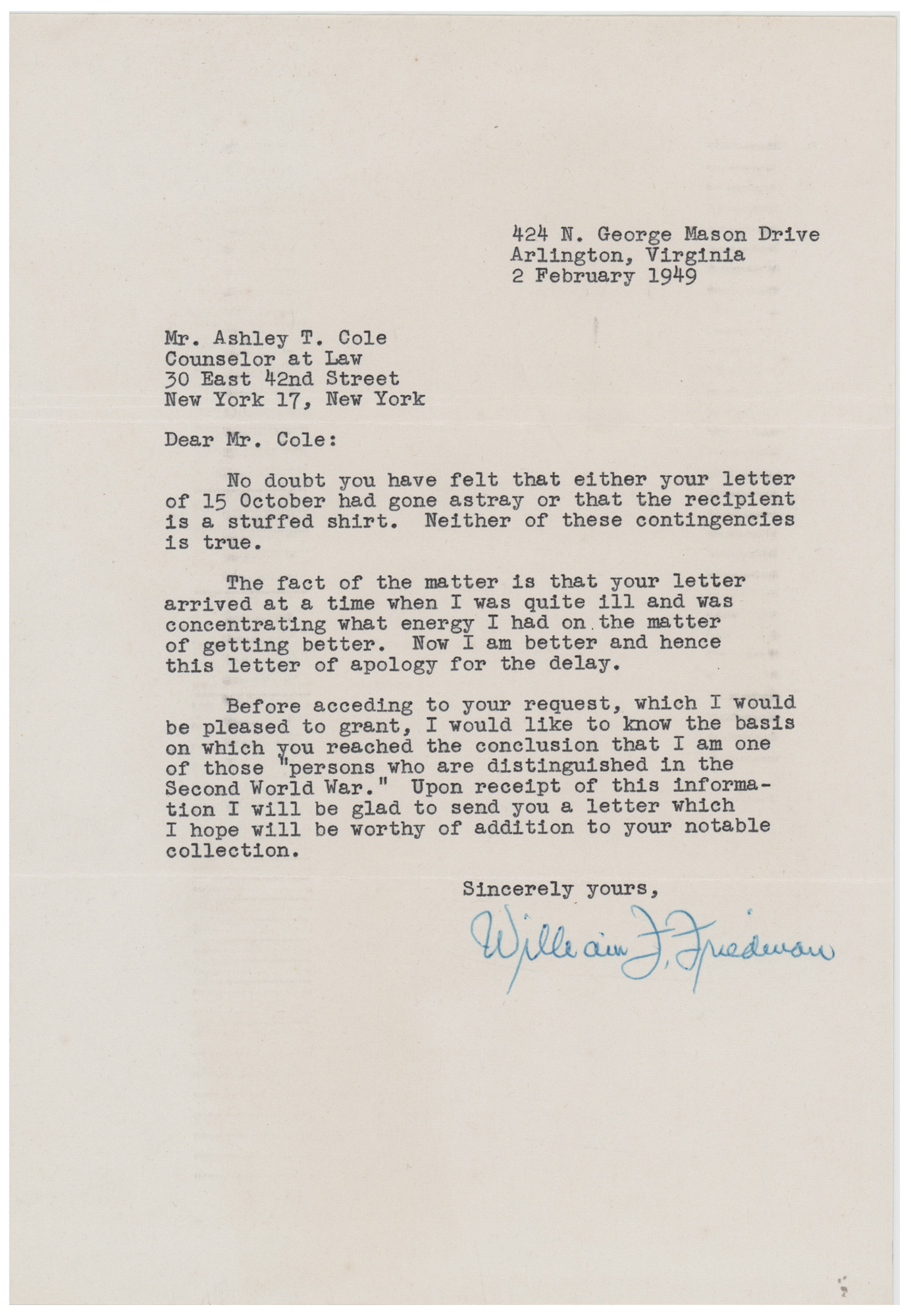 US Army cryptographer (1891–1969) who ran the research division of the Army's Signal Intelligence Service (SIS) in the 1930s. In 1940, Friedman and Frank Rowlett led a team that broke Japan's PURPLE cipher, thus disclosing Japanese diplomatic secrets before America's entrance into World War II. TLS signed “William F. Friedman,” one page, 7.25 x 10.5, February 2, 1949. Letter to Ashley T. Cole, in part: "No doubt you have felt that either your letter of 15 October had gone astray or that the recipient is a stuffed shirt. Neither of these contingencies is true. The fact of the matter is that your letter arrived at a time when I was quite ill and was concentrating what energy I had on the matter of getting better. Now I am better and hence this letter of apology for the delay. Before acceding to your request, which I would be pleased to grant, I would like to know the basis on which you reached the conclusion that I am one of those 'persons who are distinguished in the Second World War.' Upon receipt of this information I will be glad to send you a letter which I hope will be worthy of addition to your notable collection." In fine condition. Accompanied by the original mailing envelope.
