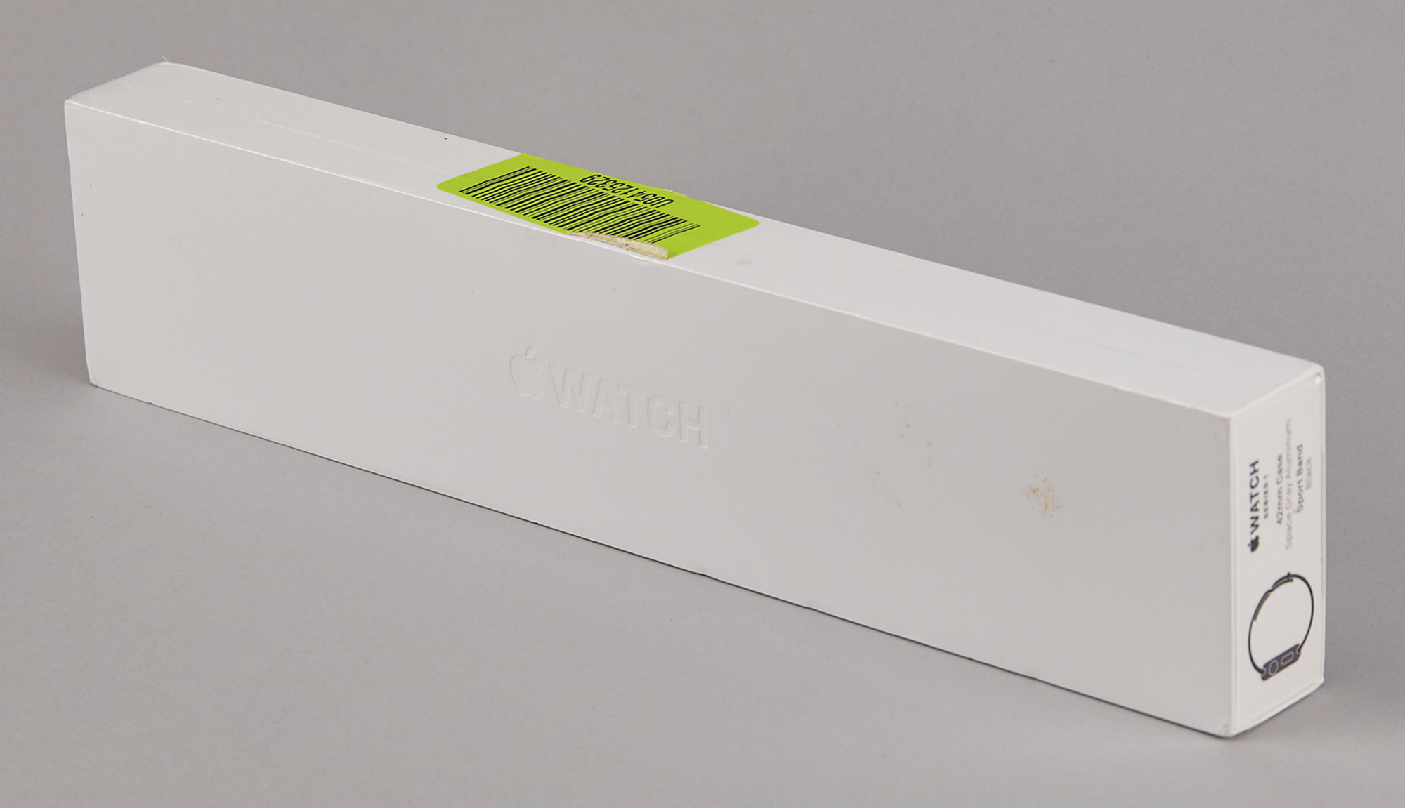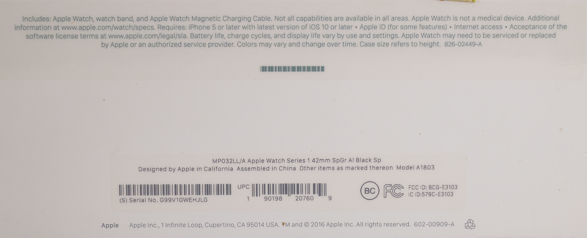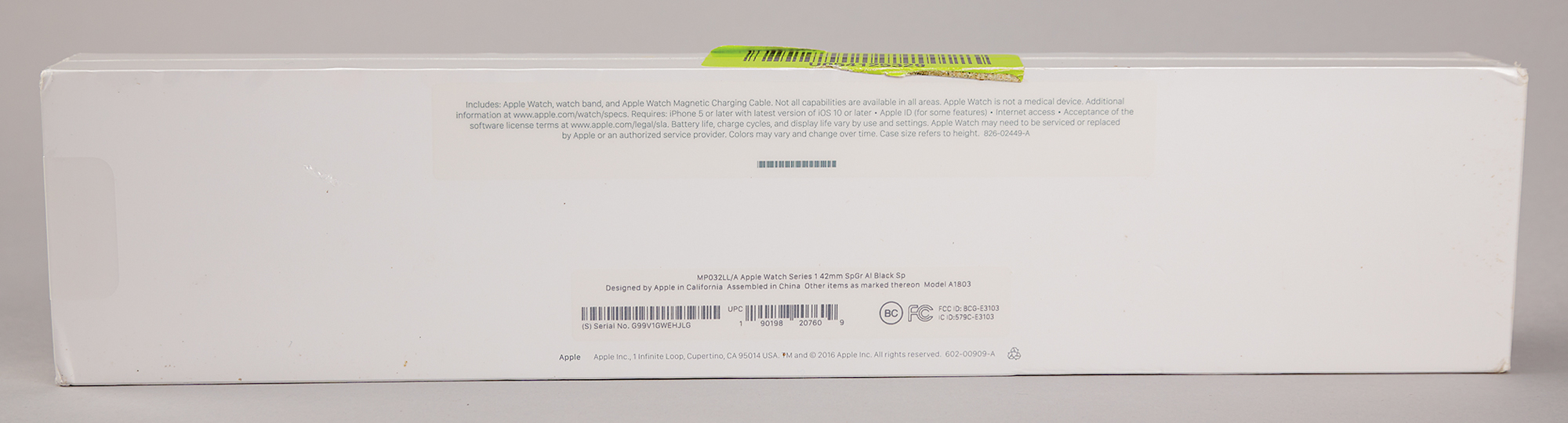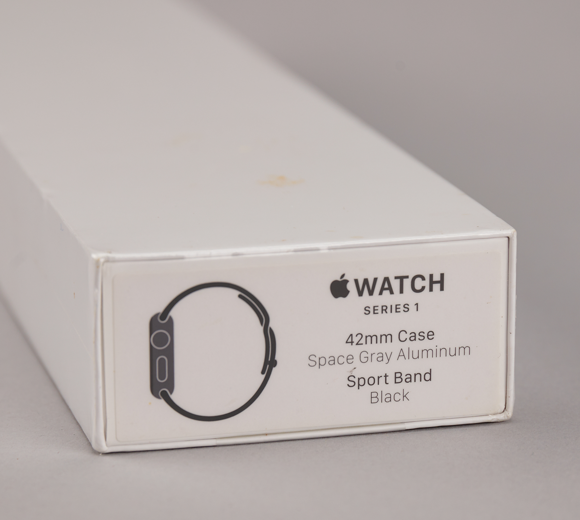 Unopened Series 1 Apple Watch (42mm, space gray), Model A1803, Part No. MP032LL/A, Serial No. G99V1GWEHJLG. The all-white box features a simple embossed design to the top, “[Apple logo] Watch,” with a label to the right end, and specifications to the underside of the box. In brand new, factory-sealed condition.