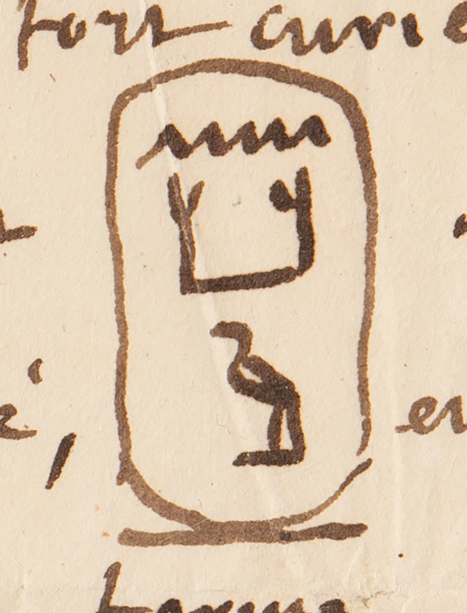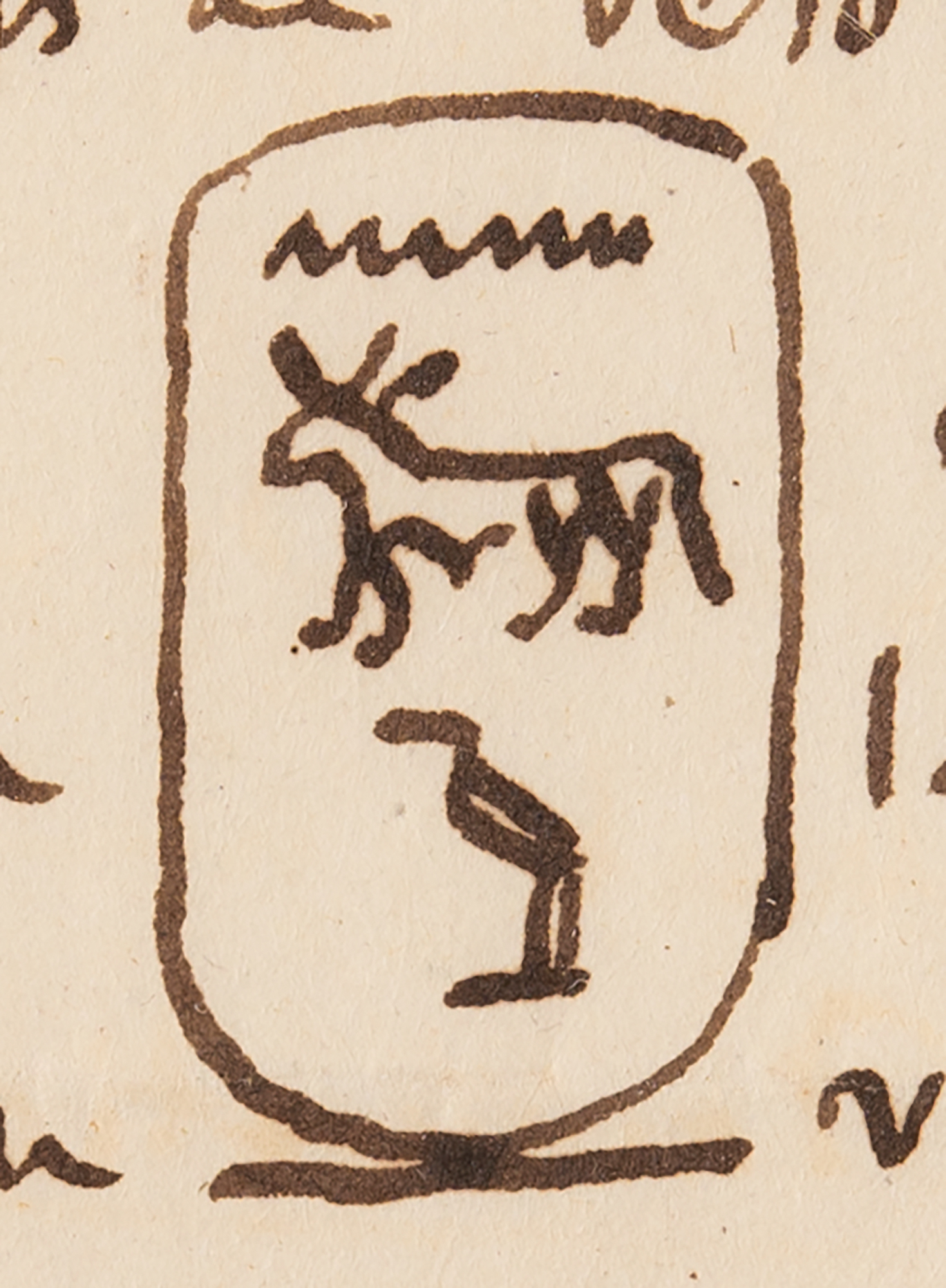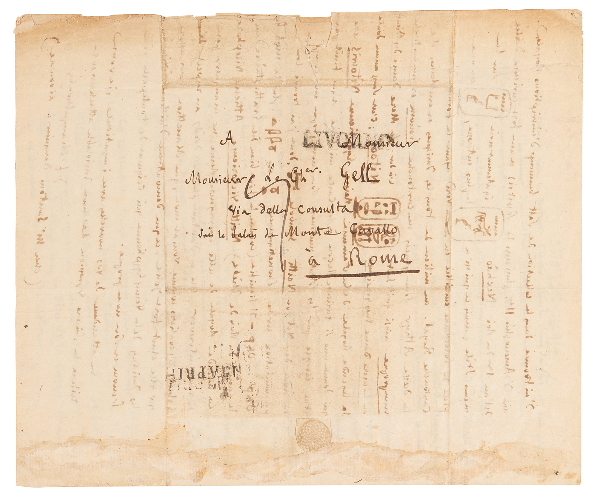 It was in Turin, where I arrived on the 15th of this month (returning from a short trip I made to France), that I received your kind letter of January 27th. And it is from Livorno that I answer it in the middle of the beautiful Egyptian collection of Mr. Salt that I was charged with purchasing and sending to Paris for the Royal Museum of France; this acquisition, which is due in large part to the influence of Mr. Le Duc de Blacas, has filled me with joy as you can imagine: I find in this museum treasures in abundance, superb papyri, whether hieroglyphic, hieratic, or demotic, steles of the greatest beauty and, in fact, the centerpiece, the sarcophagus of King Ramses-Meiamoun [Hieroglyphs] grandfather of Sesostris. It is an intact mass 10 feet long by 5 1/2 high, covered inside and out with bas-reliefs and inscriptions. This sarcophagus, the lid of which you have in Cambridge, is made of pink granite and of a single block. The collection is extremely rich in objects of all kinds. I am cashing it in right now and will have finished packing it by the end of April. I therefore expect to be in Rome around the 15th of May. Will I be lucky enough to find you there at that time? It would be a great mortification for me if you were absent when I arrive at the foot of the Quirinal. Please write me a line to confirm the hope of meeting you in old Babylon.