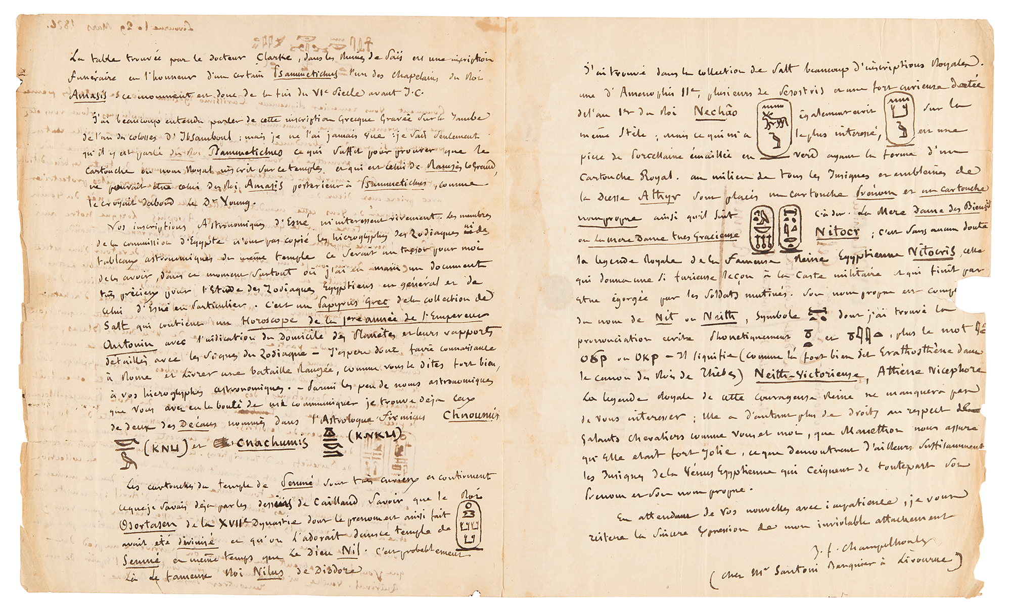 I found in the Salt collection many royal inscriptions. One of Amenhotep II, several of Sesostris and a very curious one dated the first year of King Nechao [H] also written [H] on the same stele; but what interested me most was a porcelain stone enameled in verd [sic] in the form of a Royal cartouche. In the middle of all the insignia and emblems of the goddess Athyr are placed a first name cartouche and a proper name cartouche as follows [H] That is to say the mother lady of Benefits or the very gracious mother lady Nitocr: this is without a doubt the royal legend of the famous Egyptian Queen Nitocris, the one who gave such a furious lesson to the military caste and who ended up being slaughtered by the mutinous soldiers. His proper name is composed of the name of Nit or Neith, symbol [H] whose pronunciation I found written phonetically [H] and [H] plus the word [H] [H]." Addressed on the integral leaf in Champollion's hand. In very good to fine condition, with a small area of seal-related paper loss (and associated tear) to last page, affecting a couple of words of text.