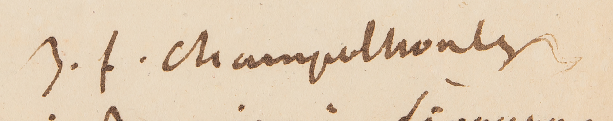 French scholar and founding figure in the field of Egyptology (1790–1832) who published the first translation of the Rosetta Stone hieroglyphs in 1822. ALS in French, signed "J. F. Champollion," three pages on two adjoining sheets, 8.25 x 10, March 29, 1826. Handwritten letter to the archaeologist William Gell, discussing his acquisition of Henry Salt's collection of Egyptian antiquities for the Louvre; remarkably, he fills the letter with about fifteen hieroglyphic inscriptions. In full (translated): "How can I thank you properly, dear Egyptian, for all the trouble you take to share with me the hieroglyphic riches with which you are so abundantly endowed! I can only send you a thousand acts of gratitude, and promise to erect for you a stele of gratitude on which your name will be inscribed in sacred characters, accompanied by all the blessings, with a prayer to the gods of 62 regions, to cover you with their protective wings to ward off this cursed drop, daughter of Typhon, born from the venom spread across the earth by the great serpent Apophis when our friend Soou (the Egyptian Hercules) had the good sense to rid the world of it.