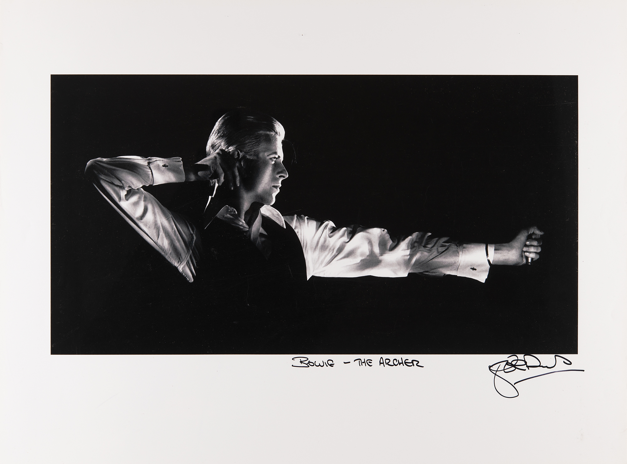 Satin-finish 24 x 18 silver gelatin photograph by John Rowlands entitled “Bowie – The Archer,” which depicts David Bowie in half-length profile pretending to hold a bow, his right hand pulling back on an invisible string and his left hand holding a microphone, signed and titled in the lower border in black felt tip by the photographer. Rolled and in very good to fine condition, with scattered creases over the image, one affecting Bowie's face.