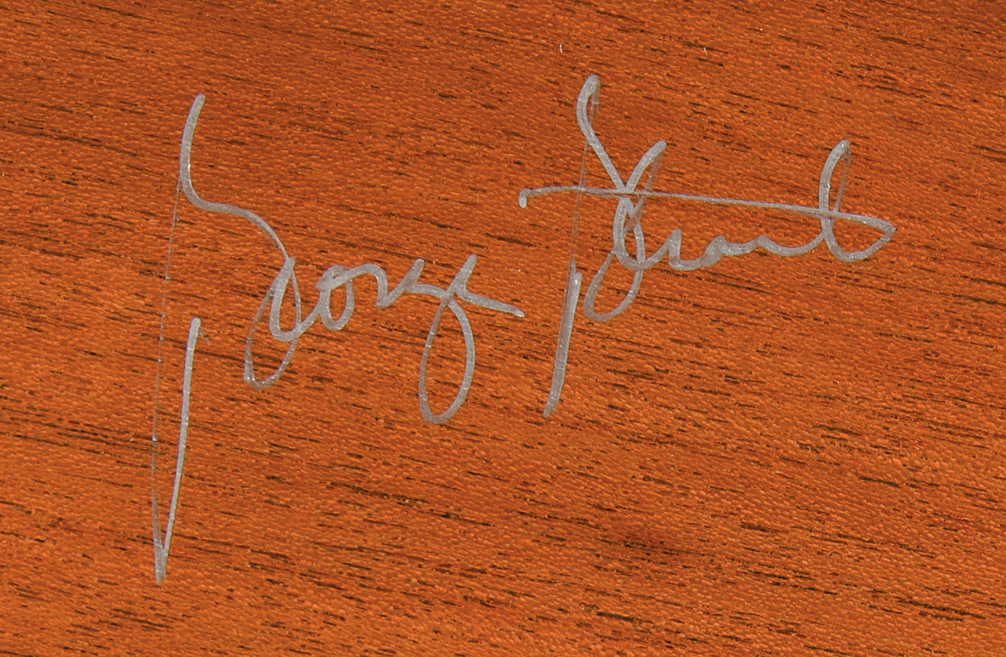 Guild True American D4 acoustic guitar with a hand-rubbed mahogany finish, serial no. AD402538, signed on the body in silver ink by George Strait. In very fine condition. Accompanied by a Guild hardshell case. A handsome, USA-made guitar signed by the 'King of Country.'