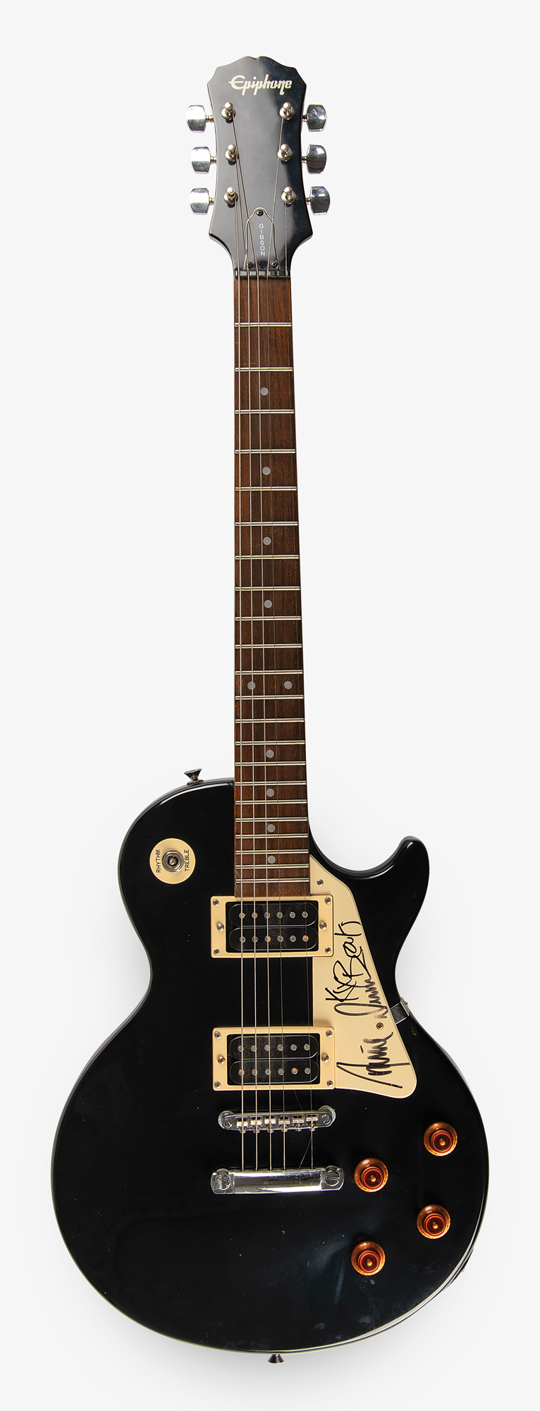 Epiphone LP100 Les Paul–style electric guitar with a black glossy finish, signed on the pickguard in black felt tip by Kix Brooks and Ronnie Dunn. In fine condition, with some rubbing to the ink. Accompanied by an Epiphone gig bag.