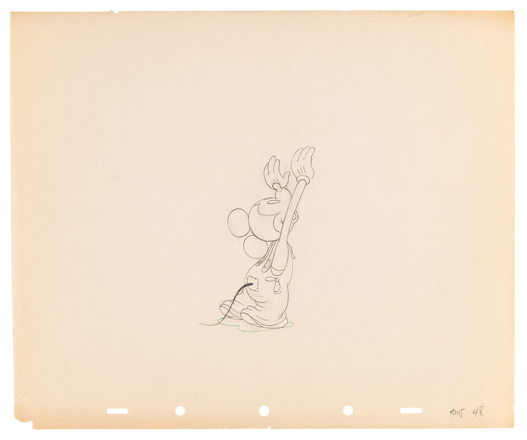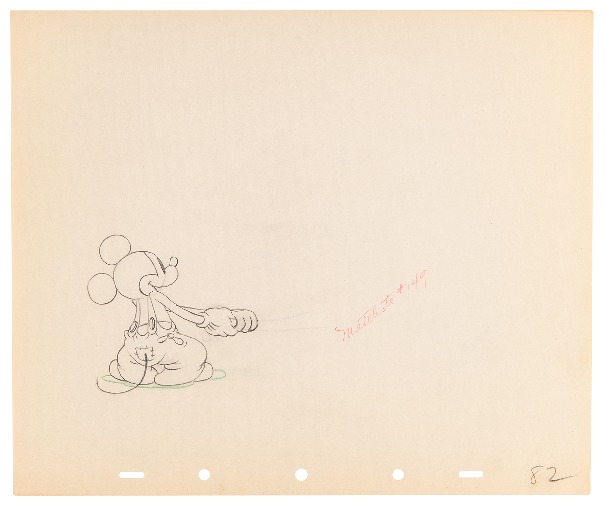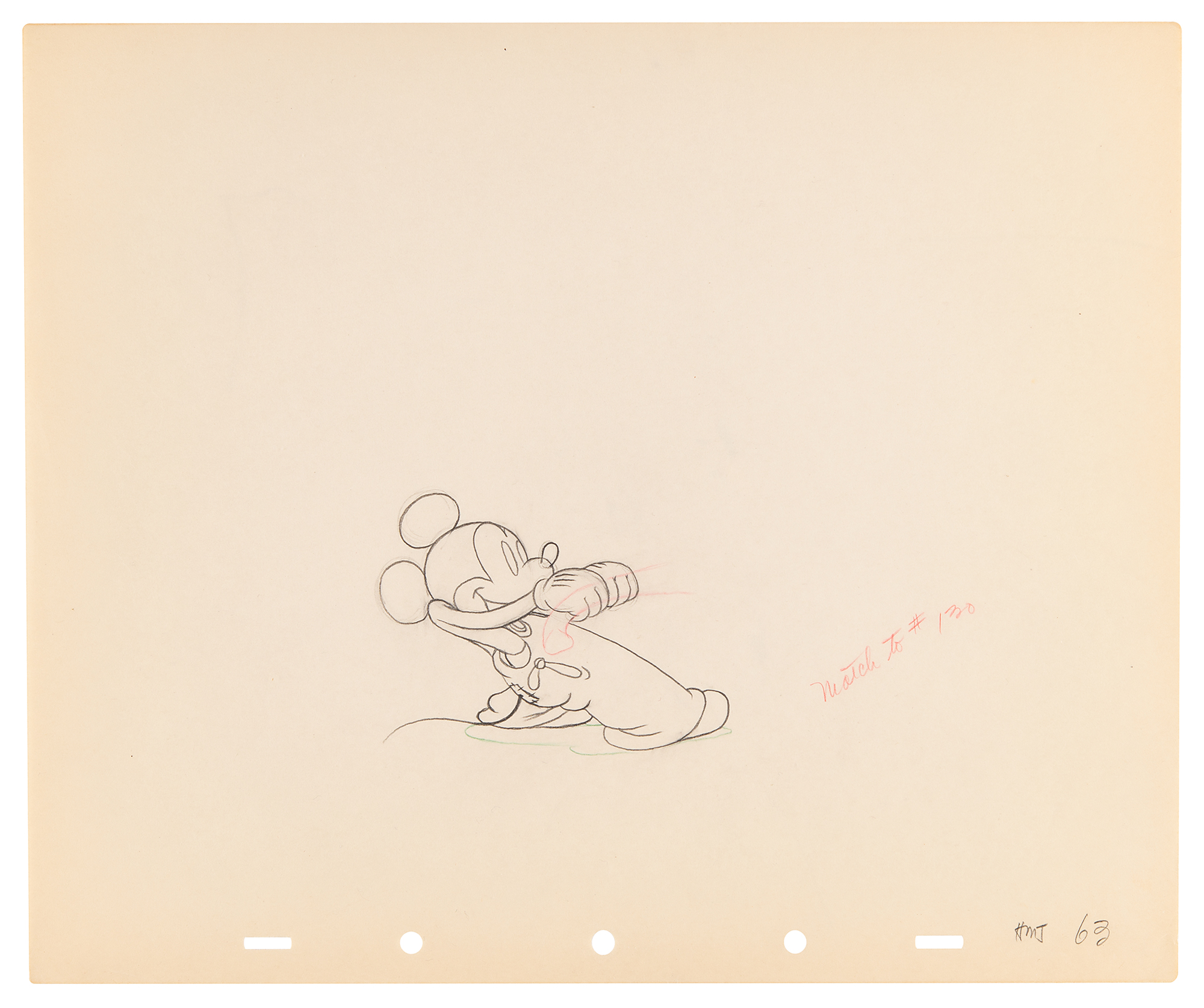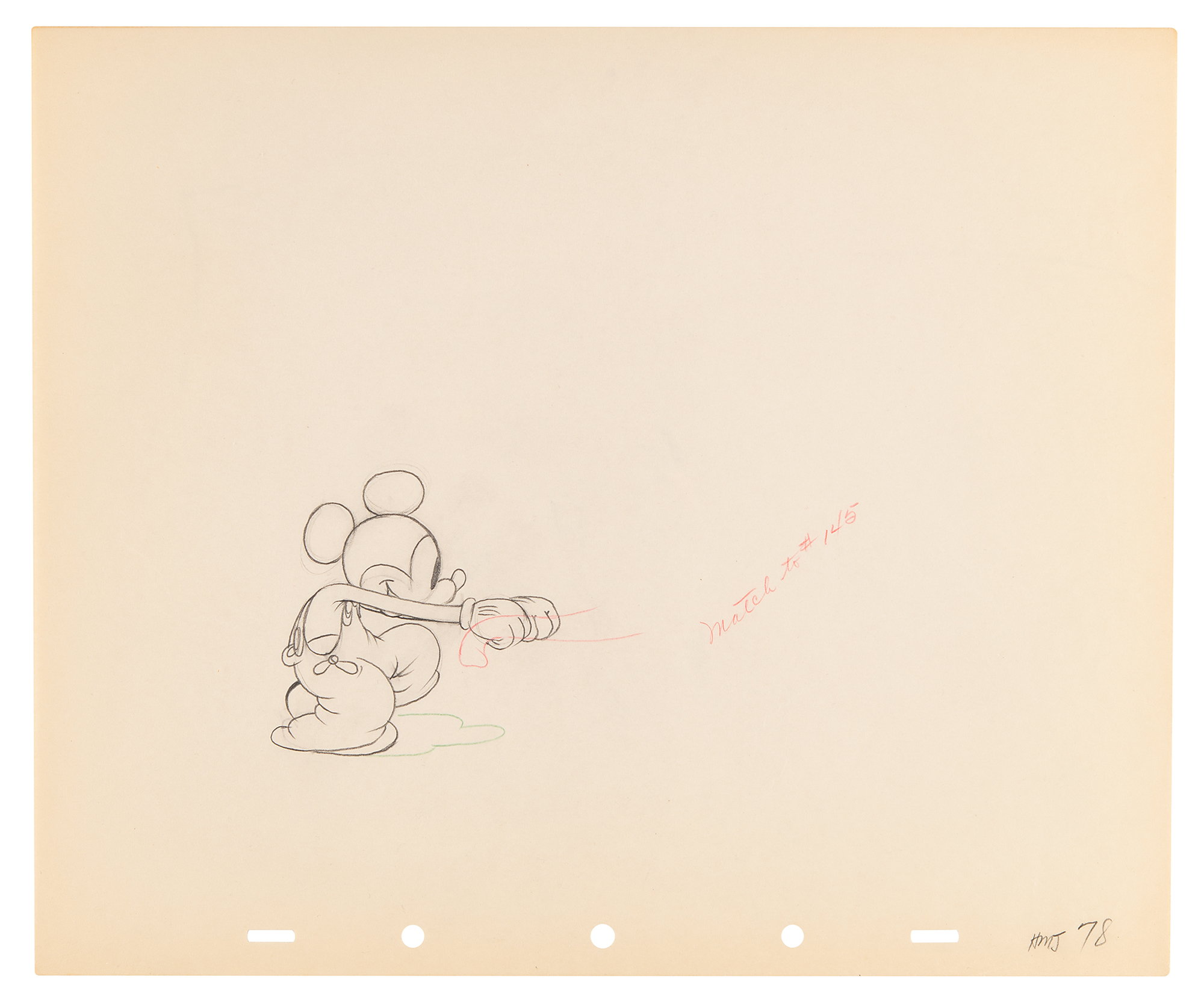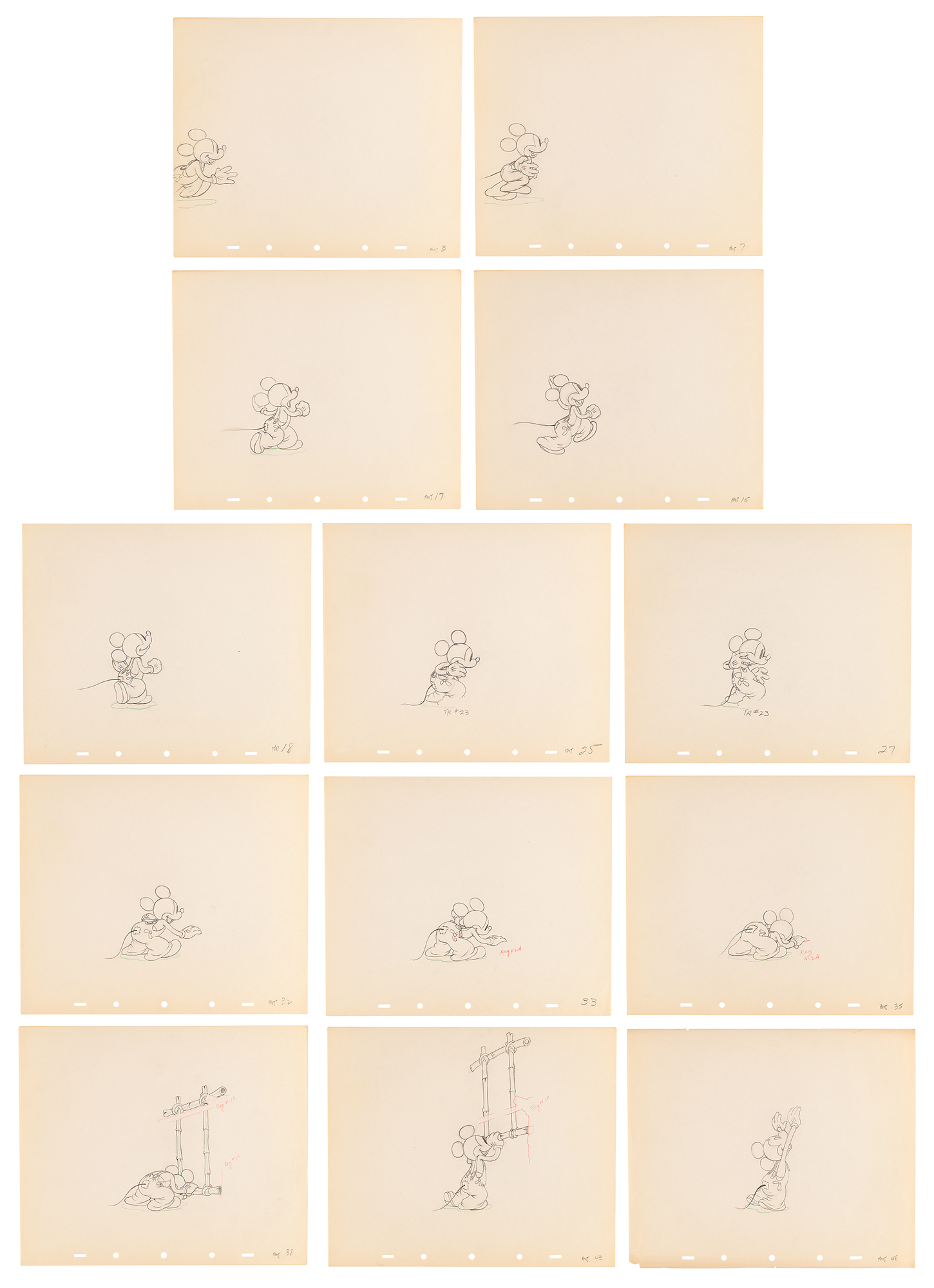 (Walt Disney Studios, 1936) Amazing collection of 26 original production drawings featuring Mickey Mouse from Mickey's Elephant, from the sequence where the Mickey first runs up to the baby elephant's cage, raises the bamboo gate, and coaxes the elephant out by pulling its trunk; in several drawings, the placement of the trunk is outlined in red. Accomplished in graphite and colored pencil on untrimmed 12 x 10 animation paper. Images measure from 2.5 x 3 to 4 x 7.5. In overall fine condition. Mickey Mouse production drawings are highly sought on their own?rarely are so many from a single sequence offered as a single collection.