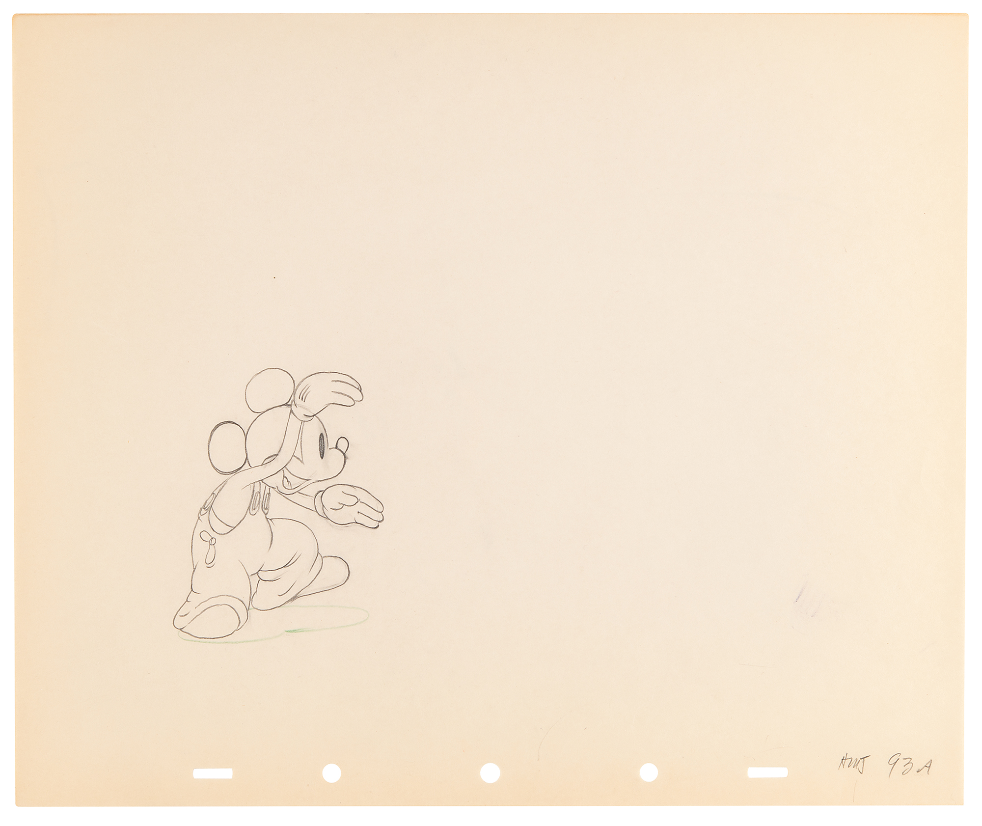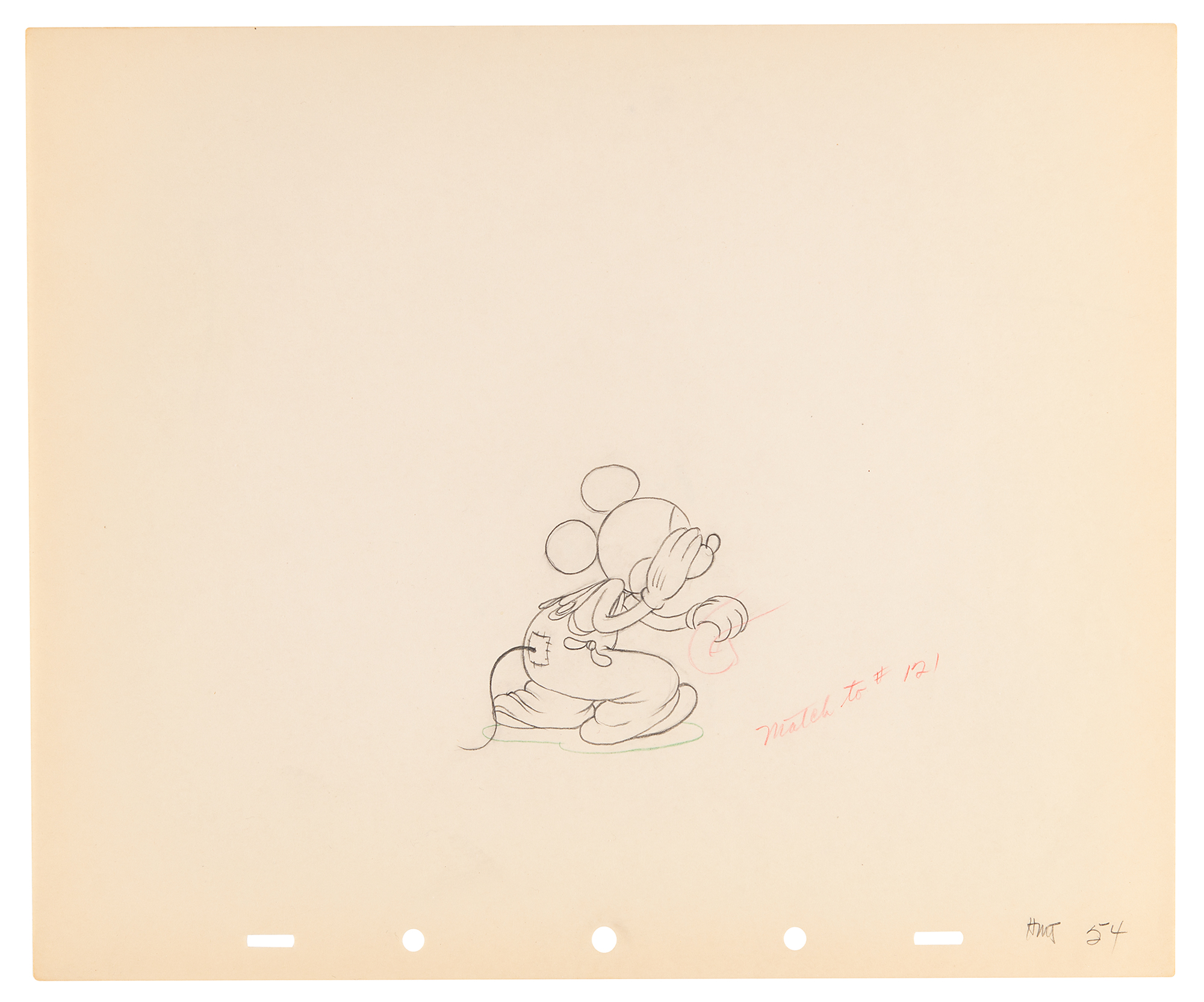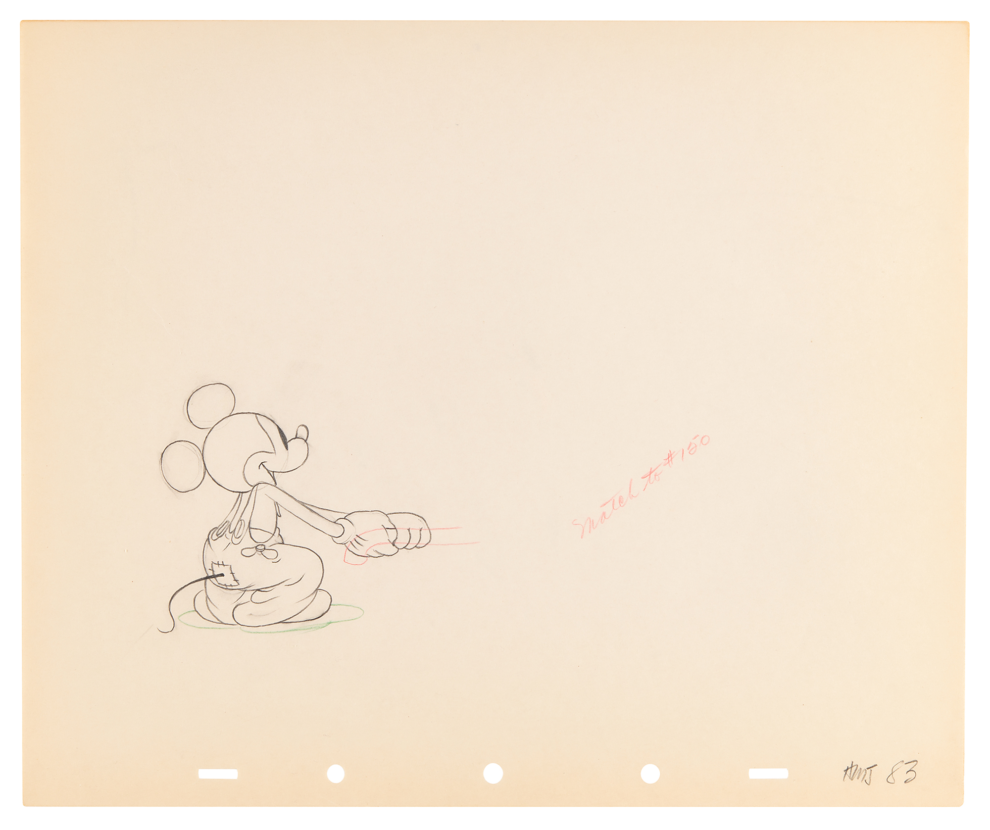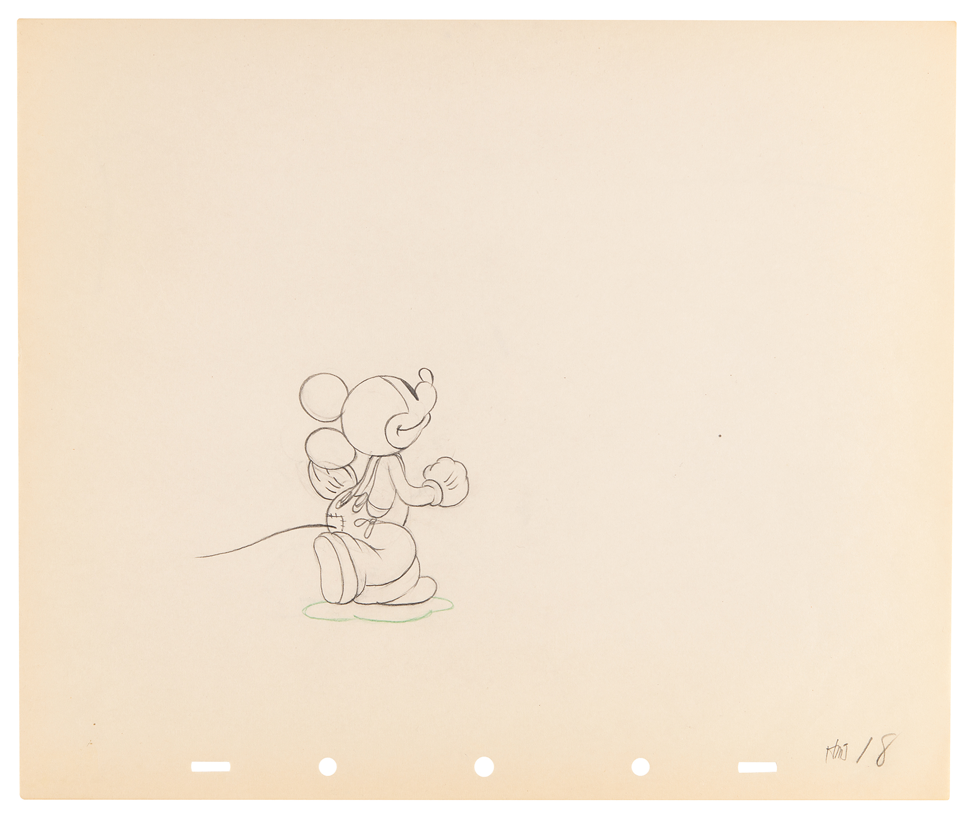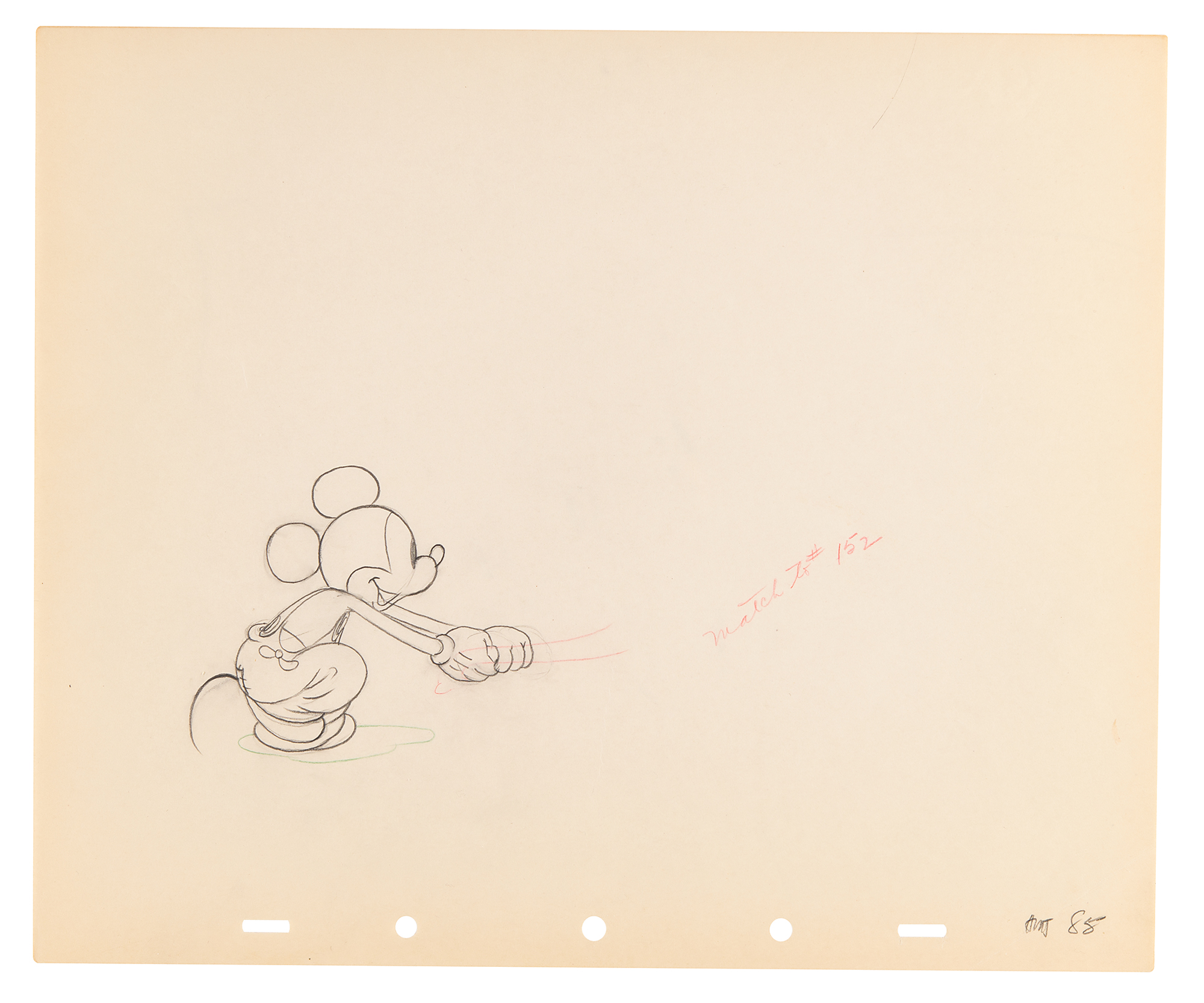 (Walt Disney Studios, 1936) Amazing collection of 26 original production drawings featuring Mickey Mouse from Mickey's Elephant, from the sequence where the Mickey first runs up to the baby elephant's cage, raises the bamboo gate, and coaxes the elephant out by pulling its trunk; in several drawings, the placement of the trunk is outlined in red. Accomplished in graphite and colored pencil on untrimmed 12 x 10 animation paper. Images measure from 2.5 x 3 to 4 x 7.5. In overall fine condition. Mickey Mouse production drawings are highly sought on their own?rarely are so many from a single sequence offered as a single collection.