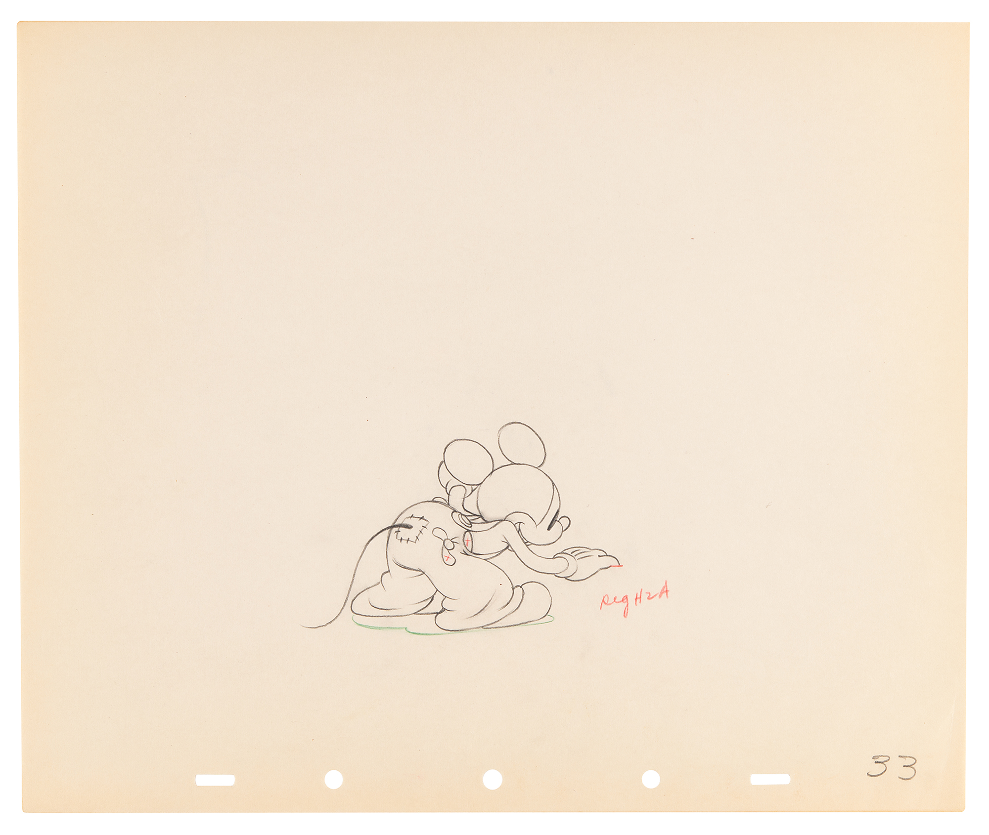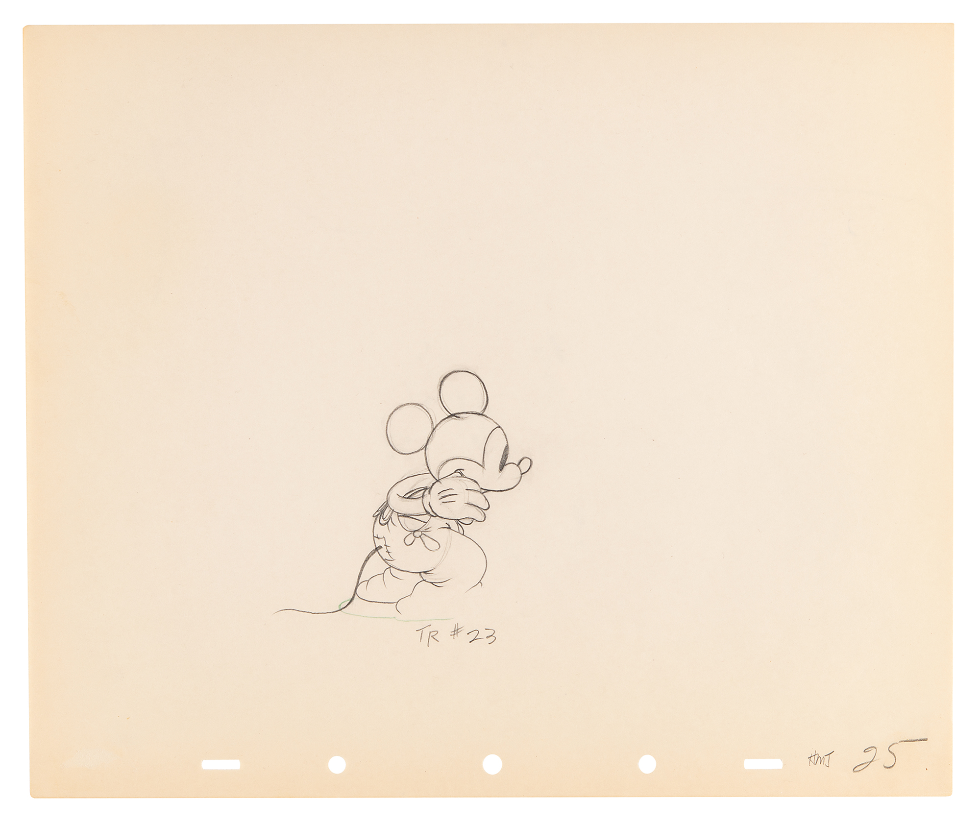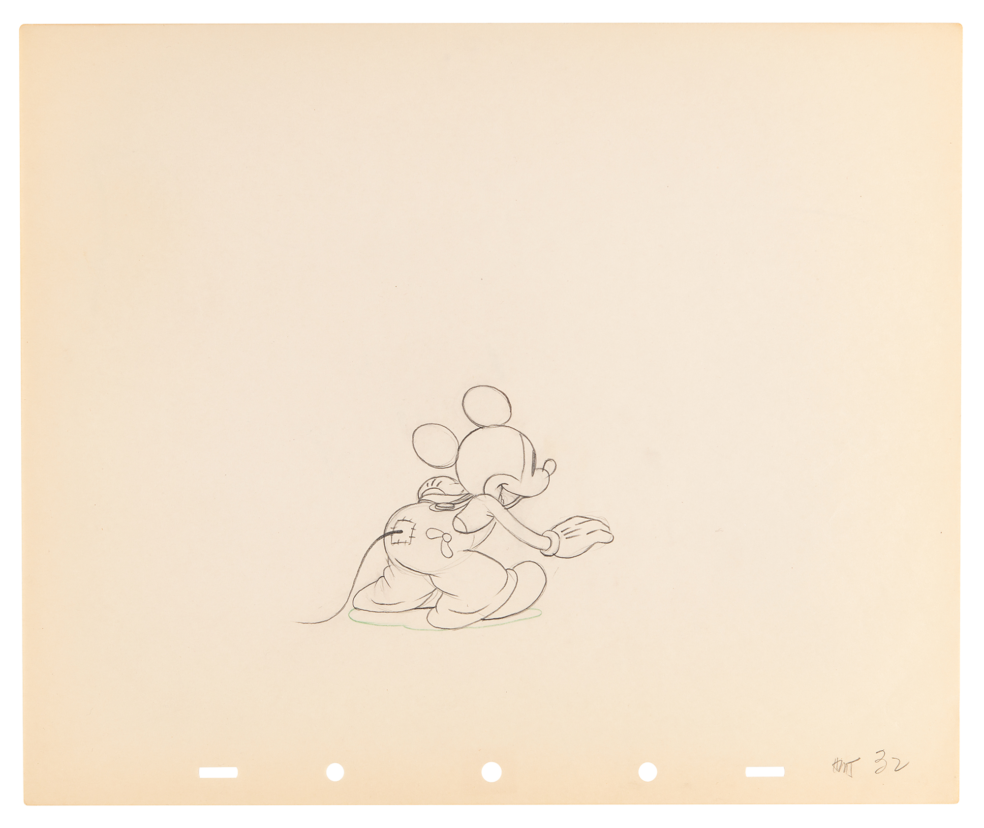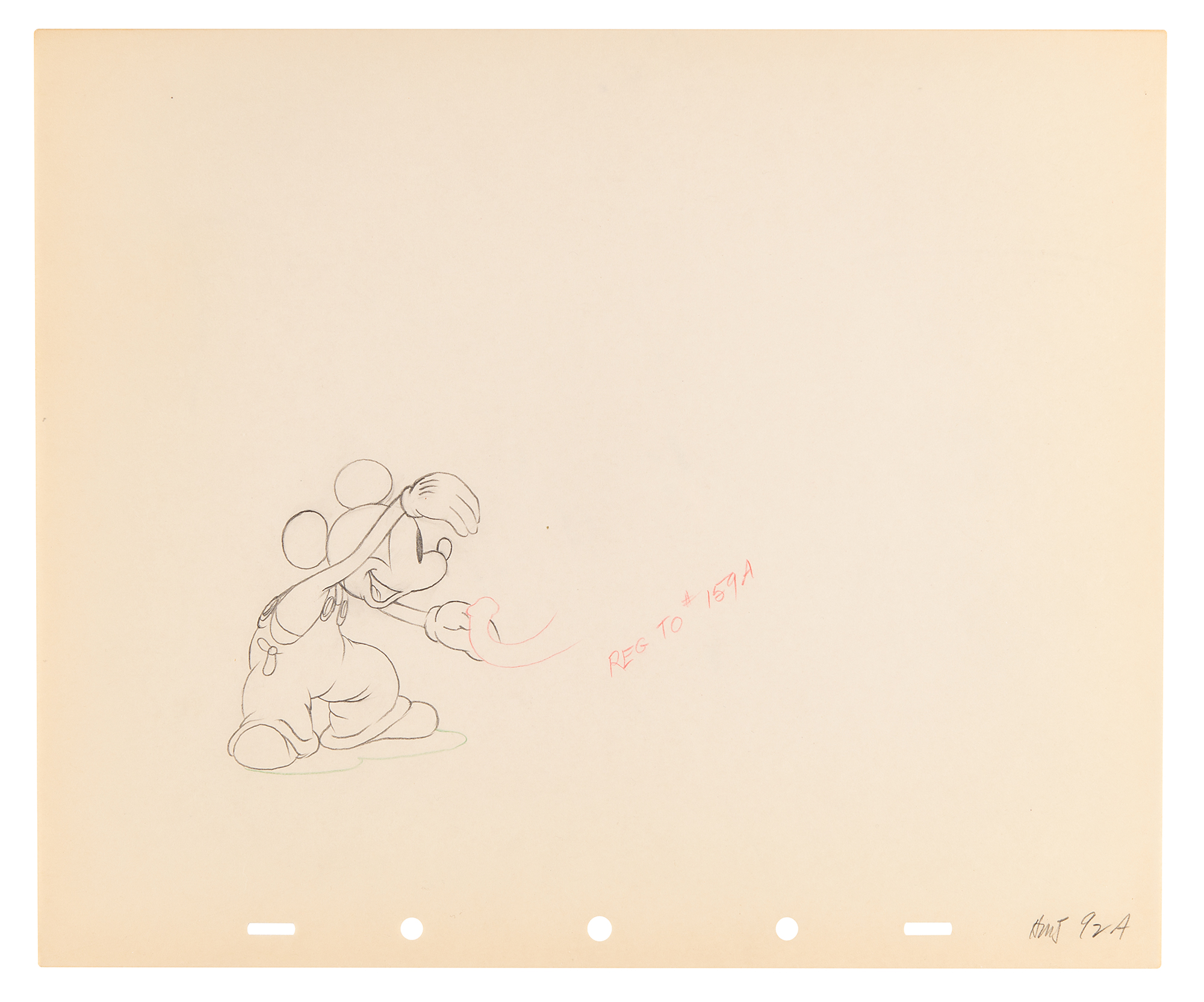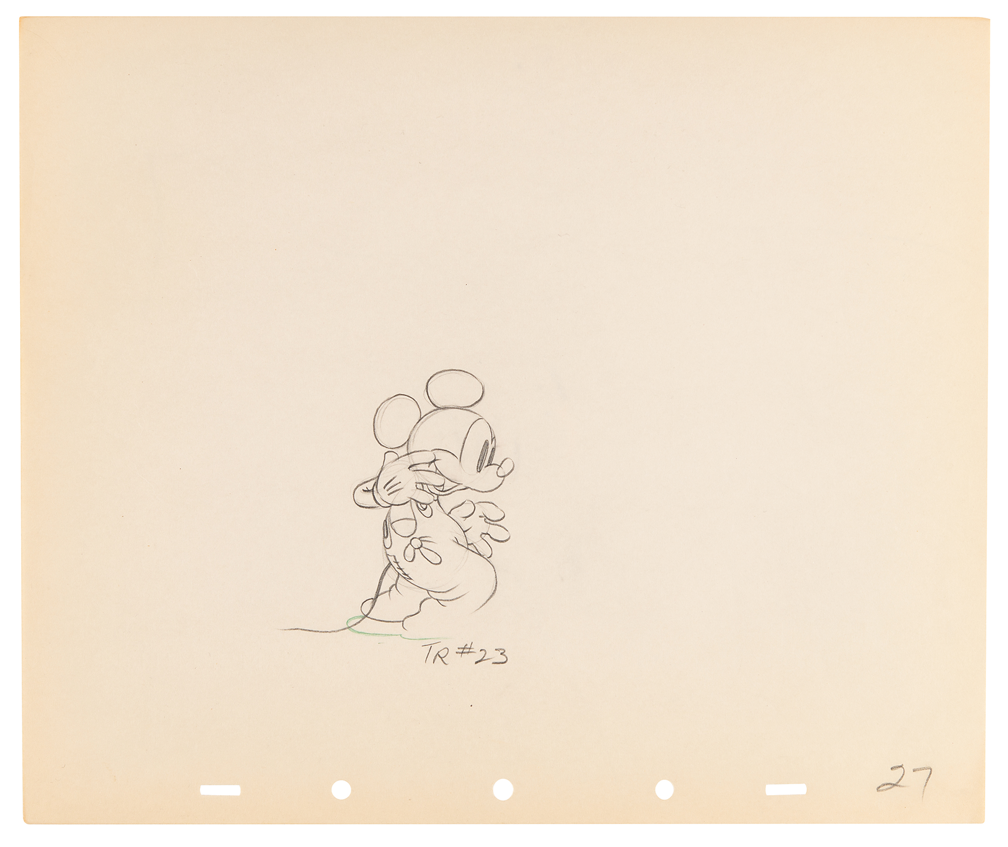 (Walt Disney Studios, 1936) Amazing collection of 26 original production drawings featuring Mickey Mouse from Mickey's Elephant, from the sequence where the Mickey first runs up to the baby elephant's cage, raises the bamboo gate, and coaxes the elephant out by pulling its trunk; in several drawings, the placement of the trunk is outlined in red. Accomplished in graphite and colored pencil on untrimmed 12 x 10 animation paper. Images measure from 2.5 x 3 to 4 x 7.5. In overall fine condition. Mickey Mouse production drawings are highly sought on their own?rarely are so many from a single sequence offered as a single collection.