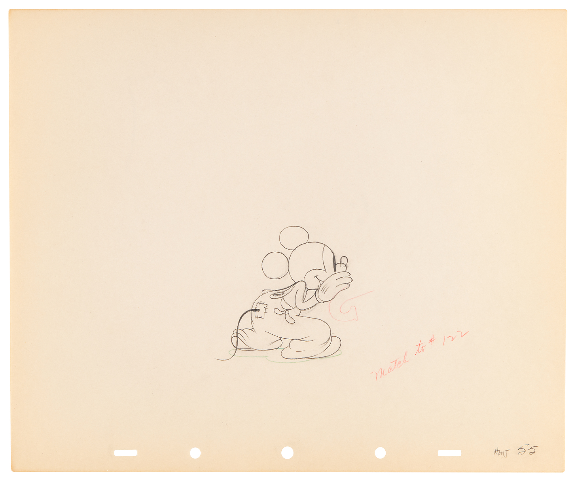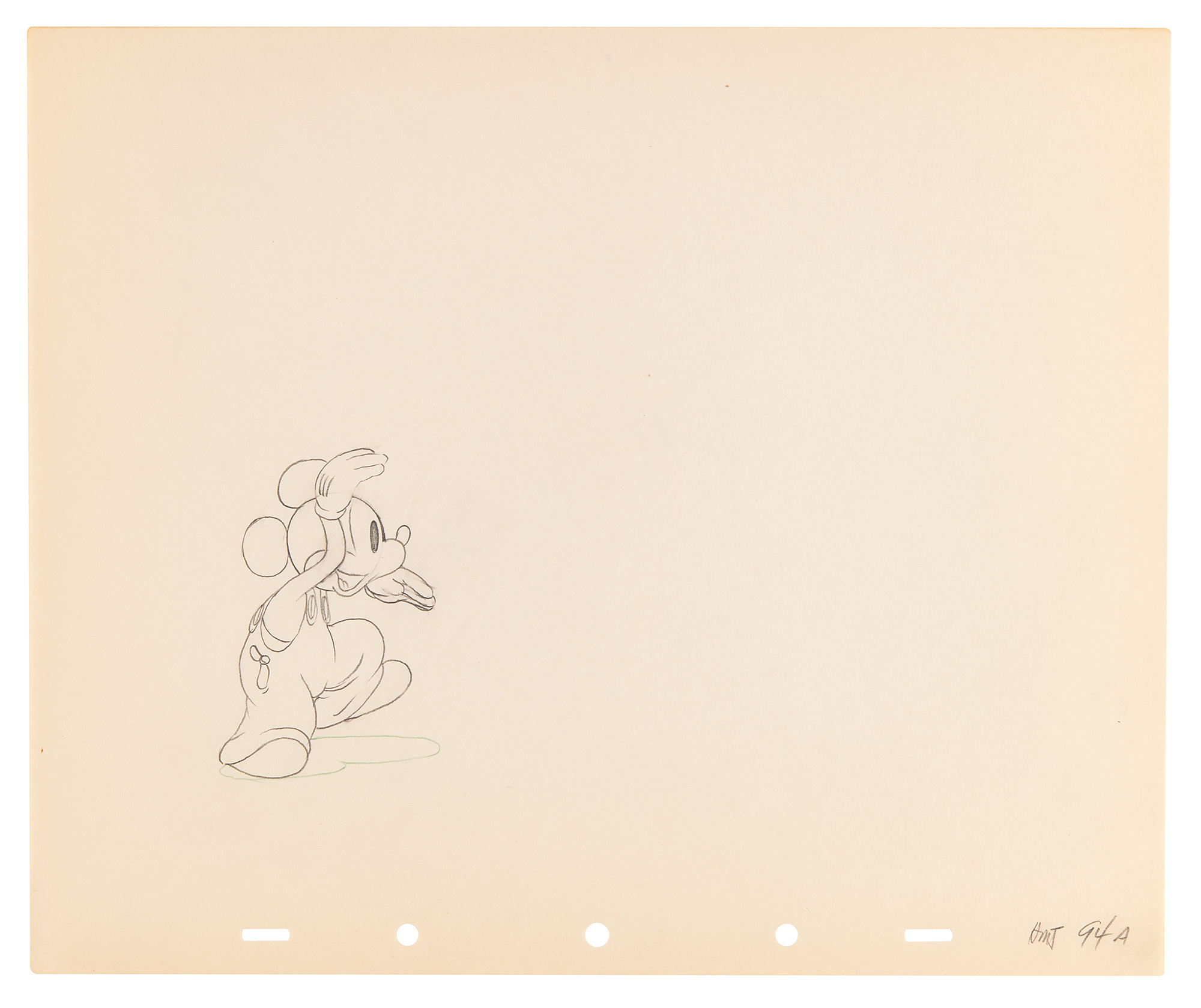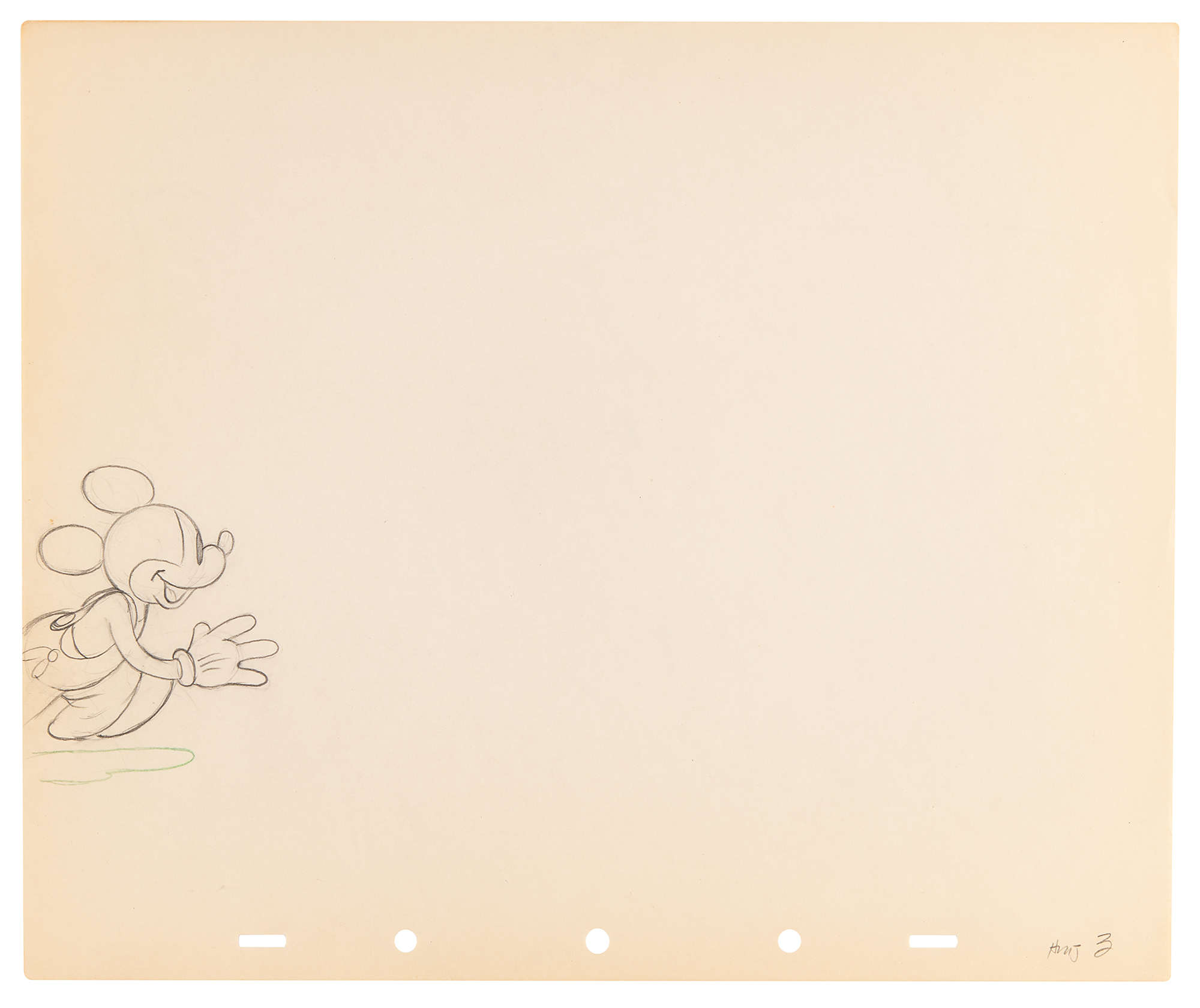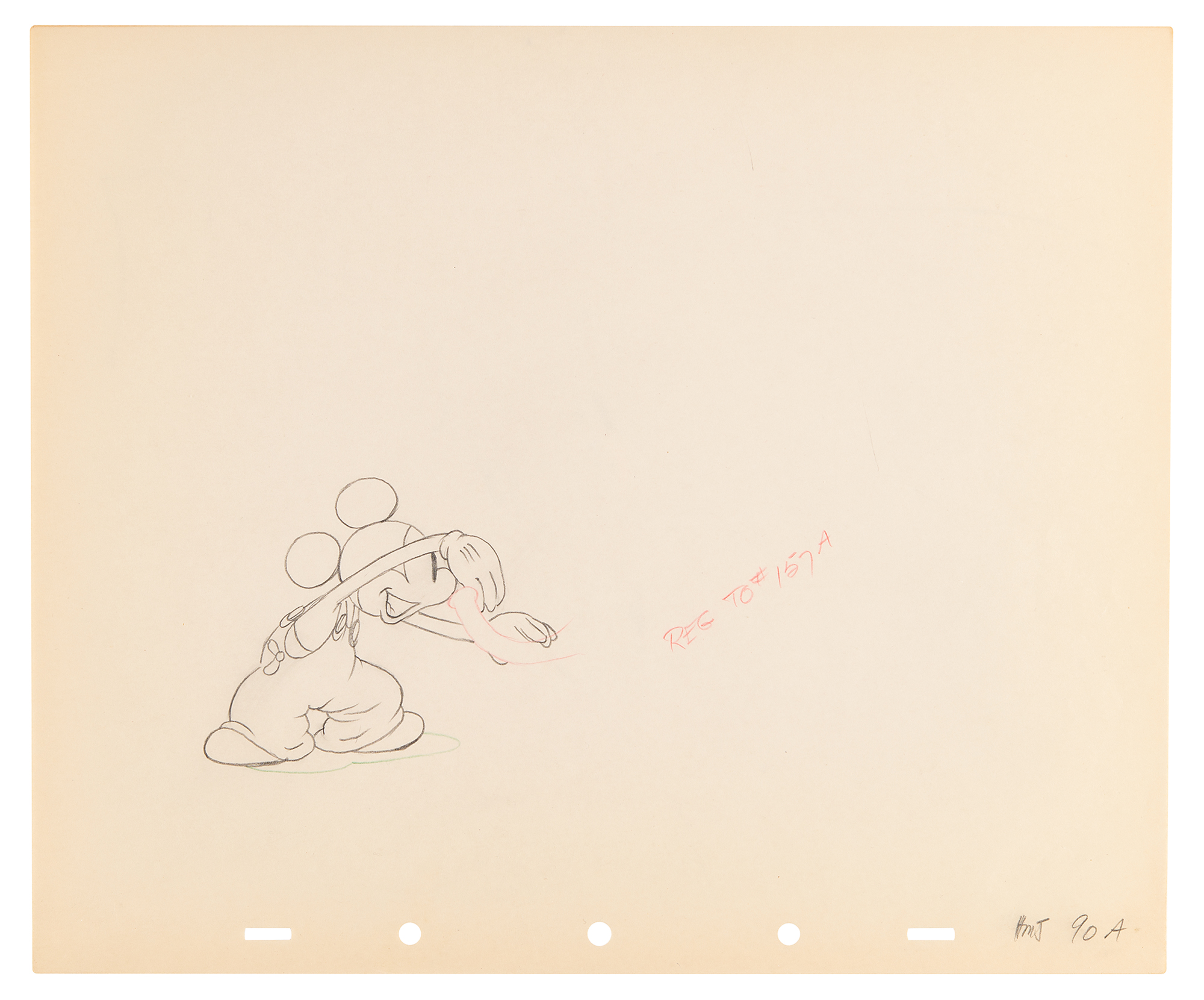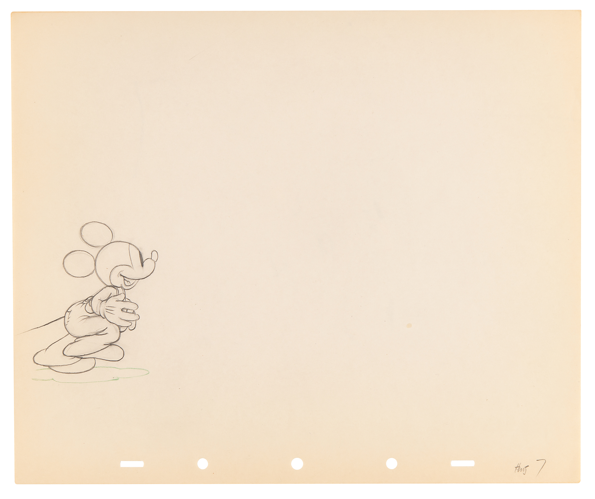 (Walt Disney Studios, 1936) Amazing collection of 26 original production drawings featuring Mickey Mouse from Mickey's Elephant, from the sequence where the Mickey first runs up to the baby elephant's cage, raises the bamboo gate, and coaxes the elephant out by pulling its trunk; in several drawings, the placement of the trunk is outlined in red. Accomplished in graphite and colored pencil on untrimmed 12 x 10 animation paper. Images measure from 2.5 x 3 to 4 x 7.5. In overall fine condition. Mickey Mouse production drawings are highly sought on their own?rarely are so many from a single sequence offered as a single collection.