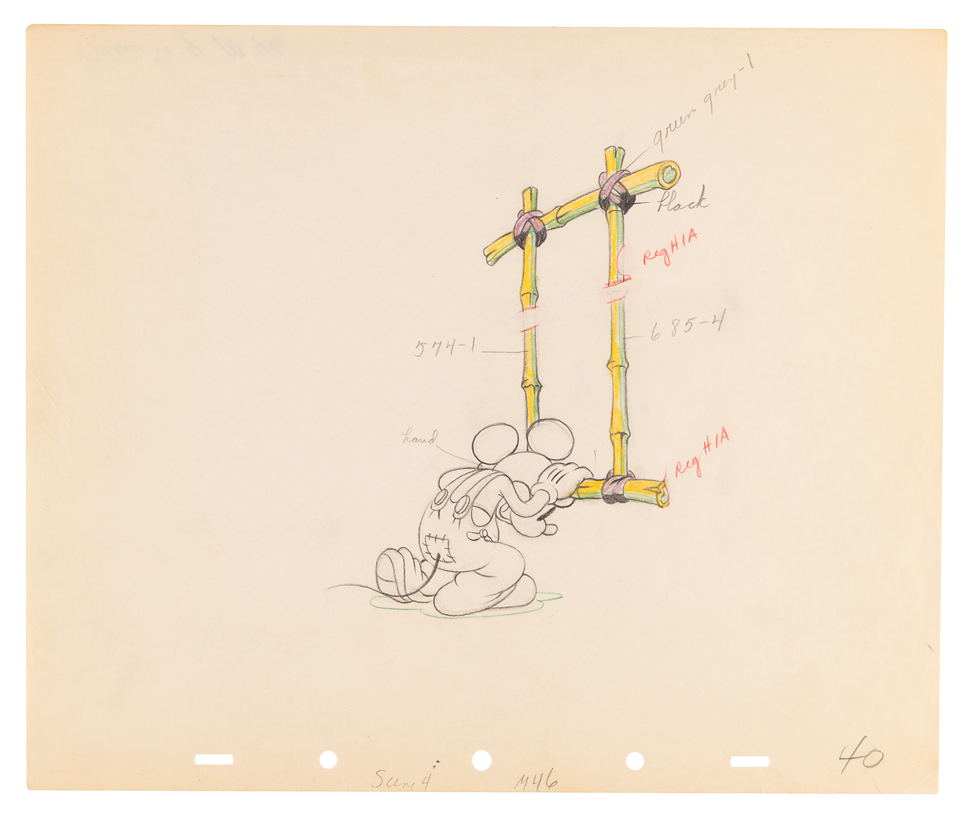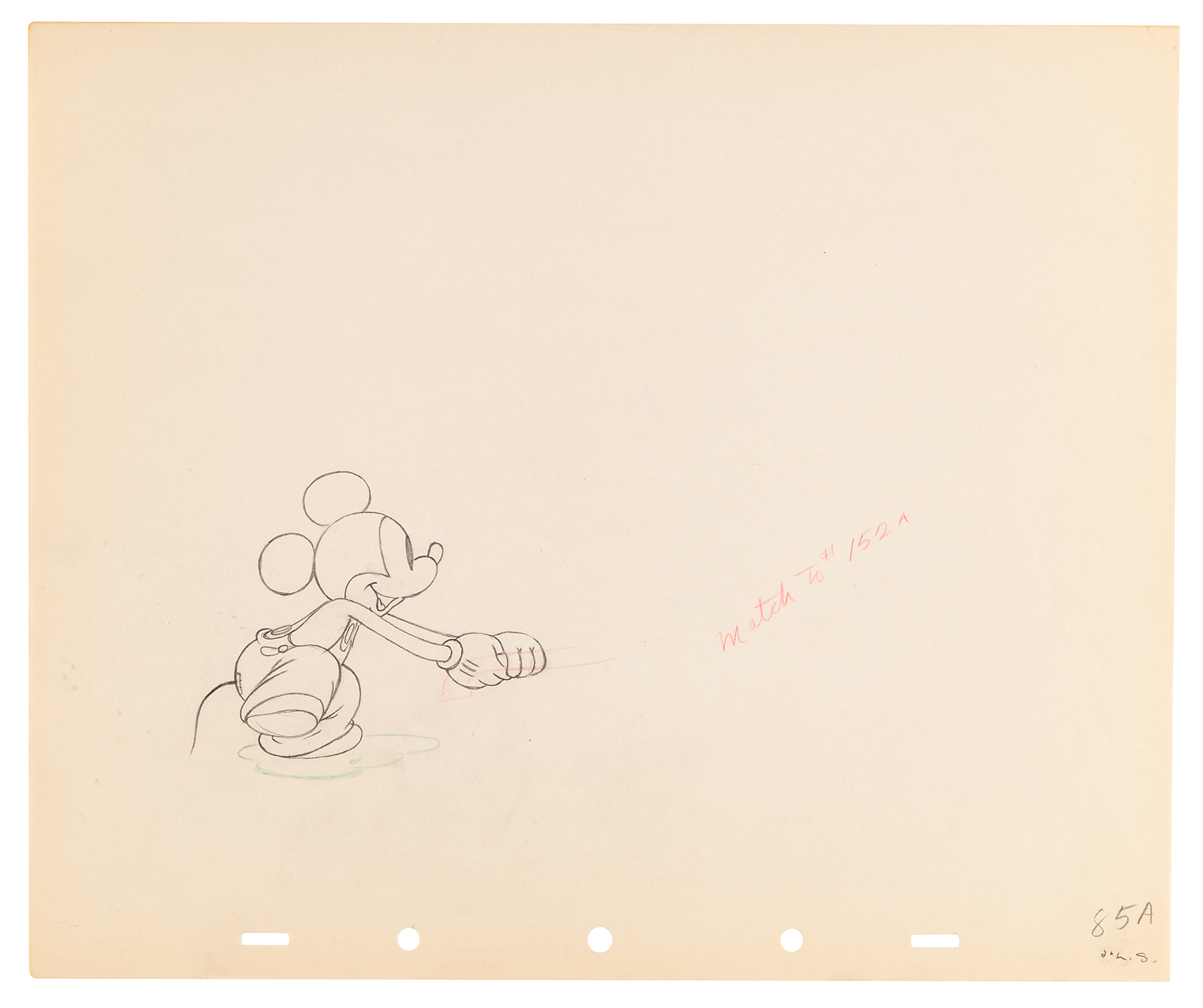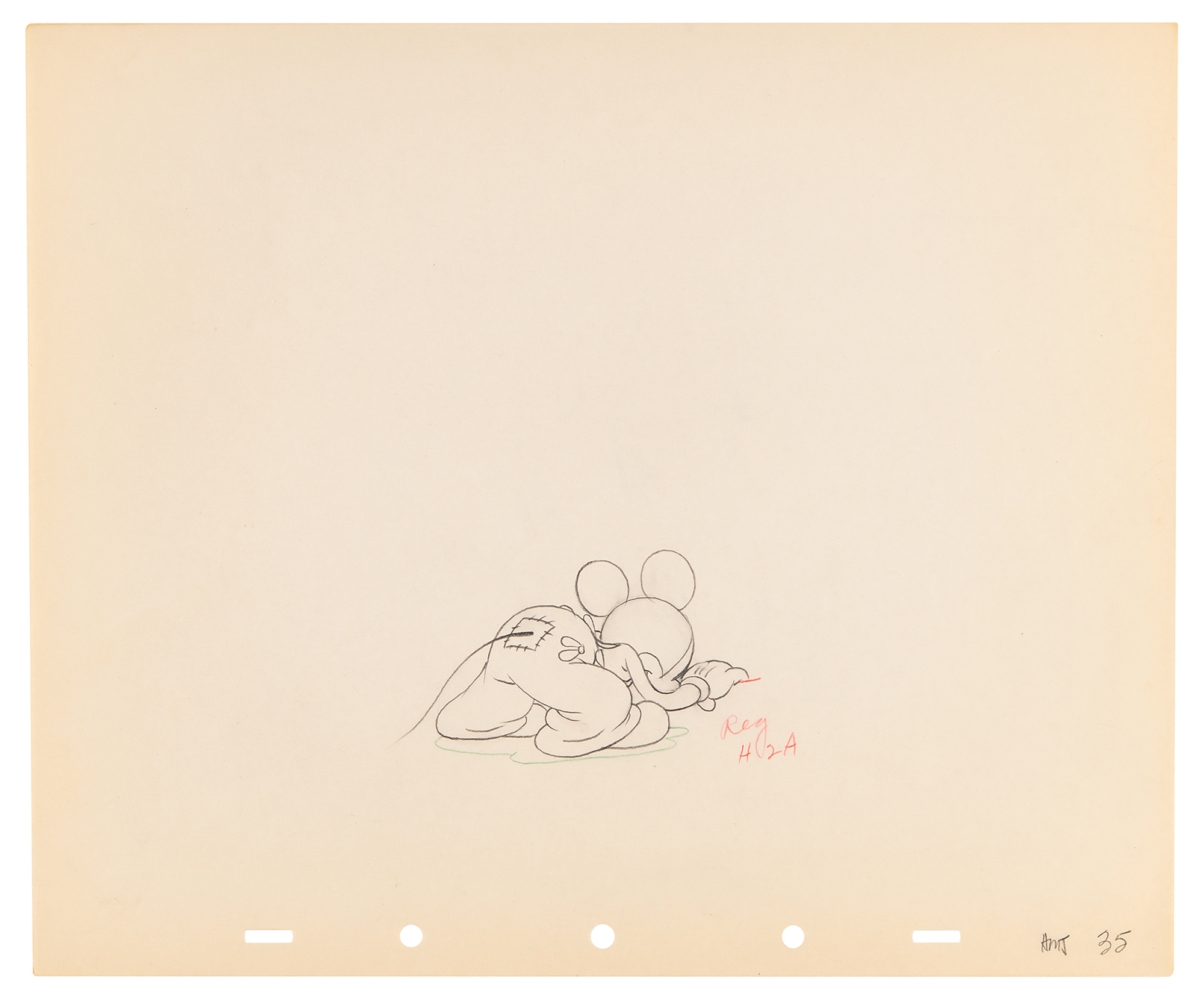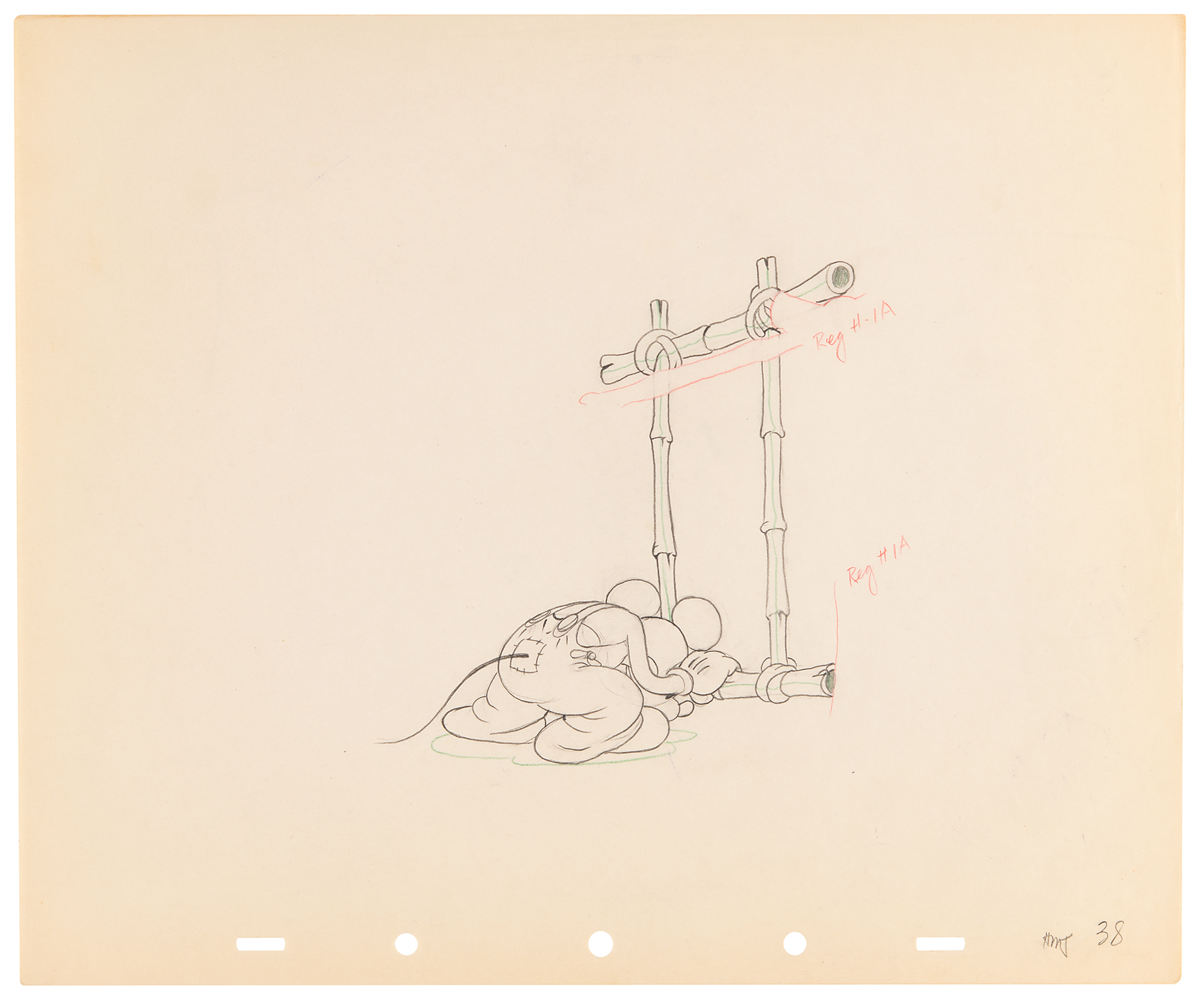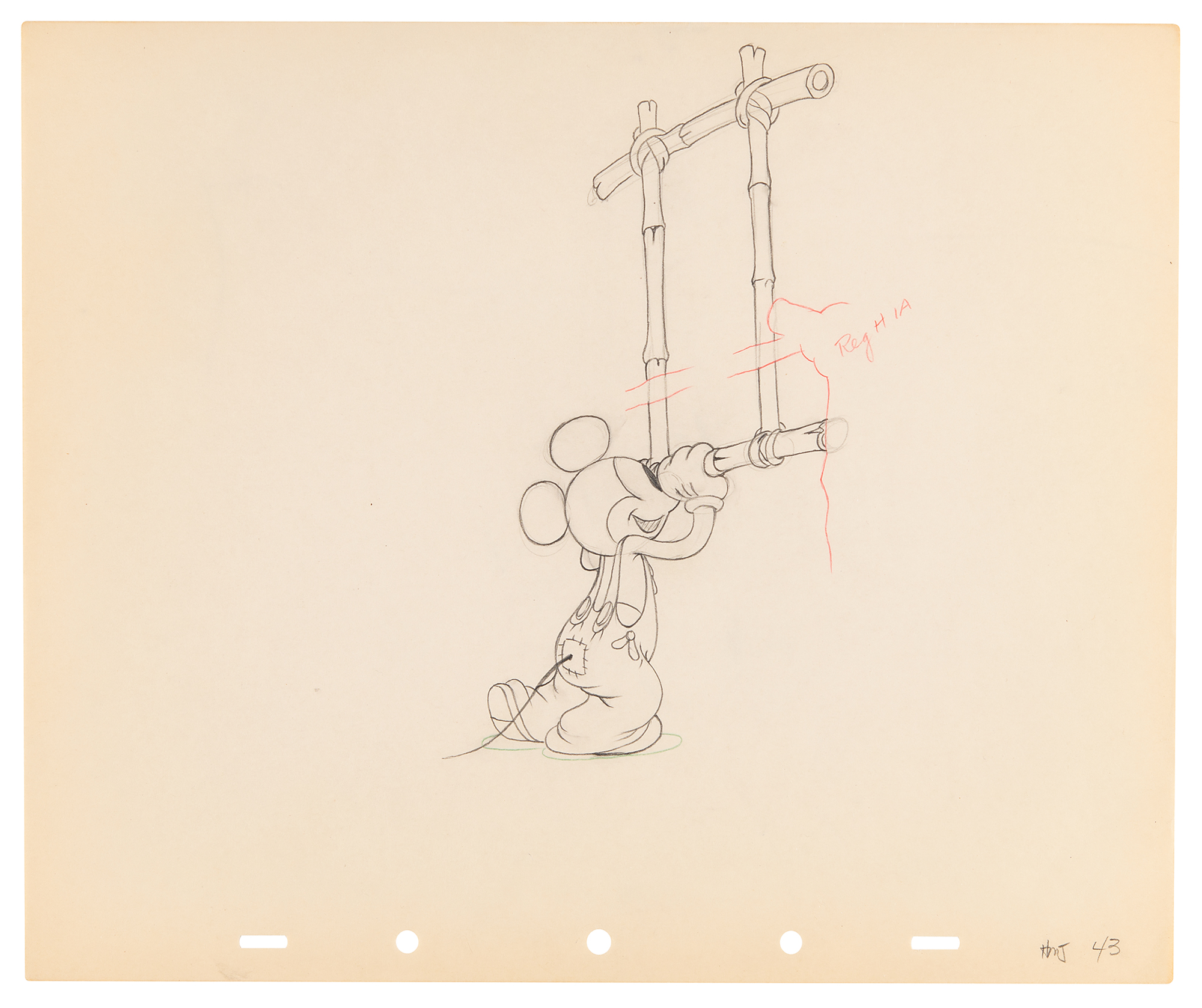 (Walt Disney Studios, 1936) Amazing collection of 26 original production drawings featuring Mickey Mouse from Mickey's Elephant, from the sequence where the Mickey first runs up to the baby elephant's cage, raises the bamboo gate, and coaxes the elephant out by pulling its trunk; in several drawings, the placement of the trunk is outlined in red. Accomplished in graphite and colored pencil on untrimmed 12 x 10 animation paper. Images measure from 2.5 x 3 to 4 x 7.5. In overall fine condition. Mickey Mouse production drawings are highly sought on their own?rarely are so many from a single sequence offered as a single collection.