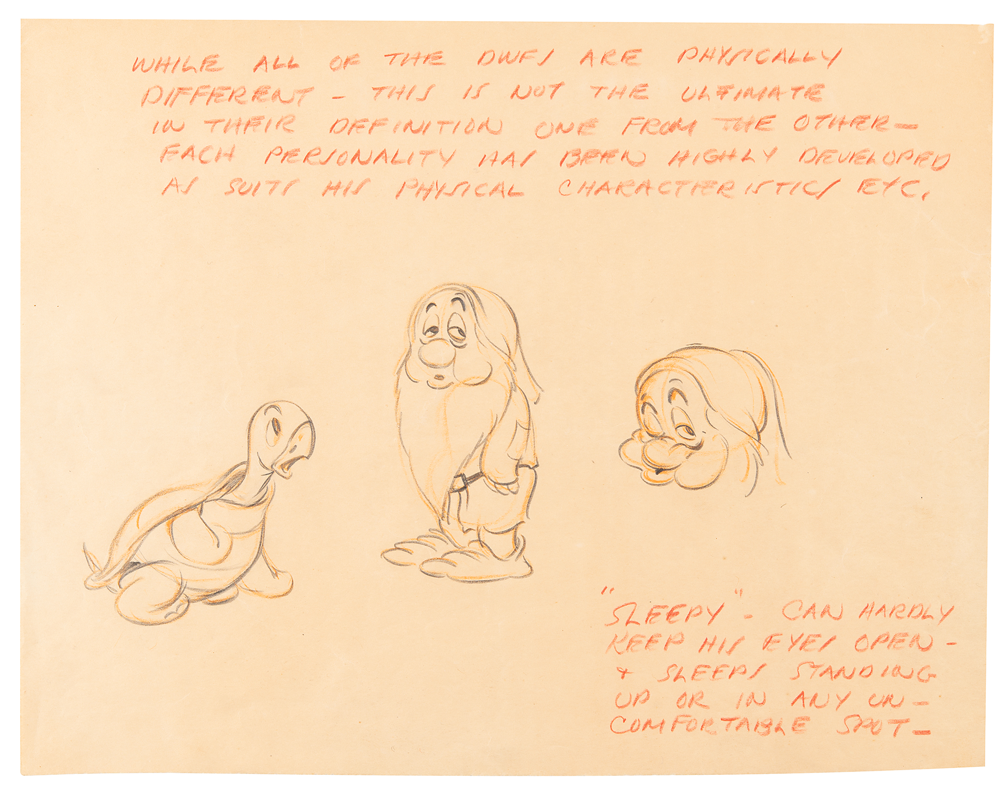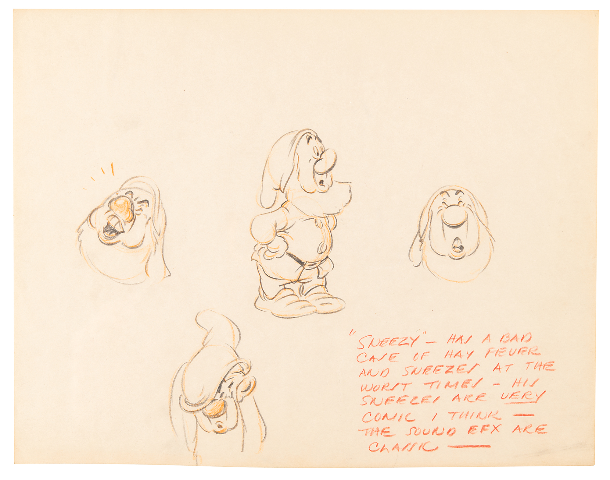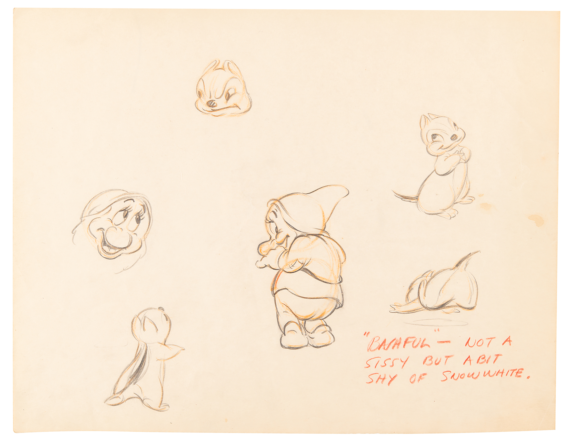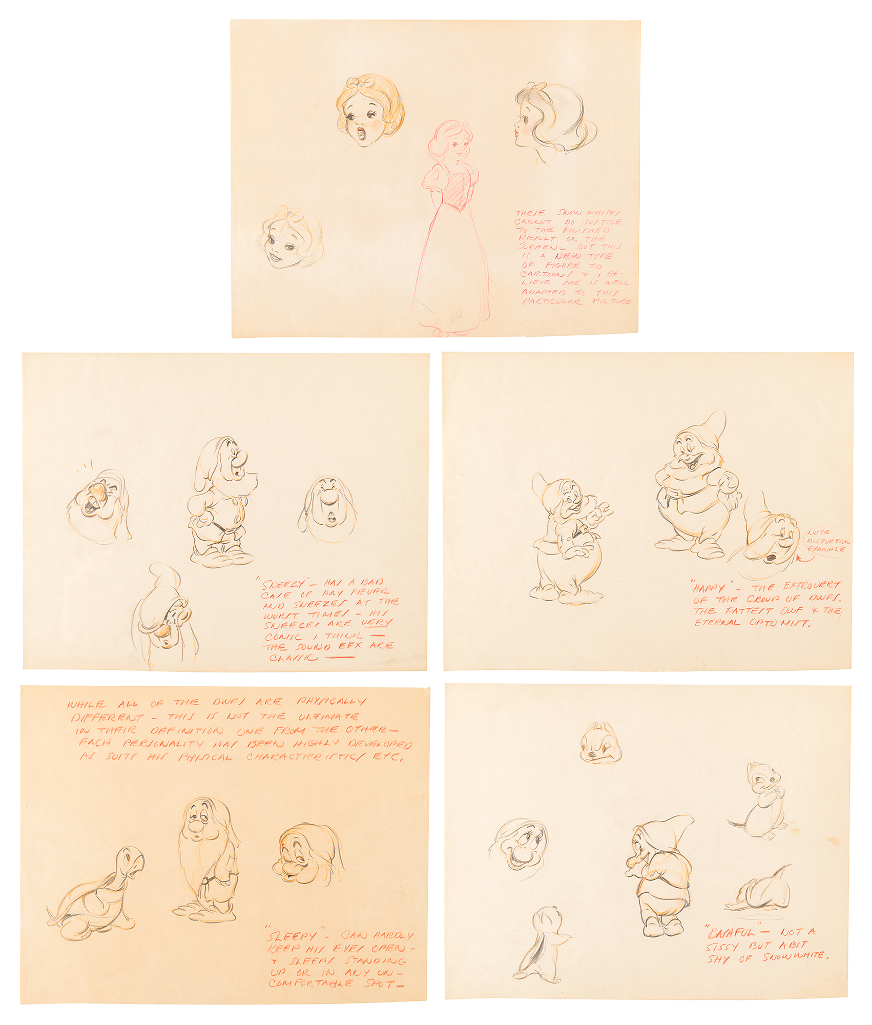 (Walt Disney Studios, 1937) Extraordinary assemblage of five original concept character model drawings for Snow White and the Seven Dwarfs, featuring expressive drawings of Snow White, Happy, Sneezy, Sleepy, and Bashful in various poses, each with at least one full-bodied sketch, and the addition of details attributed to Ken Anderson. Accomplished in graphite and colored pencil on trimmed sheets of 12 x 9.25 animation paper, with each insightfully captioned in red pencil: "These Snow Whites cannot do justice to the finished result on the screen—but this is a new type of figure to cartoons & I believe she is well adapted to this particular picture"; "'Happy'—the extrovert of the group of dwfs. The fattest dwf & the eternal optimist"; "'Sneezy'—has a bad case of hay fever and sneezes at the worst times—his sneezes are highly comic I think—the sound efx are classic—"; "'Bashful'—not a sissy but a bit shy of Snow White"; and "While all of the dwfs are physically different—this is not the ultimate in their definition one from the other—each personality has been highly developed as suits his physical characteristics, etc. 'Sleepy'—can hardly keep his eyes open—& sleeps standing up or in any uncomfortable spot." In overall fine condition.