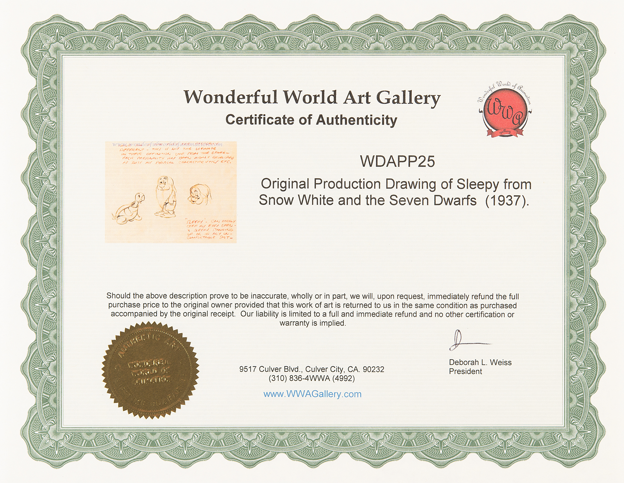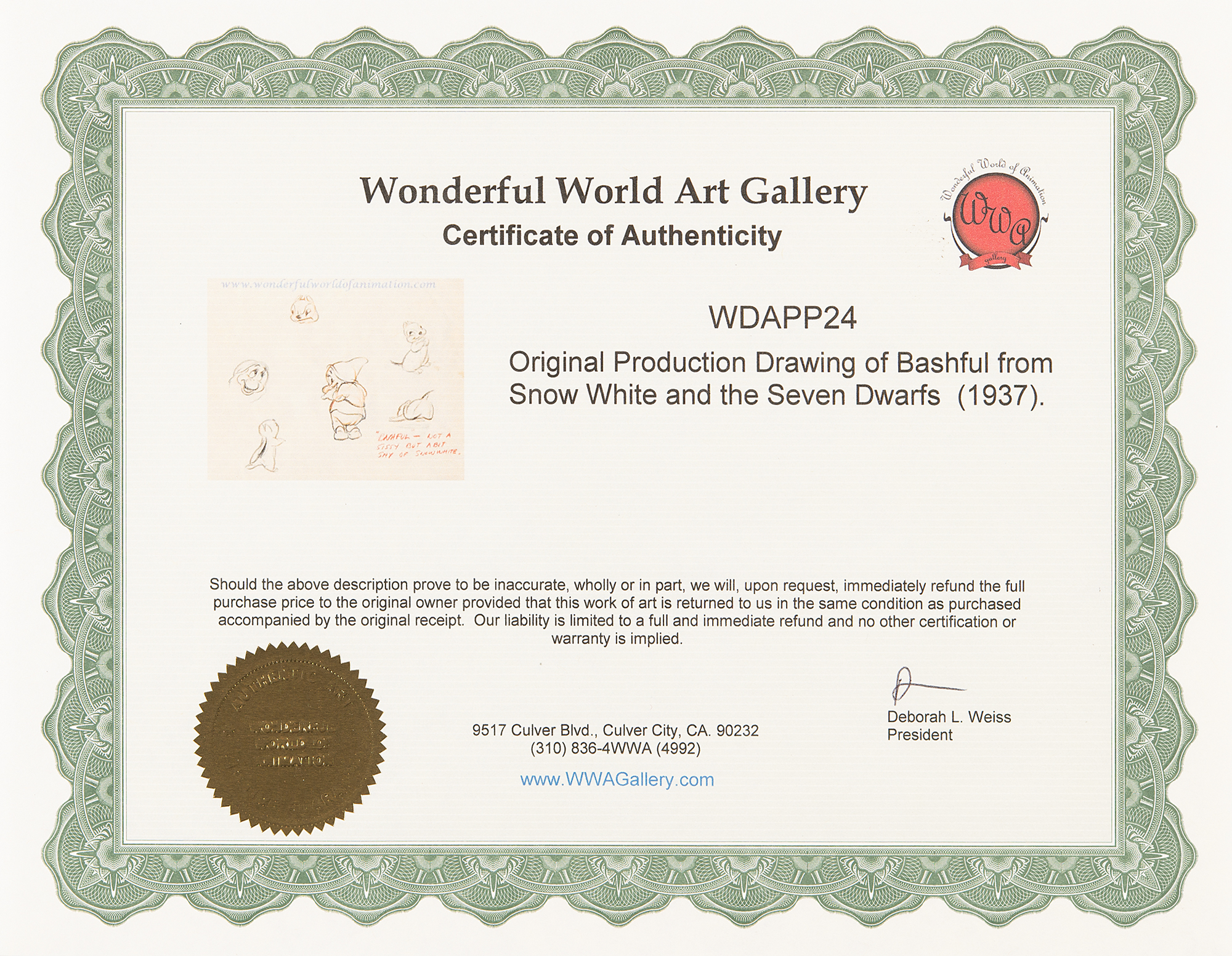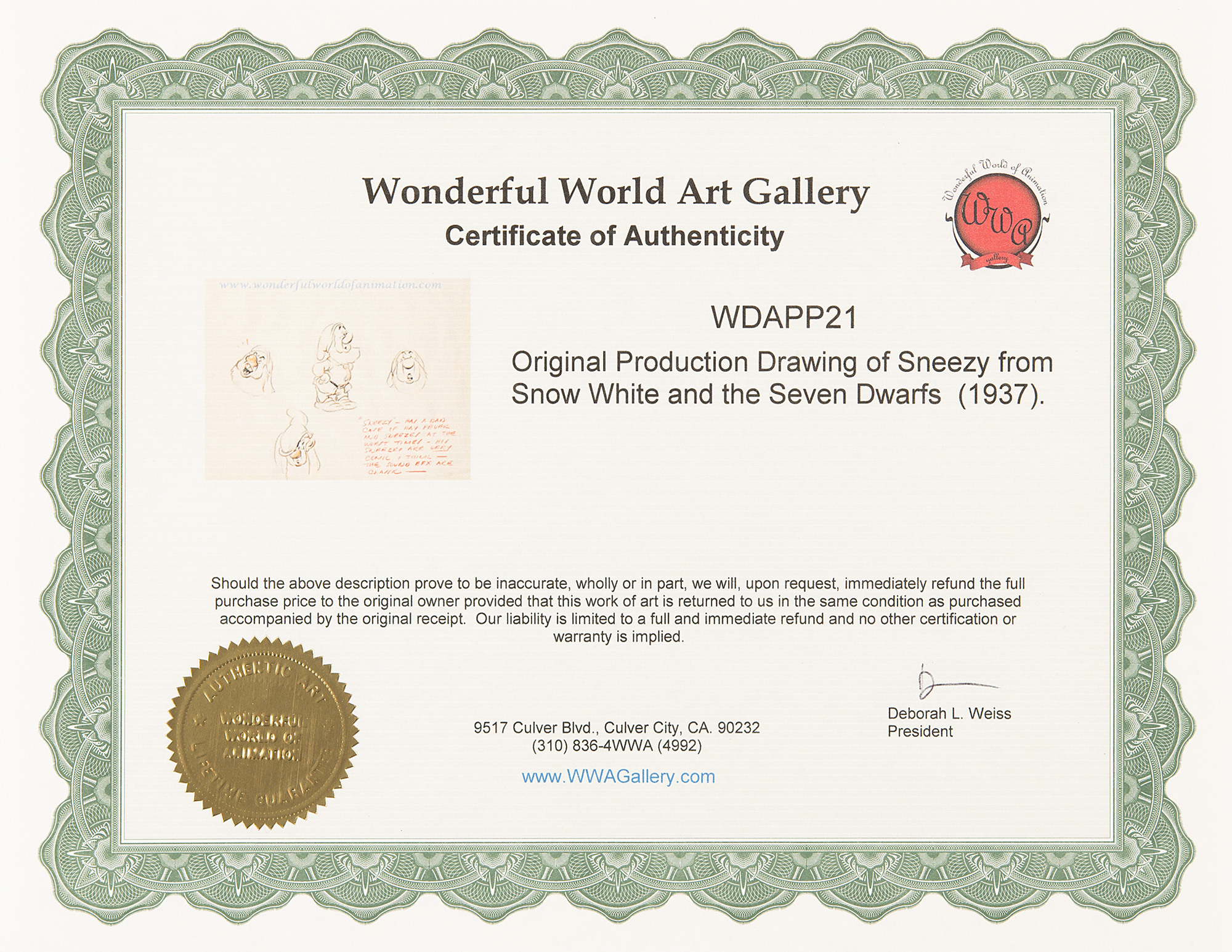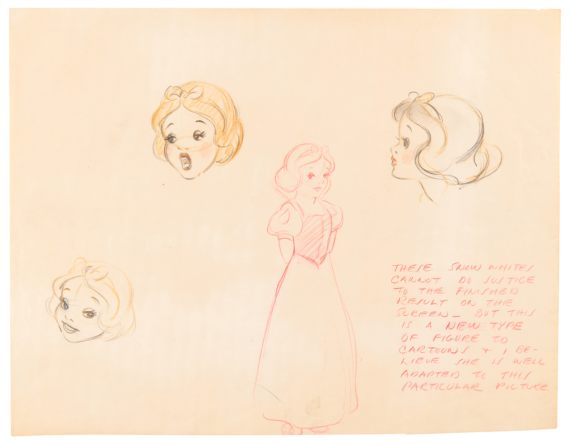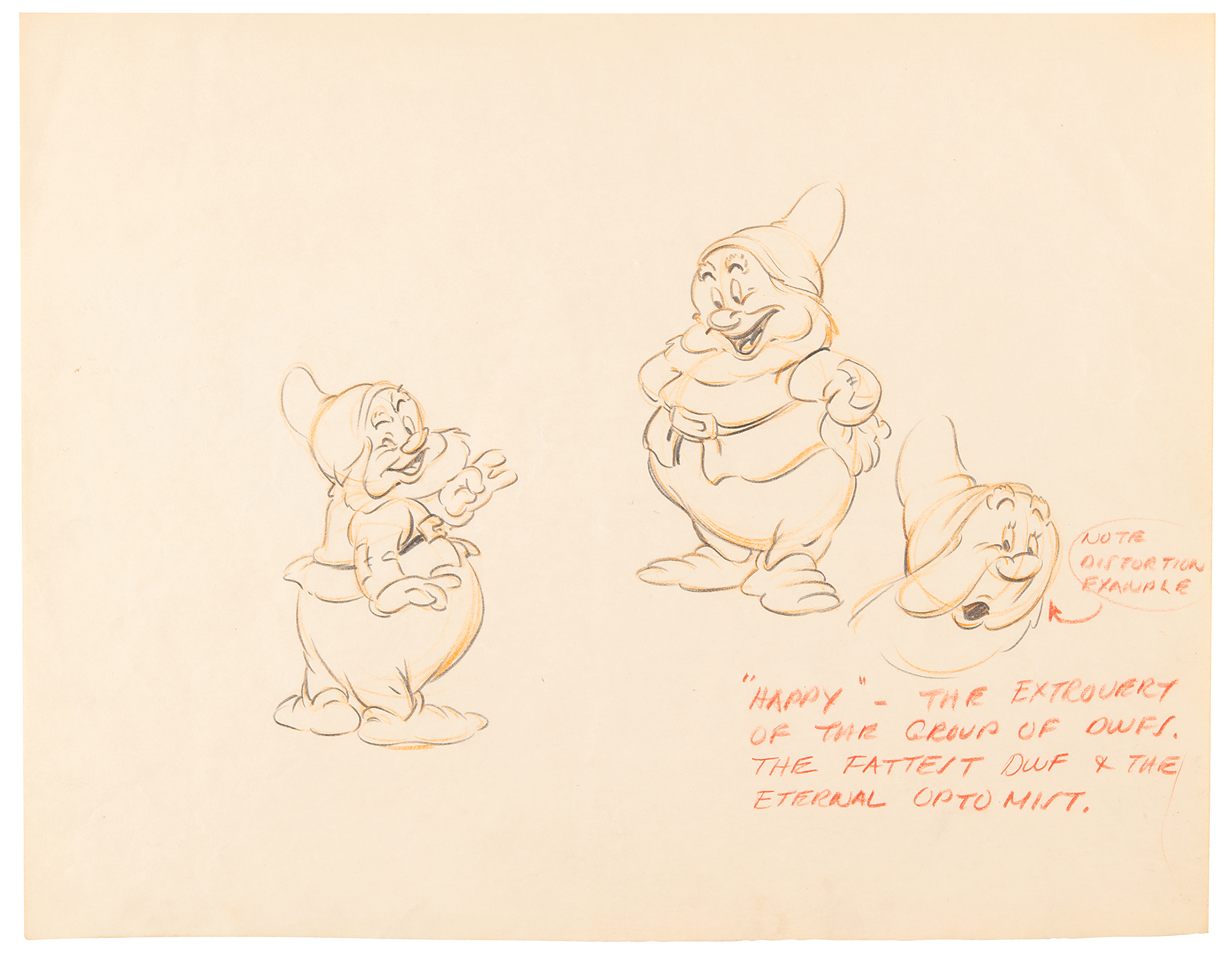 (Walt Disney Studios, 1937) Extraordinary assemblage of five original concept character model drawings for Snow White and the Seven Dwarfs, featuring expressive drawings of Snow White, Happy, Sneezy, Sleepy, and Bashful in various poses, each with at least one full-bodied sketch, and the addition of details attributed to Ken Anderson. Accomplished in graphite and colored pencil on trimmed sheets of 12 x 9.25 animation paper, with each insightfully captioned in red pencil: "These Snow Whites cannot do justice to the finished result on the screen—but this is a new type of figure to cartoons & I believe she is well adapted to this particular picture"; "'Happy'—the extrovert of the group of dwfs. The fattest dwf & the eternal optimist"; "'Sneezy'—has a bad case of hay fever and sneezes at the worst times—his sneezes are highly comic I think—the sound efx are classic—"; "'Bashful'—not a sissy but a bit shy of Snow White"; and "While all of the dwfs are physically different—this is not the ultimate in their definition one from the other—each personality has been highly developed as suits his physical characteristics, etc. 'Sleepy'—can hardly keep his eyes open—& sleeps standing up or in any uncomfortable spot." In overall fine condition.