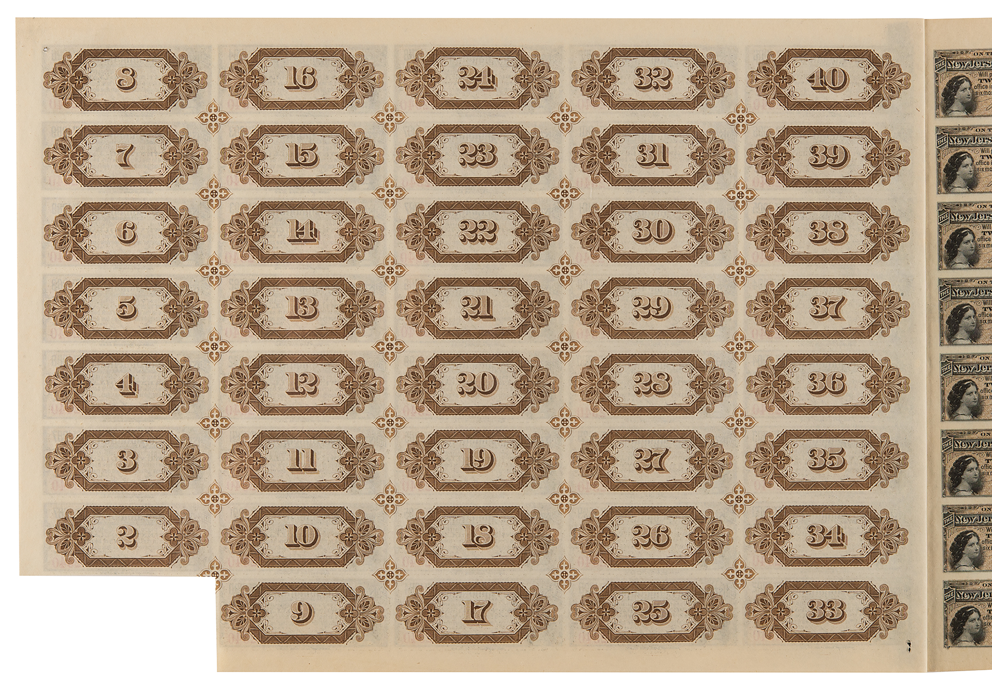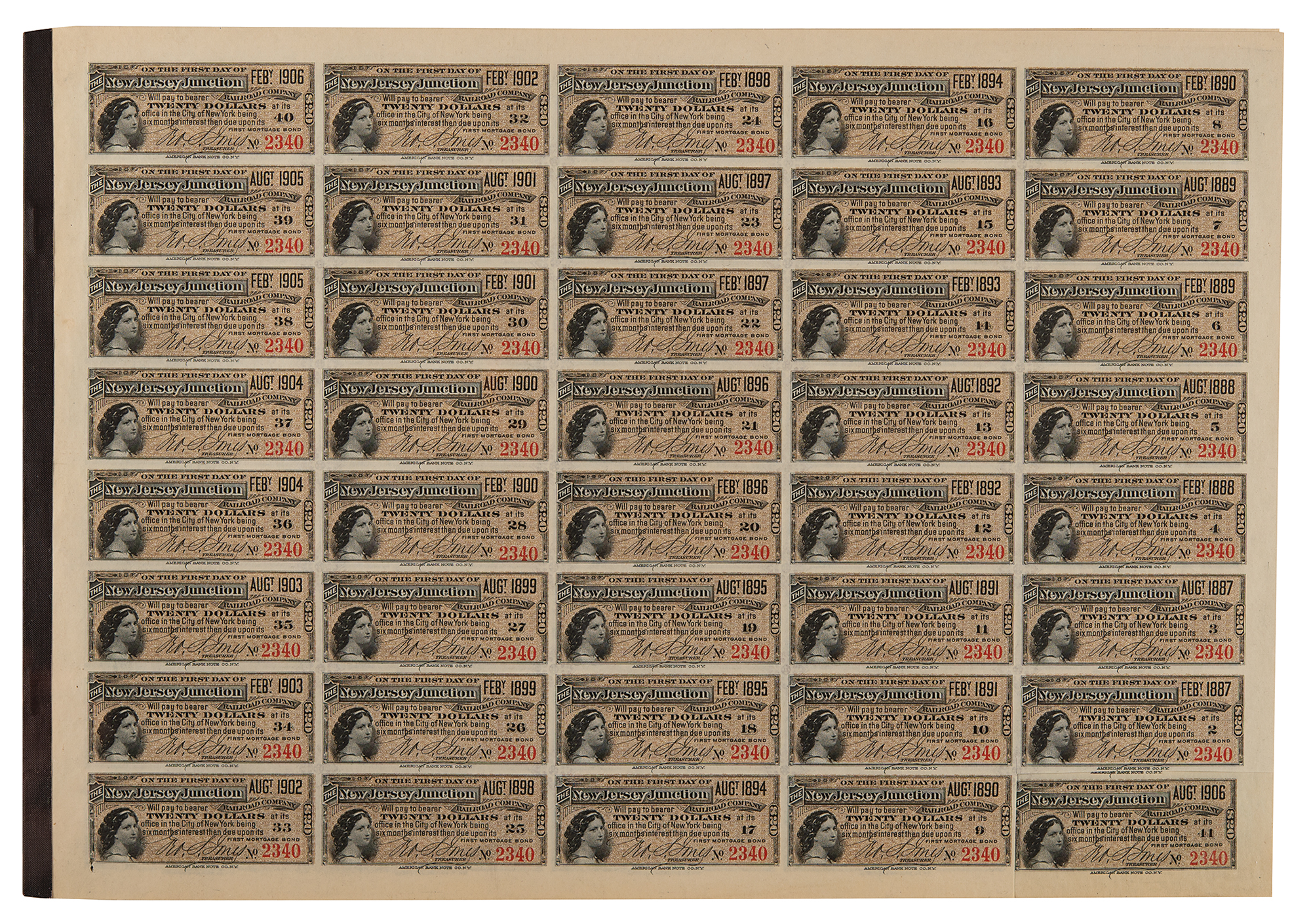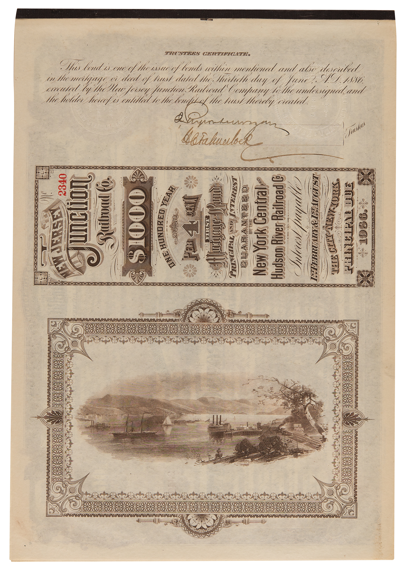 Partly-printed DS, signed “J. Pierpont Morgan,” one page, 13.5 x 9.5, June 30, 1886. First mortgage bond of the New Jersey Junction Railroad Company in the amount of $1000, endorsed on the reverse by J. P. Morgan and H. C. Fahnestock as trustees. Unaccomplished and bound at the left edge with five pages of the original coupons, with 199 of 200 still present. In fine condition.
