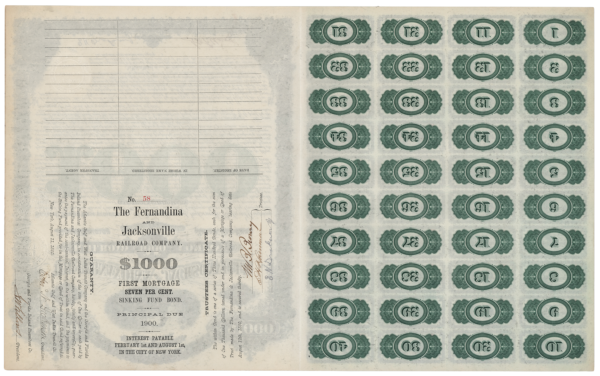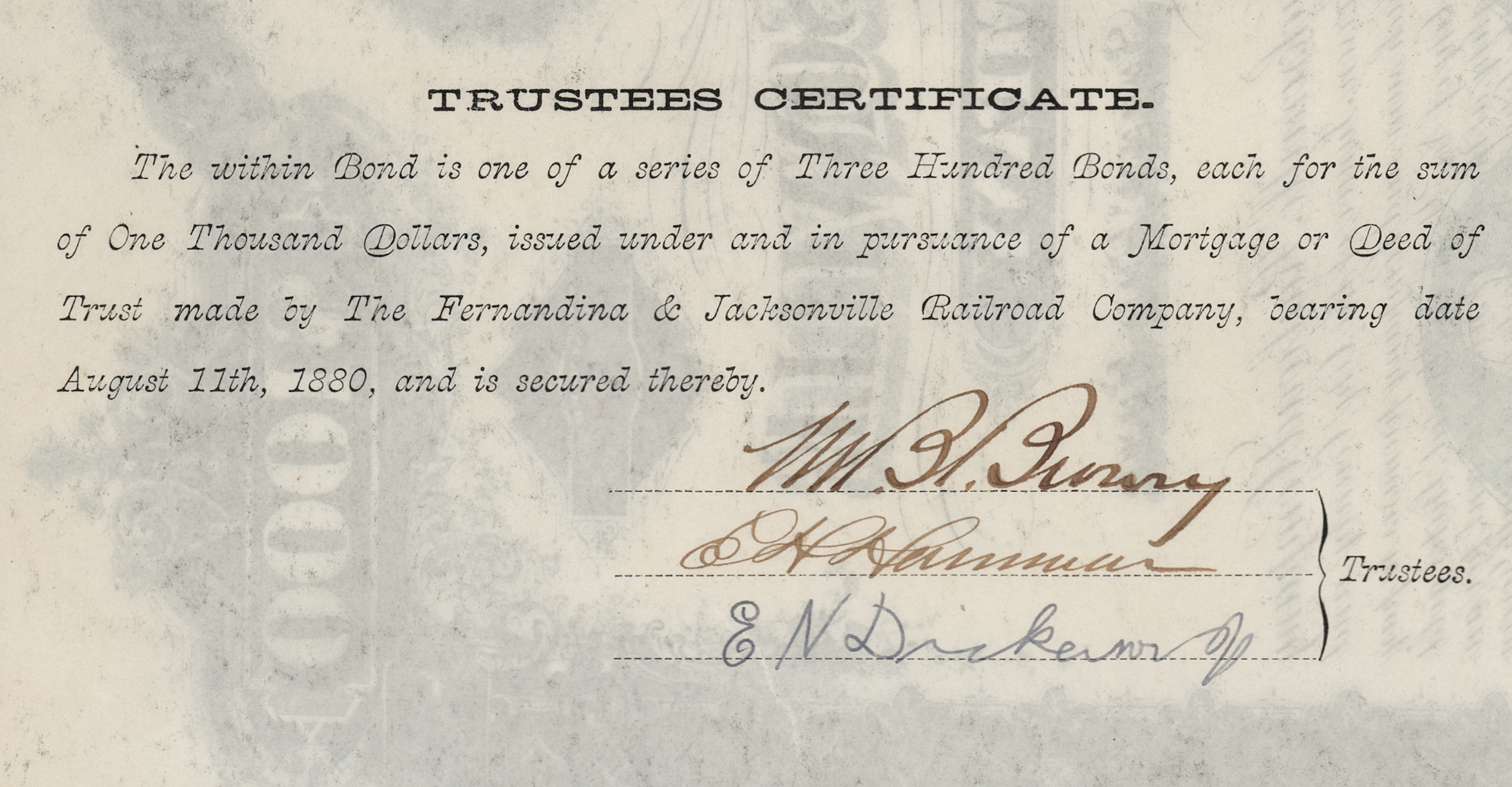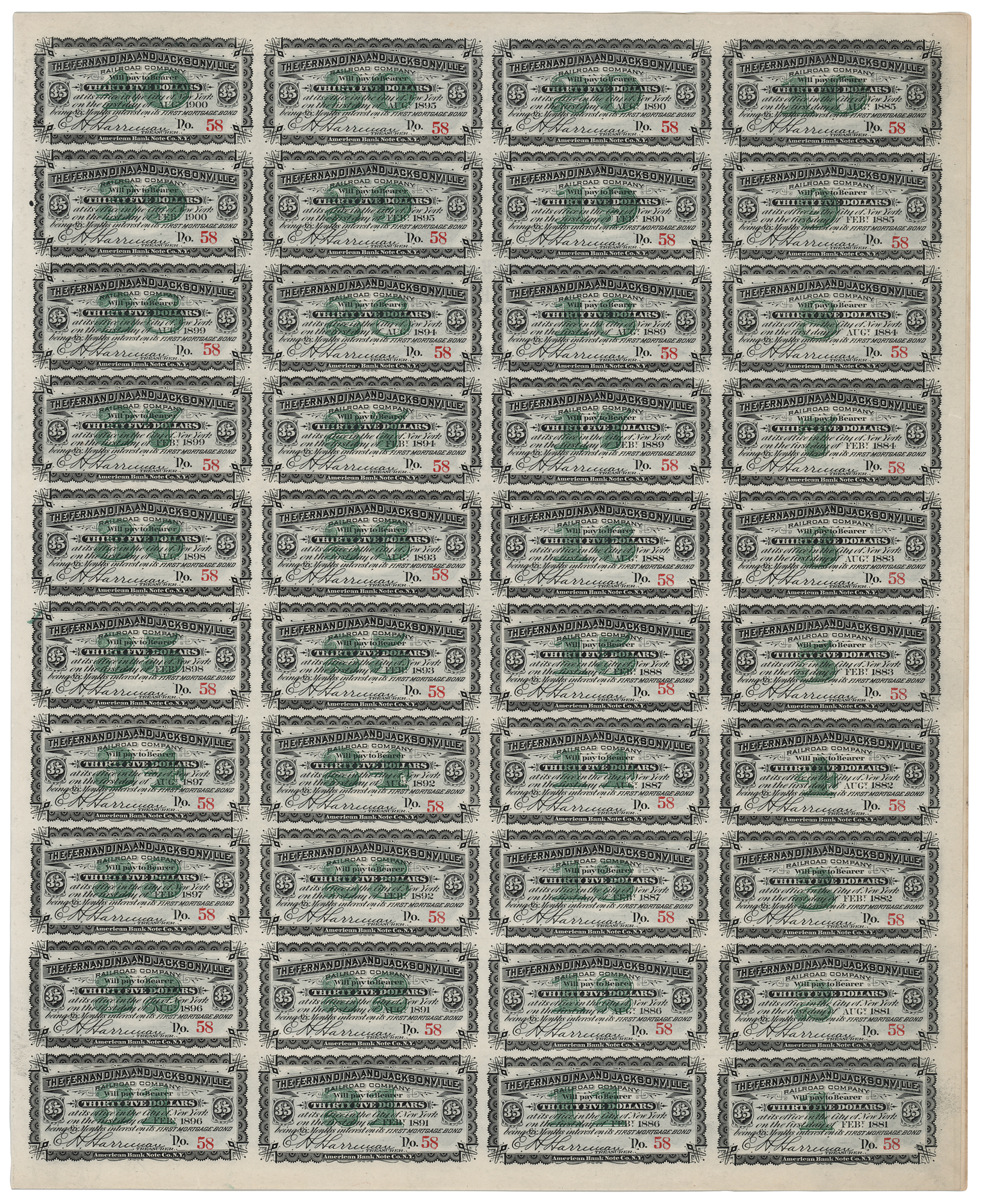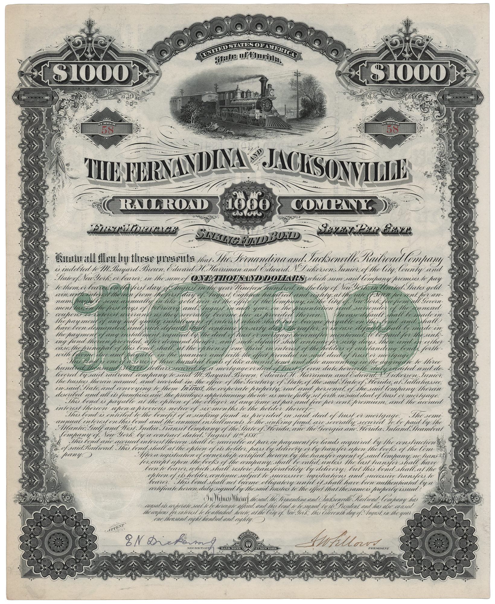 E. H. Harriman Signed 'Fernandina and Jacksonville Railroad Company' Bond