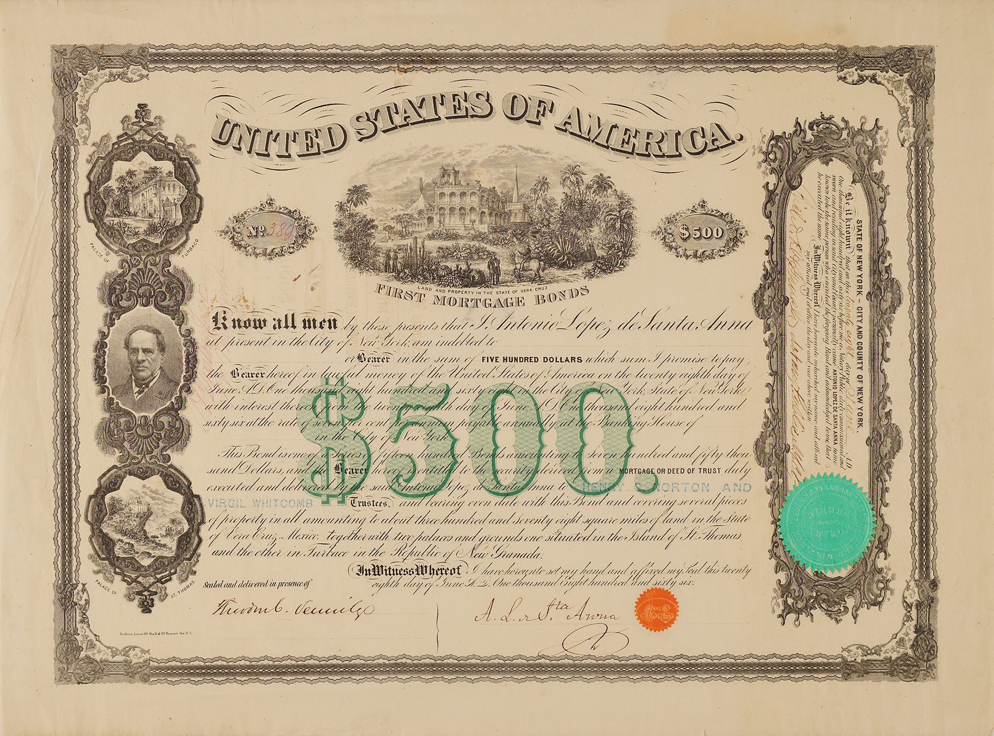 Mexican soldier and politician (1794–1876) best remembered for leading the defeat of Texan defenders at the Battle of the Alamo in 1836. Sought-after partly-printed DS, signed “A. L. de Sta. Anna,” one page, 18.5 x 13.5, June 28, 1866. Ornate unissued first mortgage bond document issued by Santa Anna in the amount of $500, beautifully engraved with images of three properties he owned that he used to guarantee the bonds: his palace in Vera Cruz, Mexico; his palace in Turbaco; and his palace in St. Thomas. Crisply signed at the conclusion by Santa Anna. The affixed green and orange seals remain fully intact. In fine condition, with light creasing in the left border.