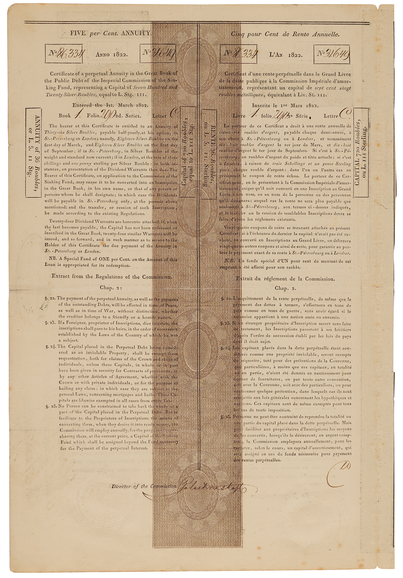 European Jewish financier (1777-1836) who founded his family’s famous banking dynasty and handled Allied loans for the campaign against Napoleon. Rothschild helped to ensure Britain’s preeminence as a financial market when bonds he handled as an investment banker were denominated in sterling and the interest made payable to London in pounds. Among the powers availing themselves of the new arrangements was Czarist Russia, which floated a loan for £3,500,000 in 1822. Three-language partly-printed DS, signed “N. M. Rothschild,” one page both sides, 9.75 x 14.25, March 1, 1822. A Russian imperial bond for 720 rubles with 5% annuity. Signed in the upper right margin in ink by Nathan Mayer Rothschild. In fine condition.