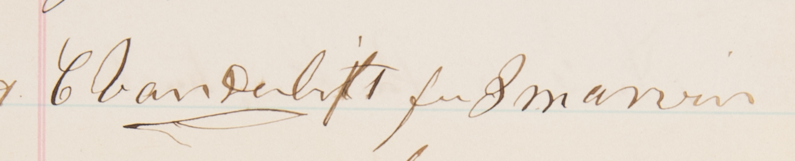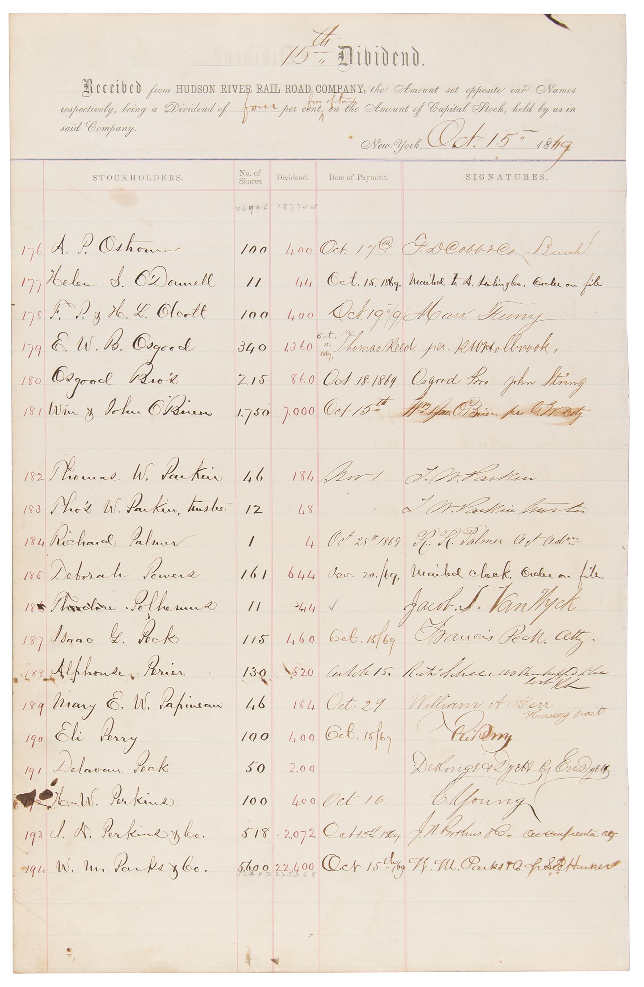 American businessman (1794-1877), one of America's first millionaires, who built his fortune in shipping and railroads. DS, signed "C. Vanderbilt," on behalf of James M. Marvin, one page, both sides, 11 x 17.25, October 15, 1869. Hudson River Railroad Company financial document listing stockholders' receipts for dividends, signed in ink by Vanderbilt to confirm receipt of $3,680 as a dividend for 920 shares held by Marvin. In fine condition.