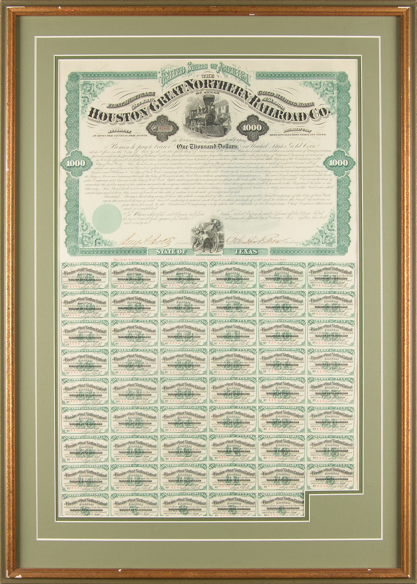 Prominent politician, lawyer, writer, and businessman (1822-1907) who served as Speaker of the House of Representatives from 1861 to 1863. DS, one page, 15.5 x 24, February 15, 1872. Attractive first mortgage gold-bearing bond for the Houston Great Northern Railroad for $1000, signed at the conclusion by Galusha A. Grow as president. Carrying a rate of 7%, the bond features attractive vignettes of a locomotive and men unloading a horse-drawn wagon, engravings that juxtapose the old and new methods of transportation. The lower portion retains a total of 53 coupons. Double-matted and framed to an overall size of 22 x 31. In fine condition.