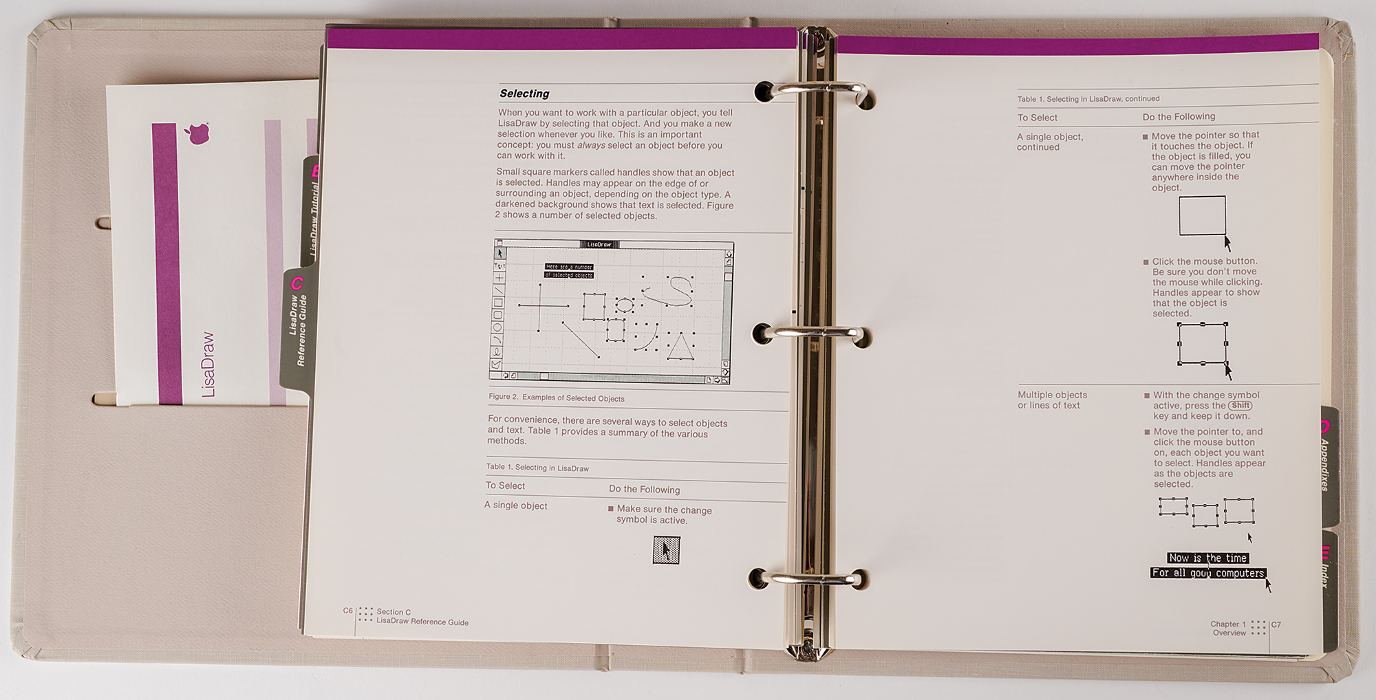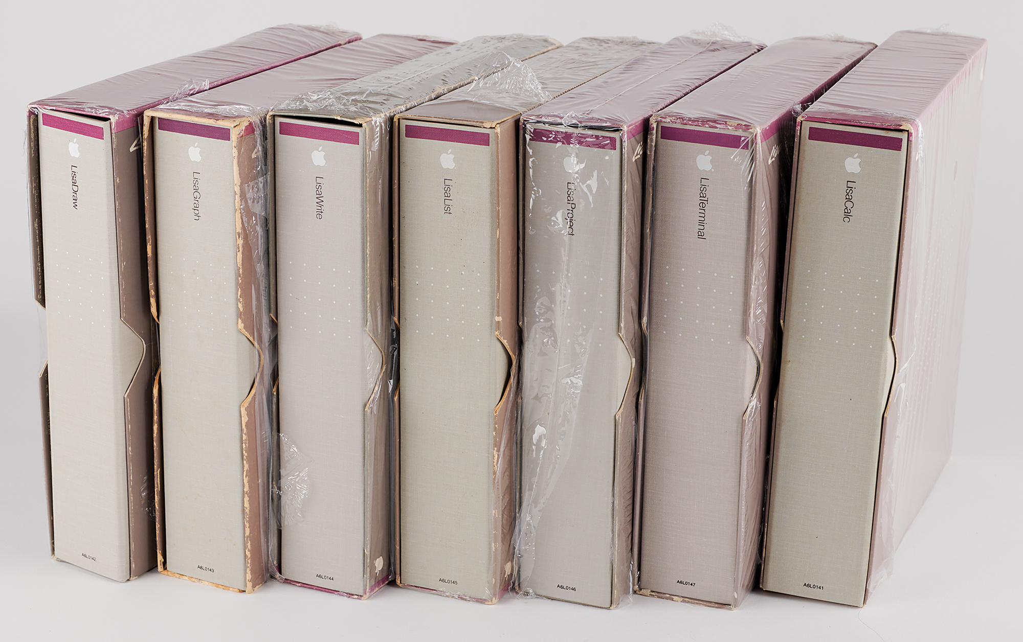 Collection of seven slipcased Apple Lisa software user's guides—for LisaDraw, LisaGraph, LisaWrite, LisaList, LisaProject, LisaTerminal, and LisaCalc—all in their original binders. In very good to fine condition, with some edgewear and staining to the slipcases. The disks are not included.