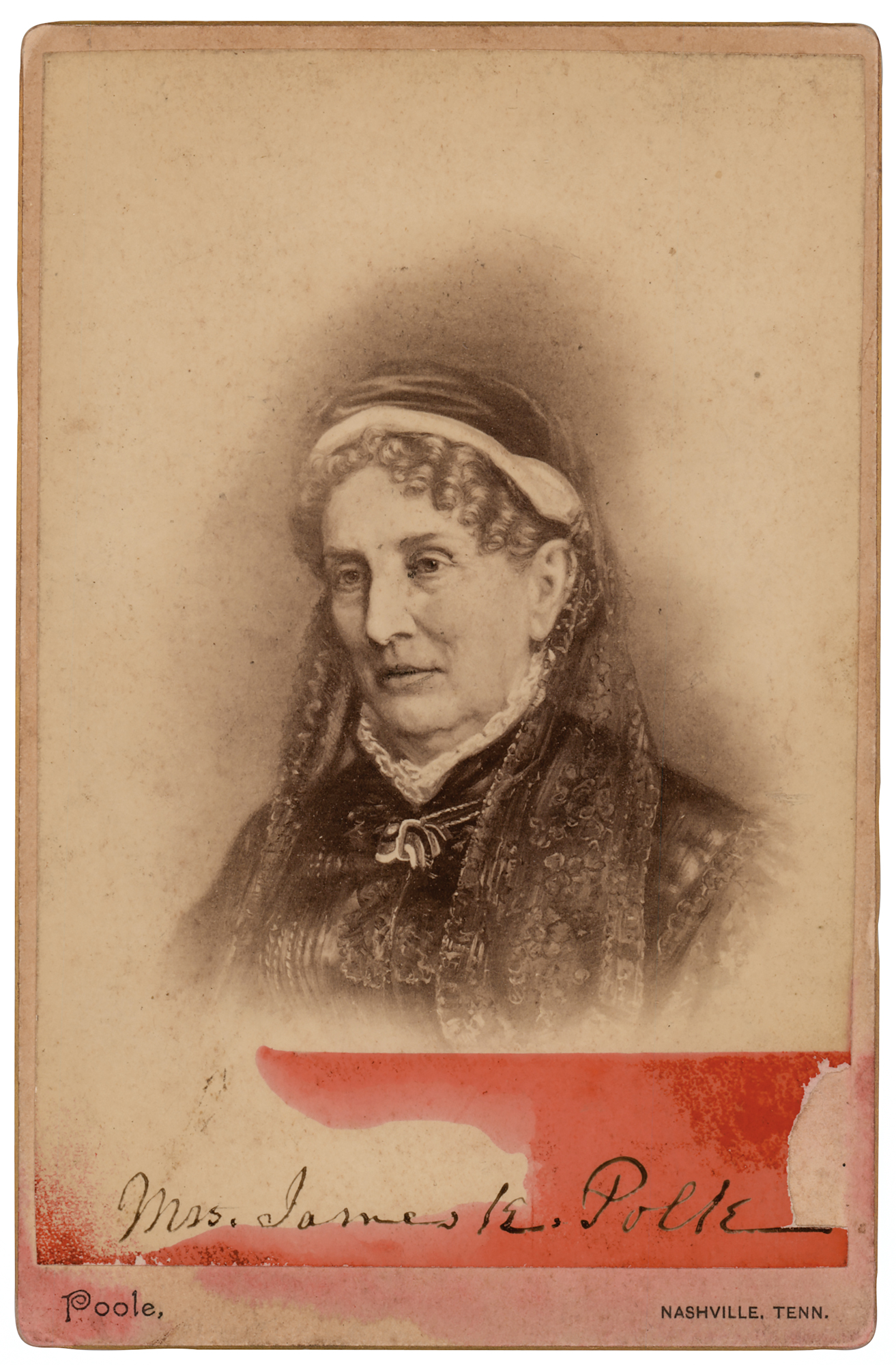 Wife of president James K. Polk (1803–1891) and first lady from 1845 to 1849. Scarce 4.25 x 6.5 cabinet photo of an artist's portrayal of Sarah Polk, published by R. Poole of Nashville, signed at the bottom of the image in ink, "Mrs. James K. Polk." In very good to fine condition, with red staining to the signature area, and a small area of surface loss just touching the tail of the signature.