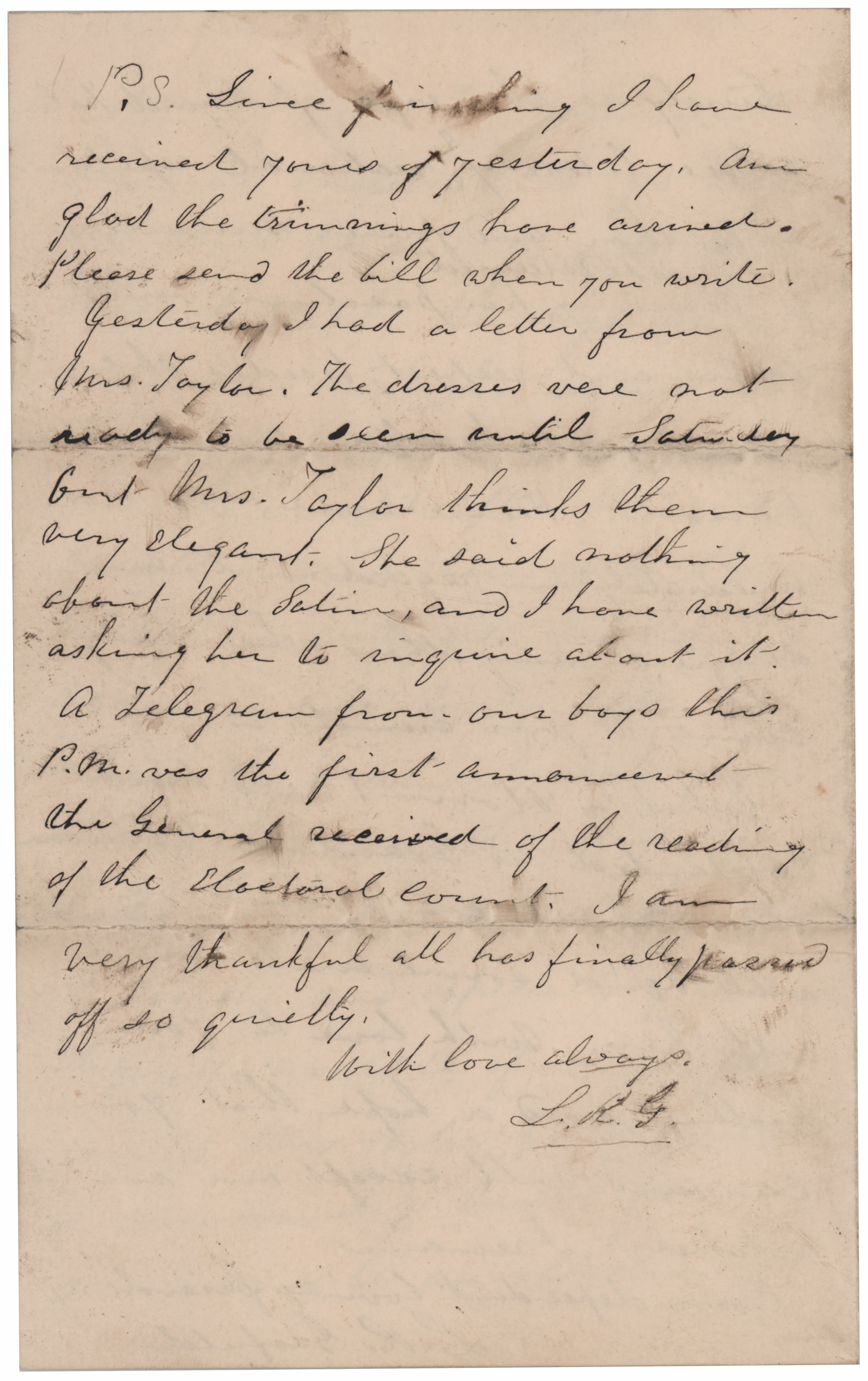 She adds a postscript on the last page, signed "L.R.G.," in part: "P.S. Since finishing I have received yours of yesterday. Am glad the trimmings have arrived. Please send the bill when you write. Yesterday I had a letter from Mrs. Taylor. The dresses were not ready to be seen until Saturday but Mrs. Taylor thinks them very elegant. She said nothing about the satin, and I have written asking her to inquire about it. A telegram from our boys this P.M. was the first announcement the General received of the reaching of the electoral count. I am very thankful all has finally passed off so quietly." In fine condition.