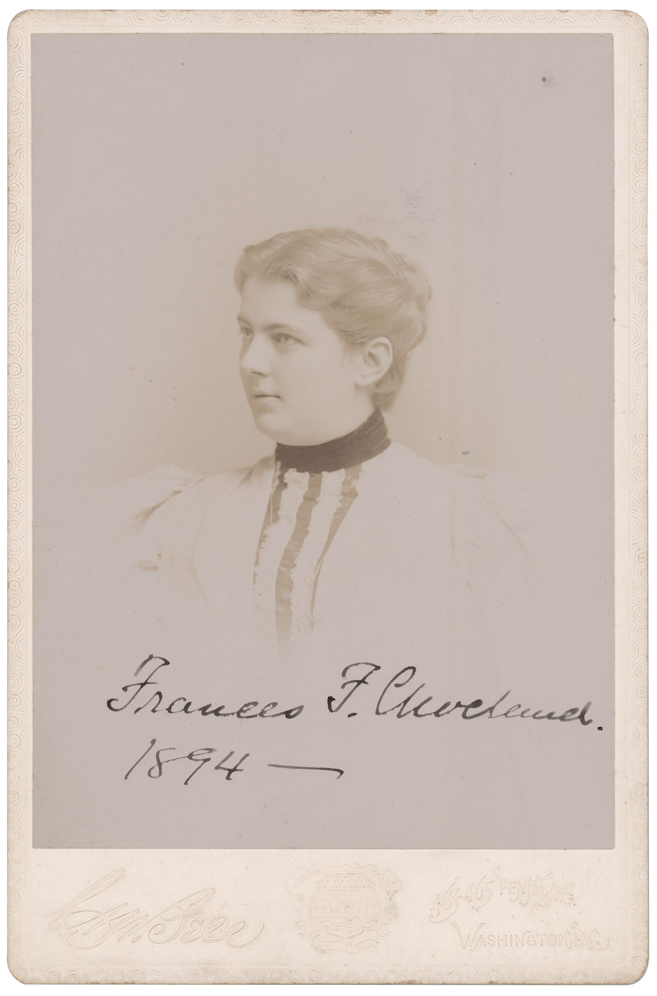 Choice 4.25 x 6.5 cabinet photo of Frances Cleveland by C. M. Bell of Washington, signed in ink as first lady, "Frances F. Cleveland, 1894." In very fine condition, with an identification notation on the reverse.