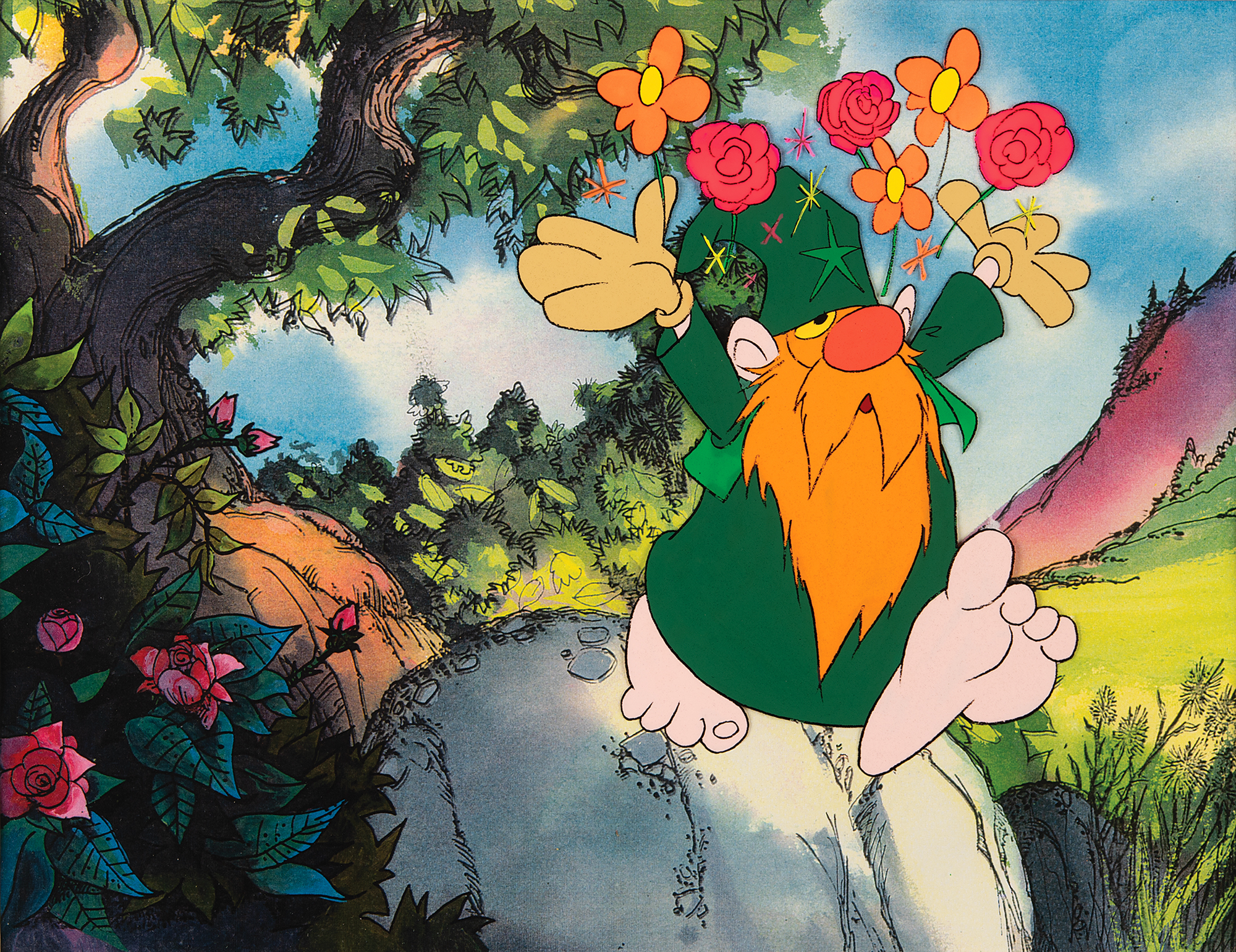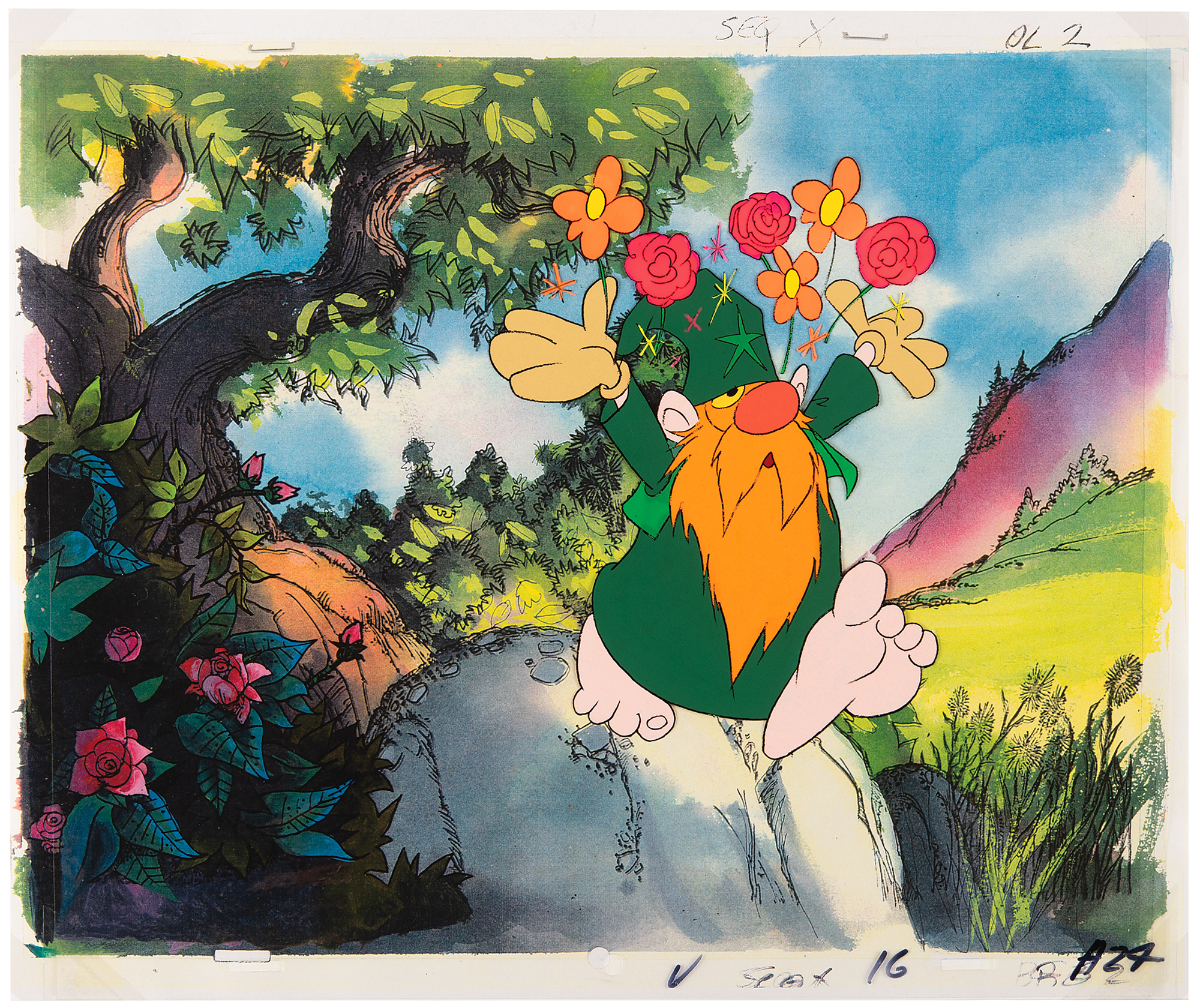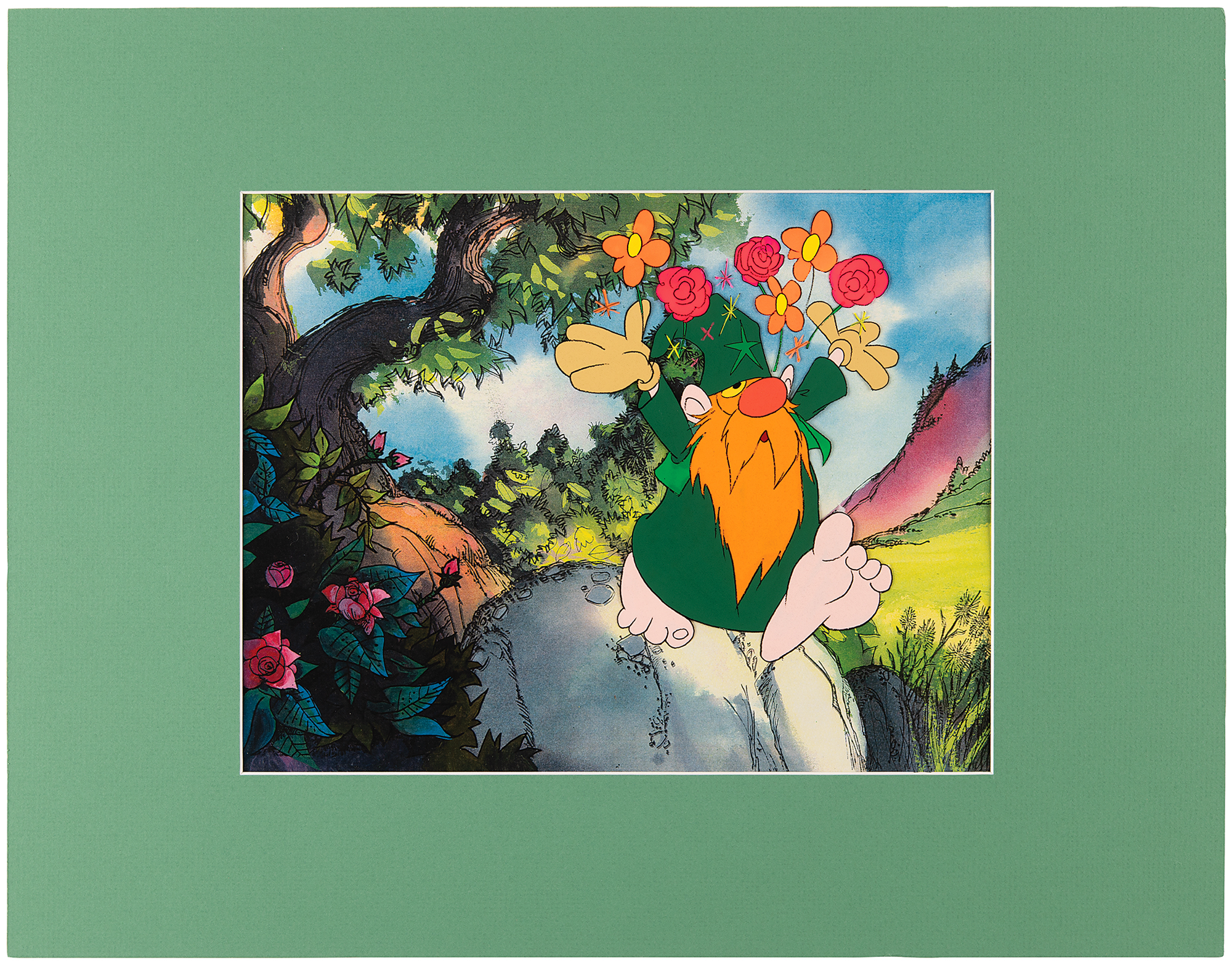(Bakshi Productions, 1977) Original production cel of Avatar from Ralph Bakshi's sci-fi fantasy film Wizards, which depicts the powerful wizard in a full-length walking pose with several bright stars and flowers floating over his head. Image measures 5.26 x 6.75, with overall dimensions of 13 x 11. The cel is placed on a color copy background and is matted to an overall size of 18 x 14. In fine condition. Wizards is notable for being the first fantasy film by Bakshi, who was previously known only for ‘urban films,’ such as animated cult classics Fritz the Cat, Heavy Traffic, and Coonskin.
