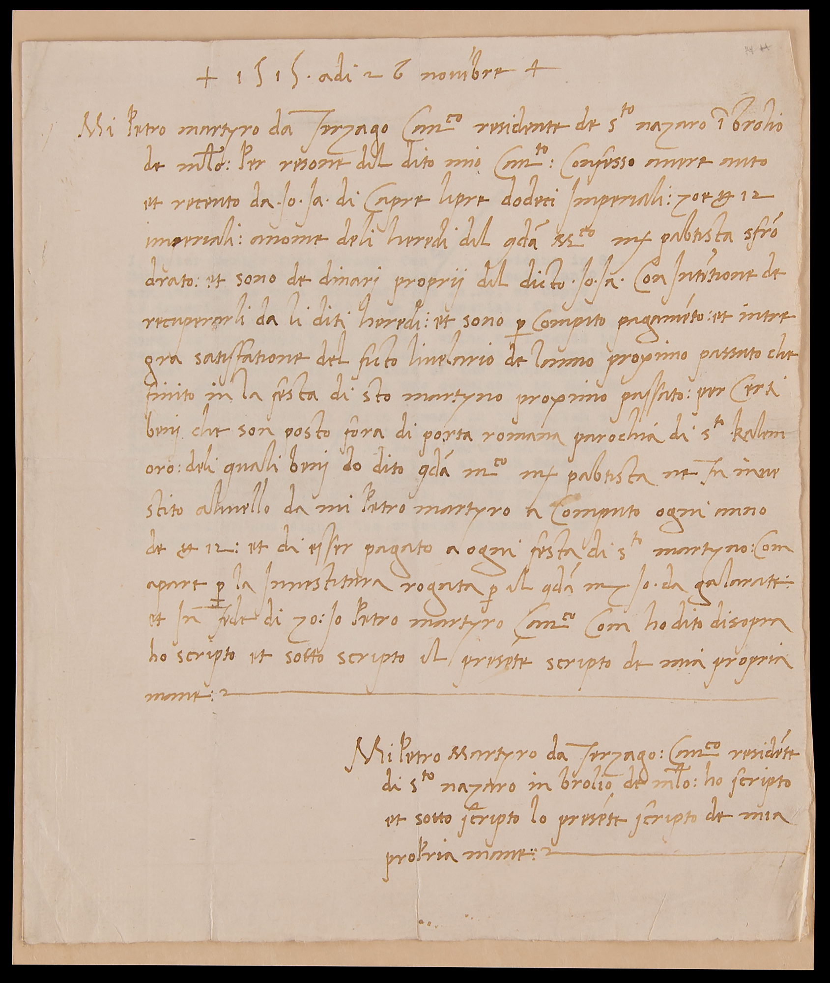 This receipt of funds is written in Peter Martyr's own hand ("mia propria mano") while he was spending time back in Milan, attached to the Sforza family. It acknowledges the receipt of a sum of twelve imperial livres linked to the late Baptista Sfondrato, a member of the powerful Sfondrato family and another high connection of Peter Martyr's.