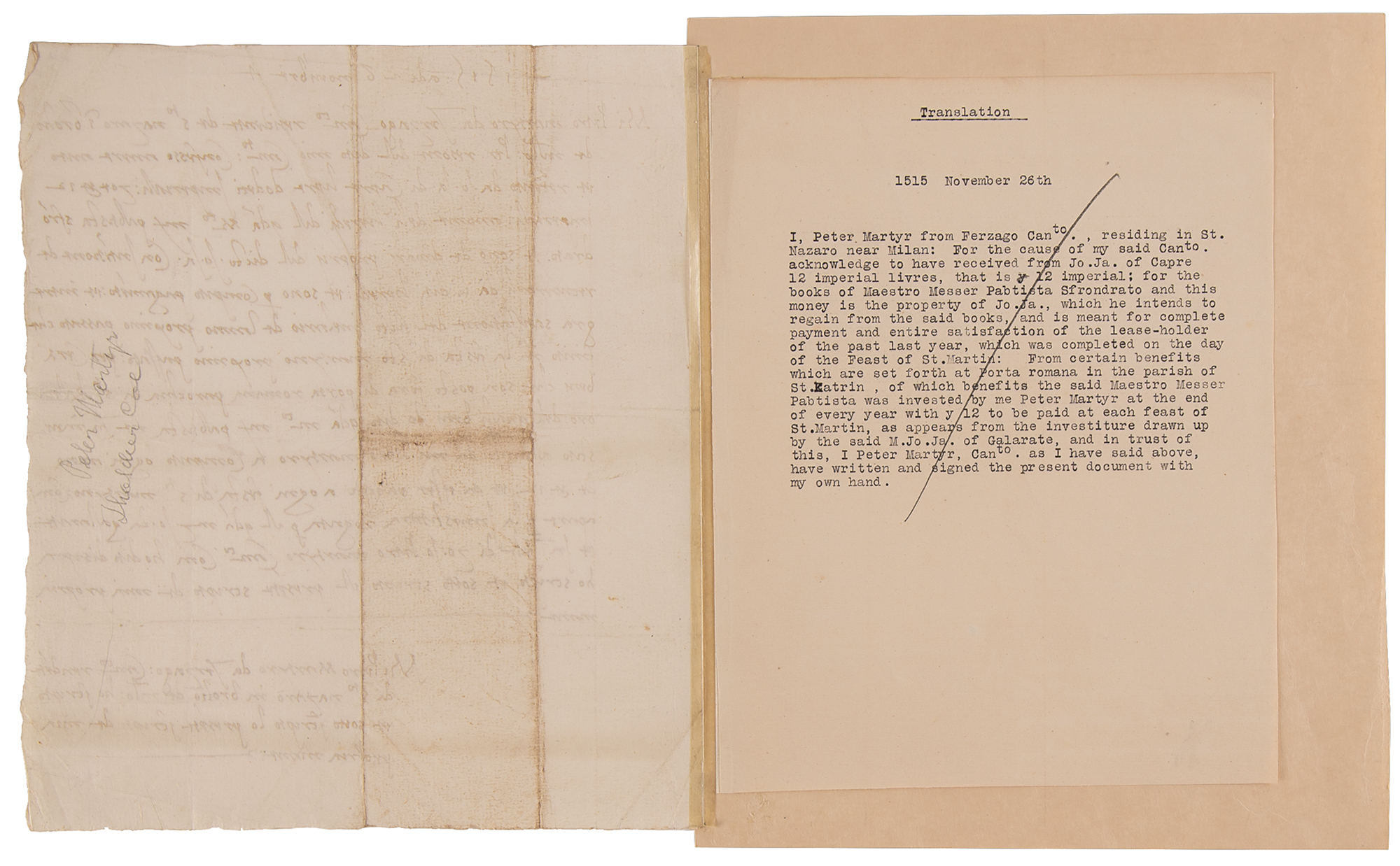 Italian historian (1457–1526) at the service of Spain during the Age of Exploration, who wrote the first accounts of explorations in Central and South America, sometimes cited as the originator of the term 'Novo Orbe [New World].' Third-person ADS in Italian, signed within the text, “Pietro Martyro,” one page, 8.25 x 9.5, November 6, 1515. Handwritten receipt acknowledging a sum of twelve imperial livres linked to the late Baptista Sfondrato, in part (translated): "I, Peter Martyr from Ferzago Canto., residing in St. Nazaro near Milan: For the cause of my said Canto. acknowledge to have received from Jo. Ja. of Capre 12 imperial livres…for the books of Maestro Messer of Pabtista Sfrondato…I Peter Martyr, Canto. as I have said above, have written and signed the present document with my own hand." Tipped by its edge to a slightly larger sheet carrying a complete translation. In fine condition. Housed in a handsome modern leatherbound clamshell case by The Chelsea Bindery.