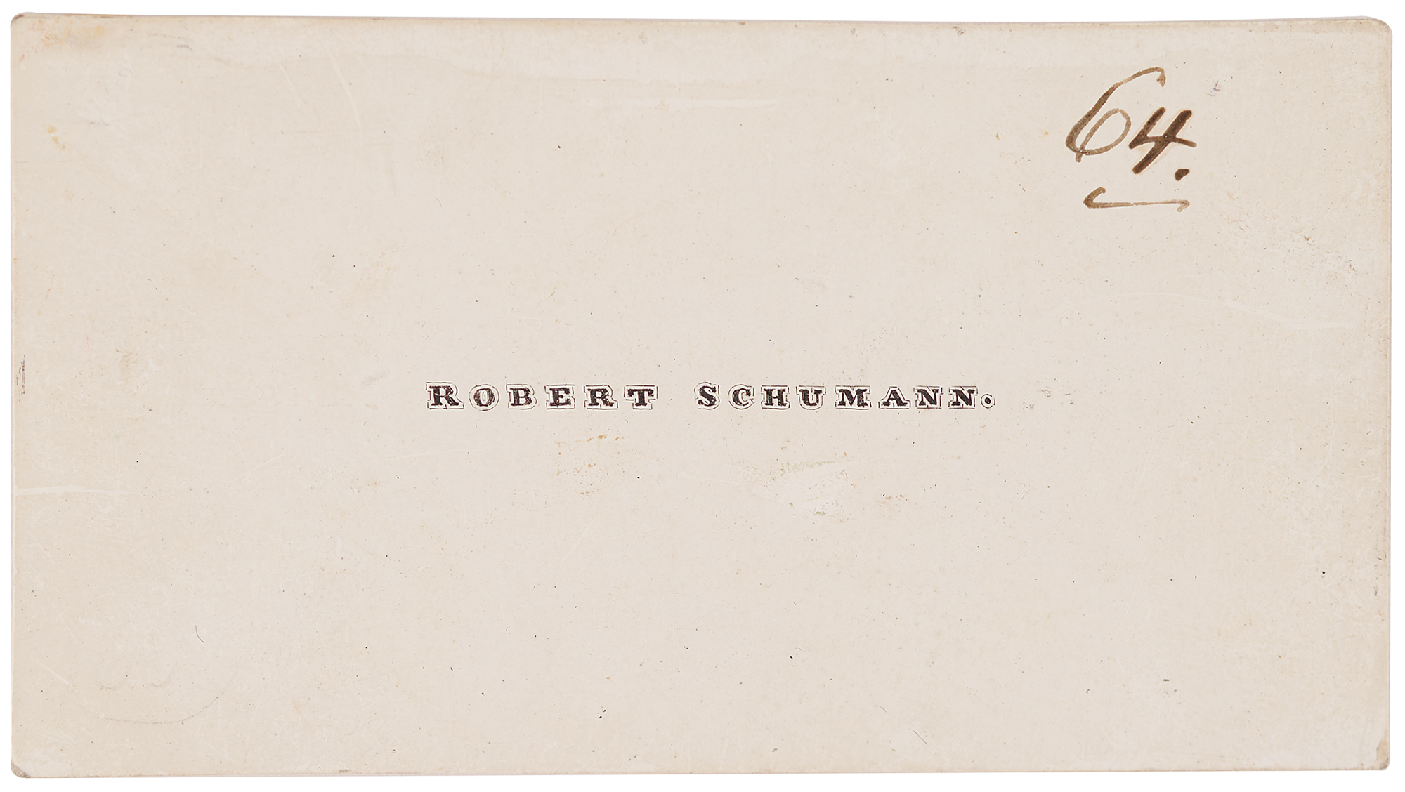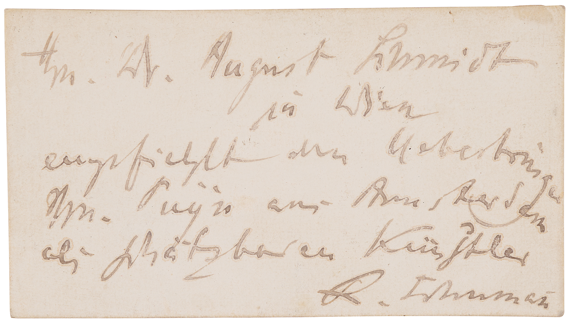 Highly important German composer and pianist (1810–1856) whose distinctively lyrical musical language, especially evident in his keyboard works and art songs, made him one of the central figures of the German Romantic tradition. ANS in German, signed "R. Schumann," one page, 3.25 x 1.75, no date. Schumann pens a note on the reverse of one of his personal calling cards, imprinted on the front: "Robert Schumann." The composer writes to the musical writer and musician August Schmidt, introducing a musician named Puyn visiting from Amsterdam. In fine condition.
