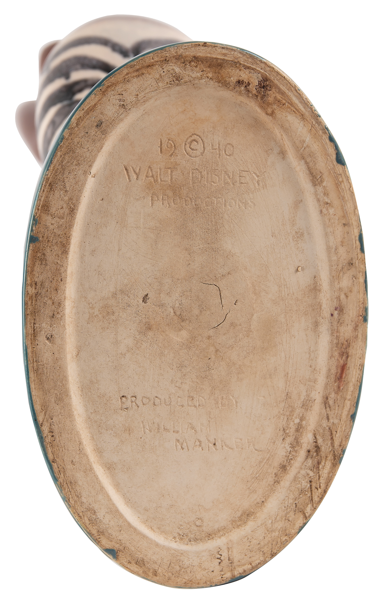 Animation aficionados will no doubt recall there being a third Black Centaurette – the incredibly ill-conceived Sunflower – who Disney artists designed to look part-human and part-donkey. Only the two Zebra Centaurettes, which were sometimes referred to as the ‘Nubian Centaurettes,’ can be found in Disney’s recently released versions of Fantasia. This ceramic appears to have been based directly on the production model of the character, which can be seen in the tour of the ‘Character Model Department’ in the 1941 Disney film The Reluctant Dragon.