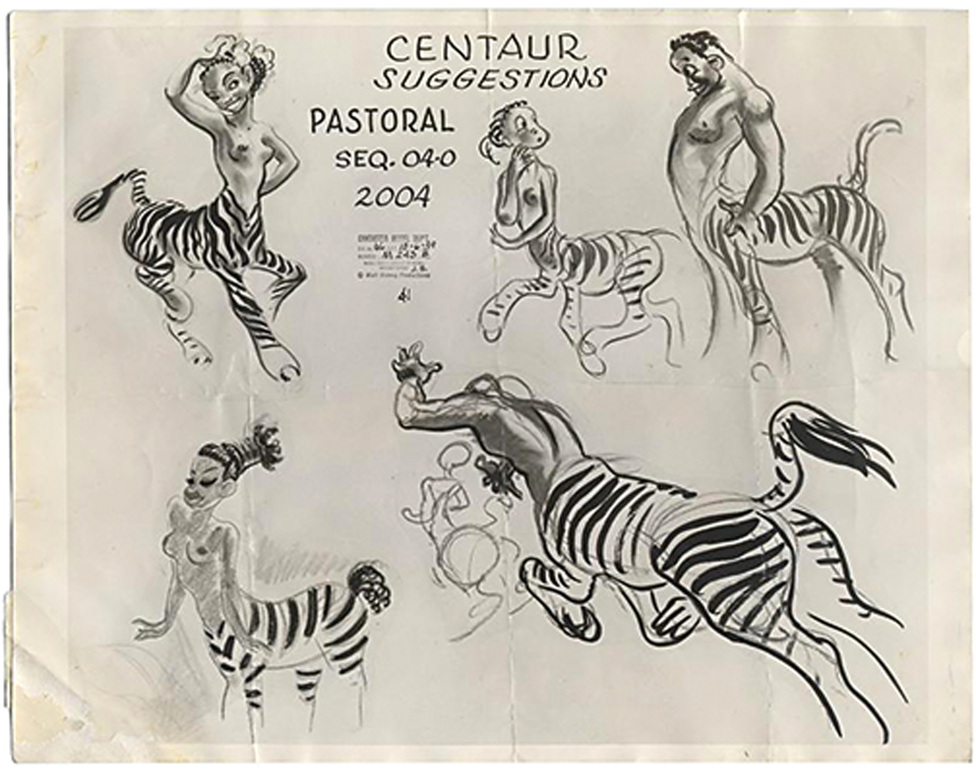While creating the mythological characters for the ‘Pastoral Symphony’ segment of Fantasia, Disney’s story artists came up with an idea for Black Centaurs and Centaurettes of ‘African origin.’ The character artists envisioned the Black Centaurs and Centaurettes as being similar to their Caucasian counterparts, only instead of being half-horse, they would have zebra-striped bodies. In the end, only two made it into the film; both were female, and both acted as servants to Bacchus, the god of wine.