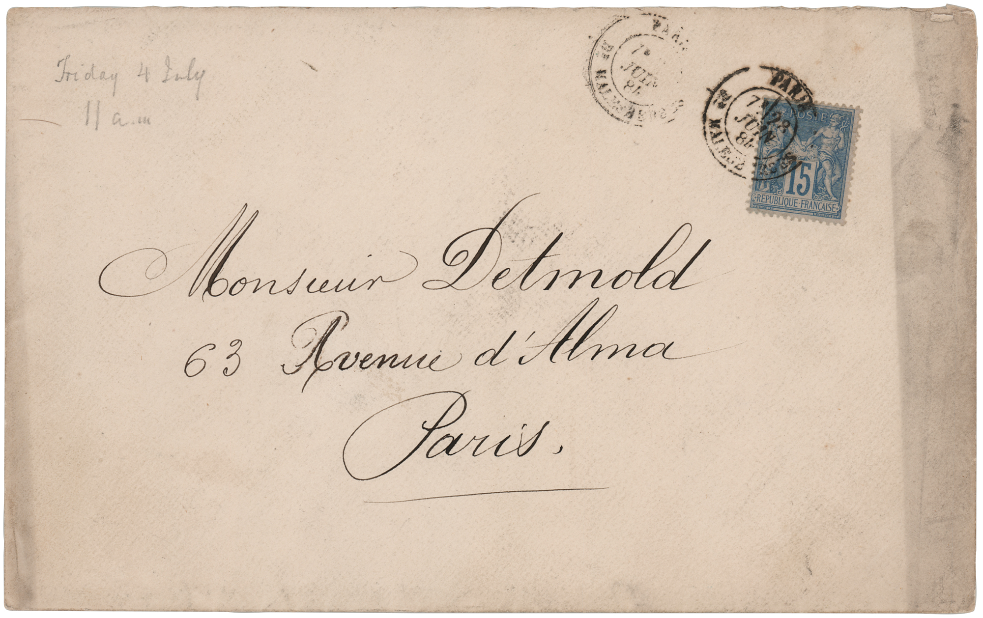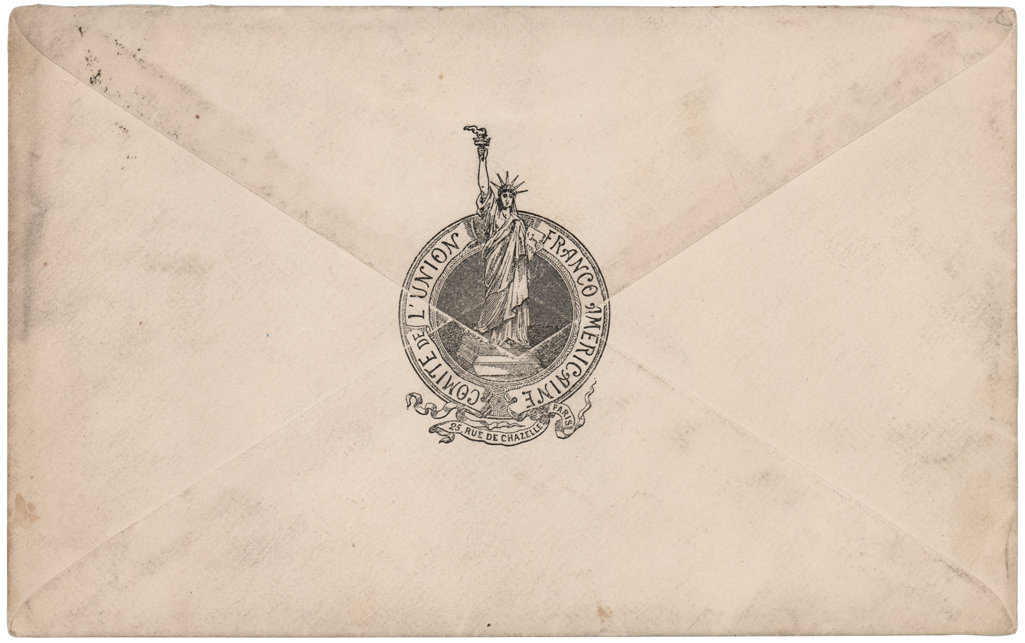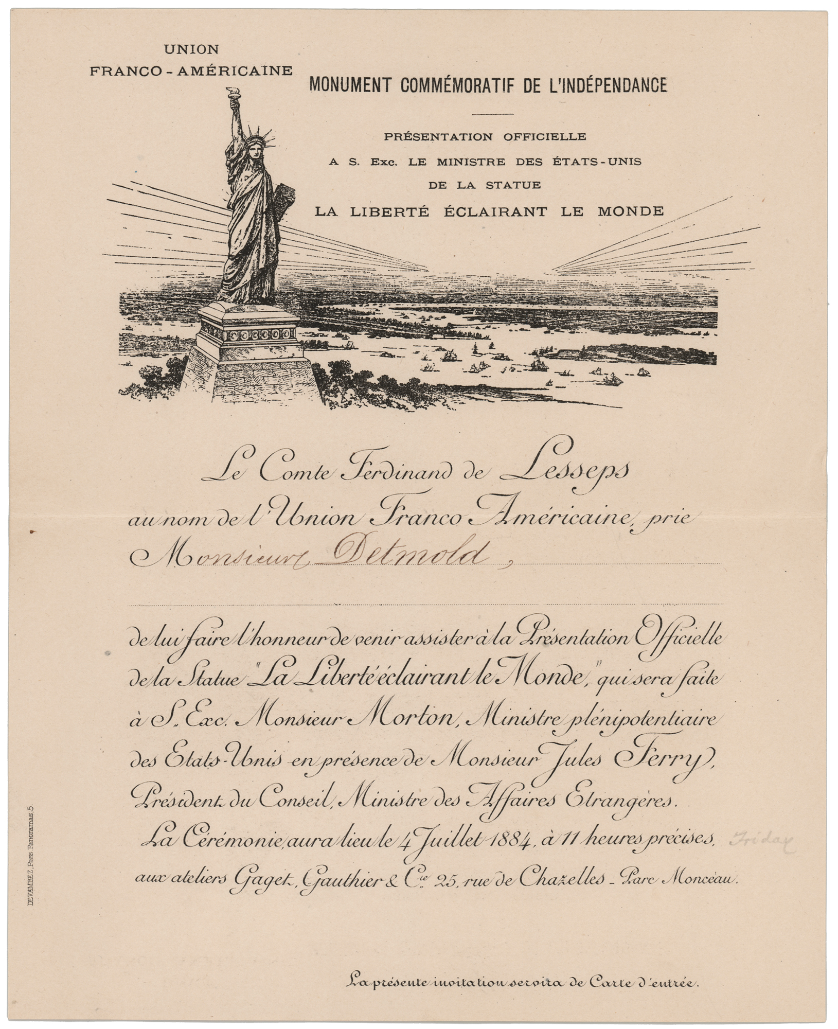 Scarce French-language original invitation from the Franco-American Union Committee for the first official presentation of the Statue of Liberty, which was held in the foundry yard of the Gaget, Gauthier & Co. workshops in Paris, France, on July 4, 1884, one page, 7.25 x 9, which reads (translated): “Count Ferdinand de Lesseps, on behalf of the Franco-American Union, requests Mr. Detmold, to do him the honor of attending the Official Presentation of the Statue ‘Liberty Enlightening the World,’ which will be made to His Excellency Mr. Morton, Minister Plenipotentiary of the United States, in the presence of Mr. Jules Ferry, President of the Council, Minister of Foreign Affairs. The Ceremony will take place on July 4, 1884, at 11 a.m. sharp, at the Gaget, Gauthier & Co. workshops, 25, rue de Chazelles.” The header of the invitation features an engraved image of the iconic statue looming high over a valley, with text that reads: “Commemorative Monument of Independence / Official Presentation to the Minister of the United States of the Statue, Liberty Enlightening the World.” In fine condition. Accompanied by the original mailing envelope, postmarked in Paris on June 7, 1884. After the presentation, the Statue of Liberty, which was conceived by jurist Édouard René de Laboulaye and designed by French sculptor Frédéric Auguste Bartholdi, was disassembled, packed into 214 crates, and shipped to the United States. It arrived in New York Harbor in June 1885 and was dedicated on its pedestal on October 28, 1886.