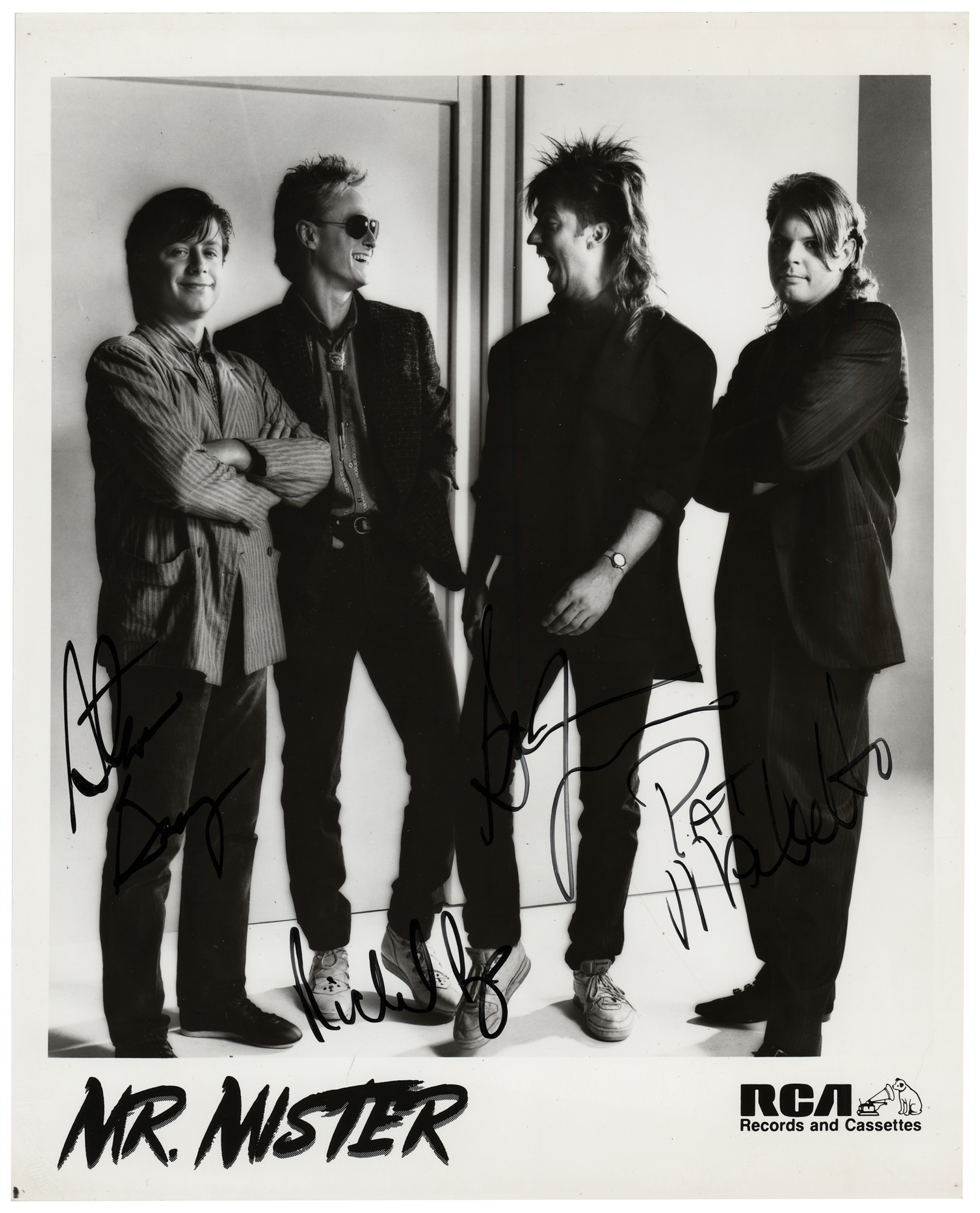 Glossy 8 x 10 RCA Records publicity photo of Mr. Mister, signed in black felt tip by Richard Page, Steve George, Pat Mastelotto, and Steve Farris. In fine condition.