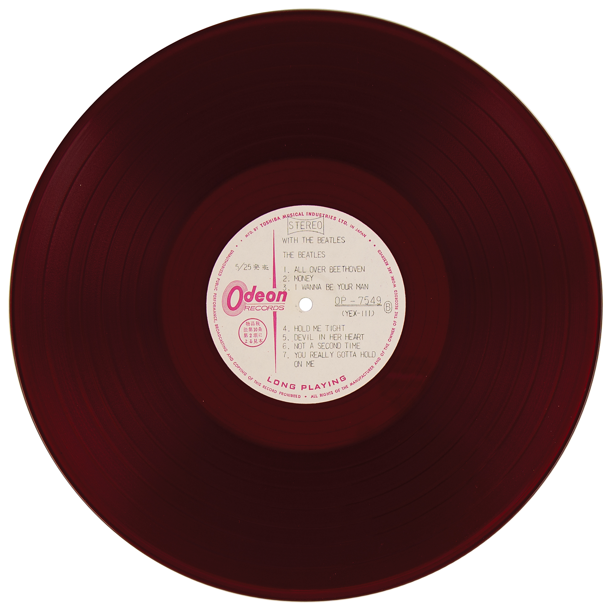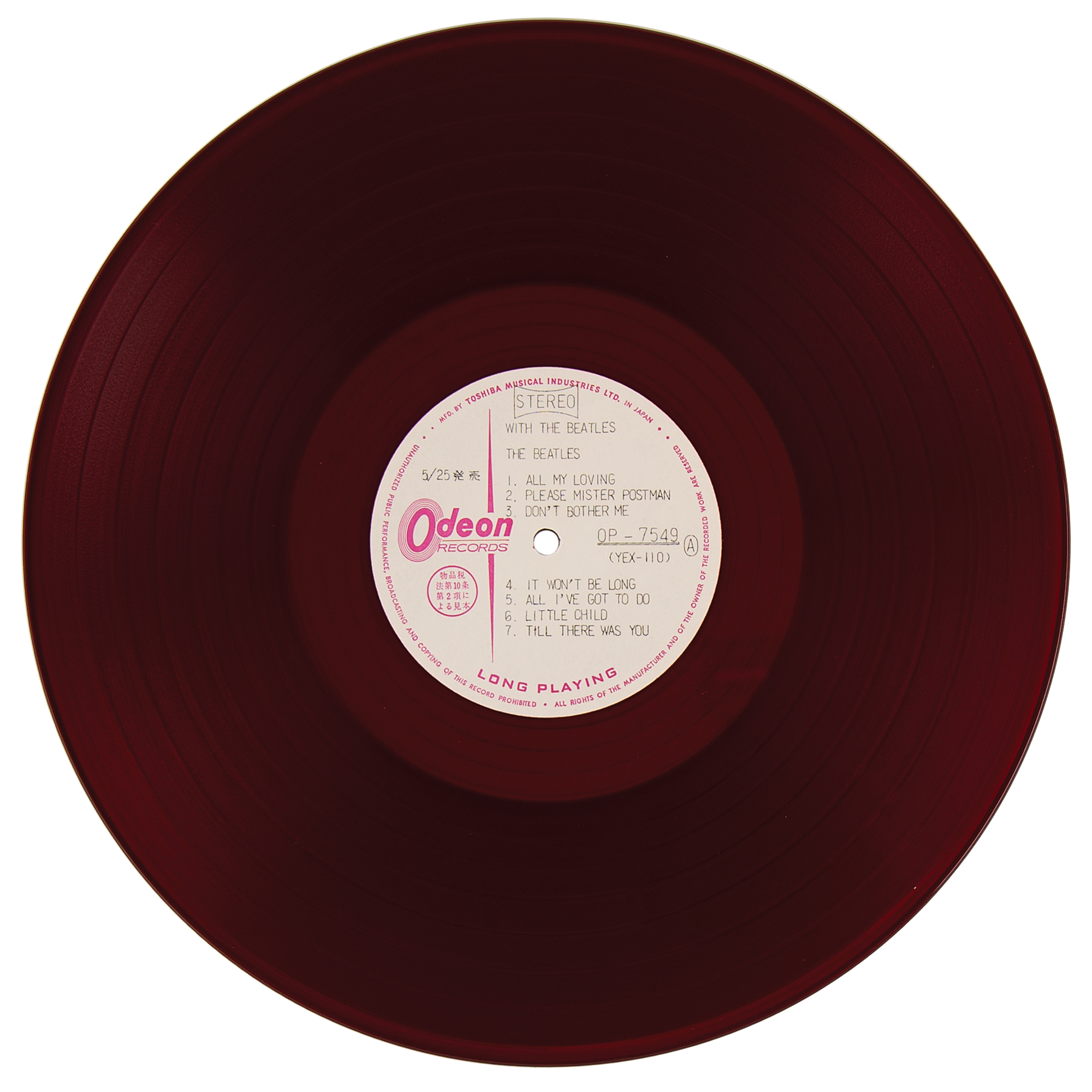 White-label test pressing (on dark red 'Everclean' vinyl) of Odeon's 1966 release of With the Beatles by the Beatles. This Japanese version of the band's second studio album has a vivid full-color portrait on the cover (in stark contrast to the iconic black-and-white faces shot of the UK version), with an accompanying 8-page color booklet, and the record carries a re-ordered track listing as compared to the standard UK issue. Pressed on gorgeously dark red vinyl with fantastic sound quality, the cover is in VG condition with some dings and wear, but with a beautiful VG++ disc.