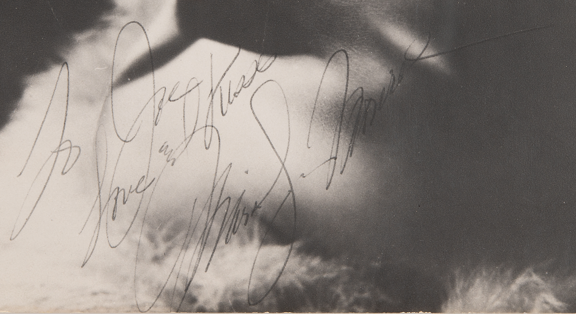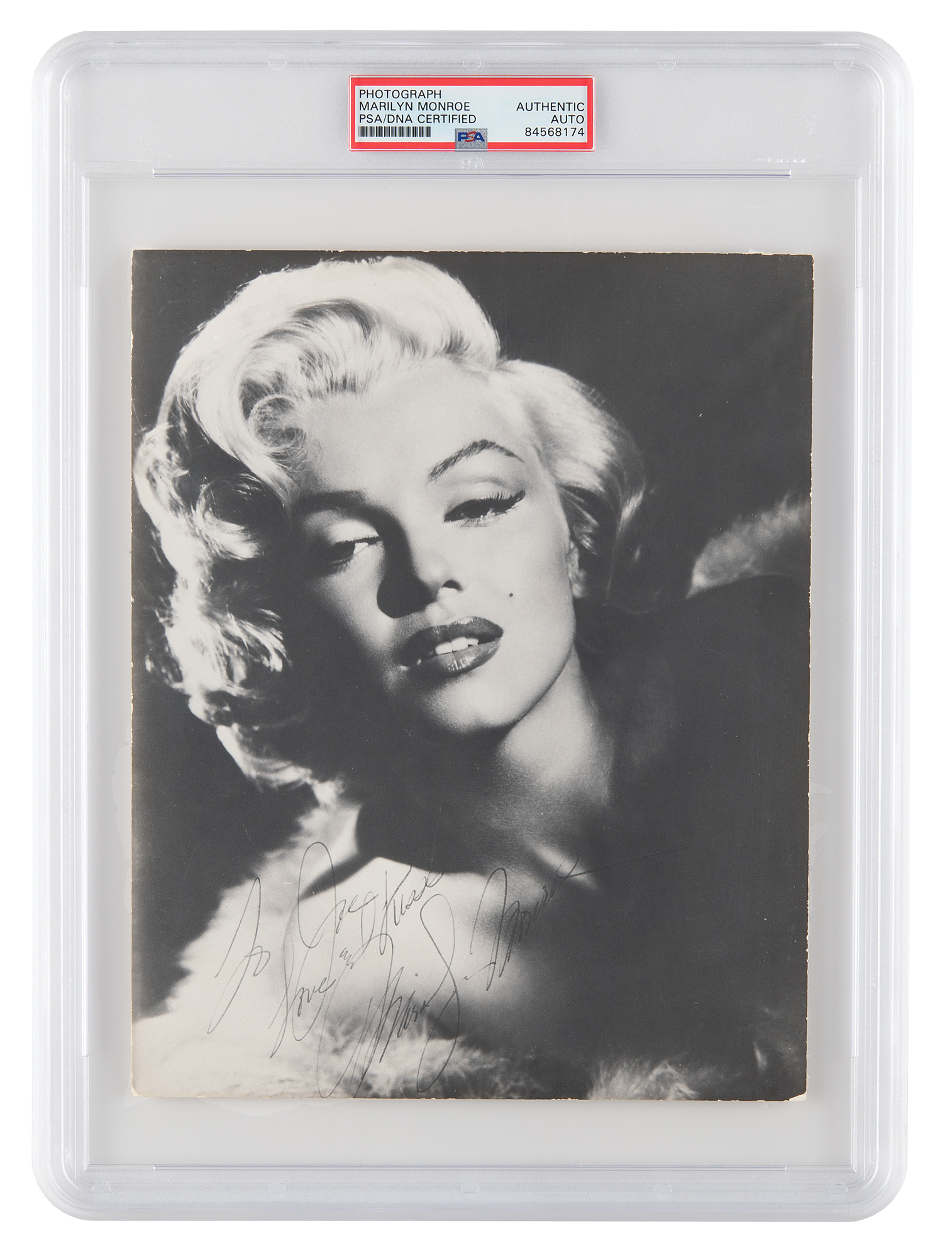 Vintage matte-finish 7.5 x 9.5 portrait photo of Monroe taken during a Frank Powolny glamour shoot in 1953, signed and inscribed in black ballpoint, “To Joe, Love & kisses, Marilyn Monroe.” In fine condition, with tastefully trimmed edges slightly impinging on the bottom of the first letter of the signature. Encapsulated in a PSA/DNA authentication holder. Monroe and Powolny most famously teamed up in 1953 for a series of stunning, artfully framed publicity stills for the 1953 film Gentlemen Prefer Blondes. Immortalized for his classic World War II pinup of Betty Grable, Powolny remained a trusted photographer for Monroe throughout her career, and is noted as taking the last known still photographs of the starlet during production of Something's Got to Give, one week before she died in 1962.