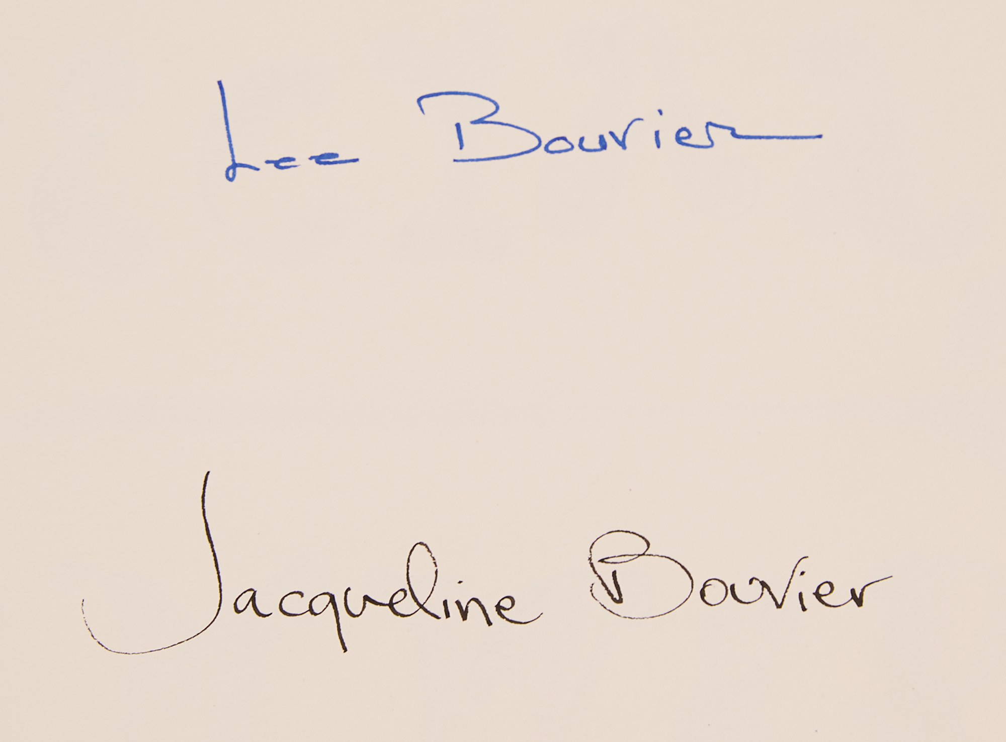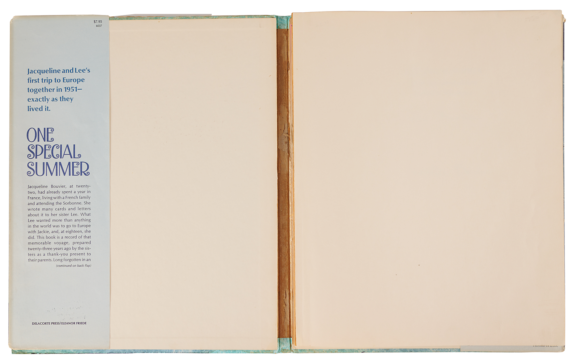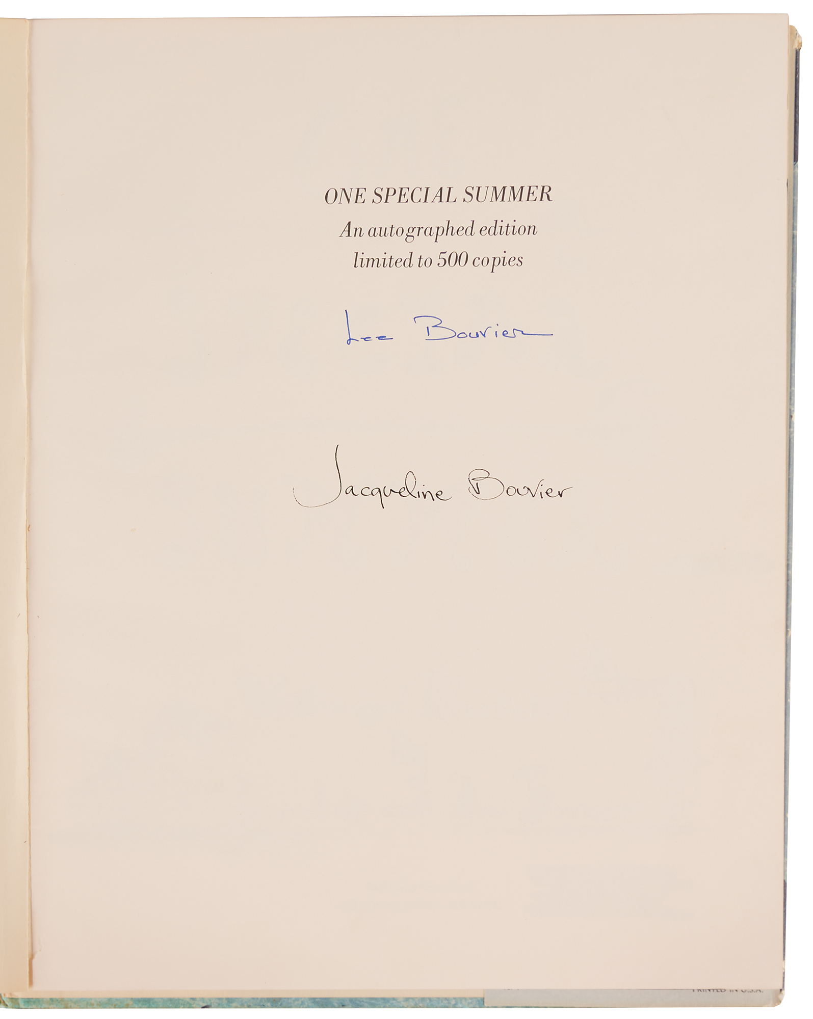 Signed book: One Special Summer. Limited autographed first edition of 500 copies. NY: Delacorte Press, 1974. Attractive hardcover with textured pictorial slipcase, 10.75 x 13.25, signed in ink on the colophon, “Jacqueline Bouvier” and “Lee Bouvier.” Autographic condition: very fine. Book condition: G/G, with the textblock detached from the binding, ex-library labels to spine, surface loss to rear endpaper, and significant tears and chipping to dust jacket.