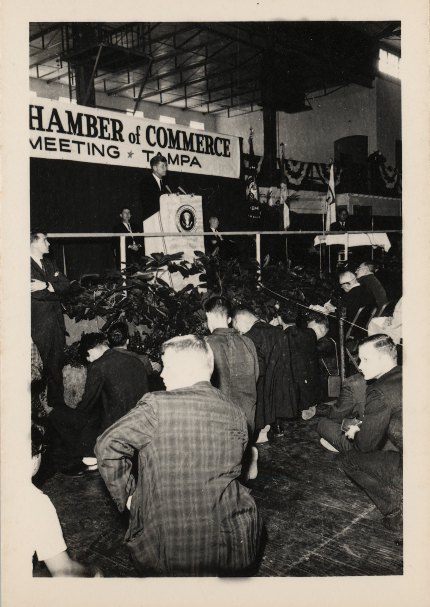 Ten original vintage matte-finish 5 x 3.5 candid photographs of President John F. Kennedy's visit to Tampa on November 18, 1963, just four days before his assassination. The images show Kennedy speaking at the presidential podium, speaking before the Chamber of Commerce, as well as the dignitaries in attendance and the gaggles of press covering the event—one of his last major speeches before that fateful day in Dallas. All are marked on the reverse in ballpoint: "©2000, V. Friend, All Rights Reserved." In overall very fine condition.