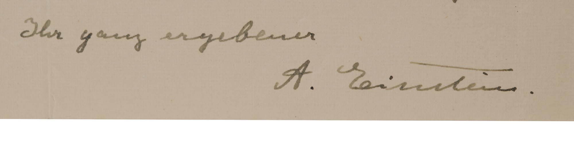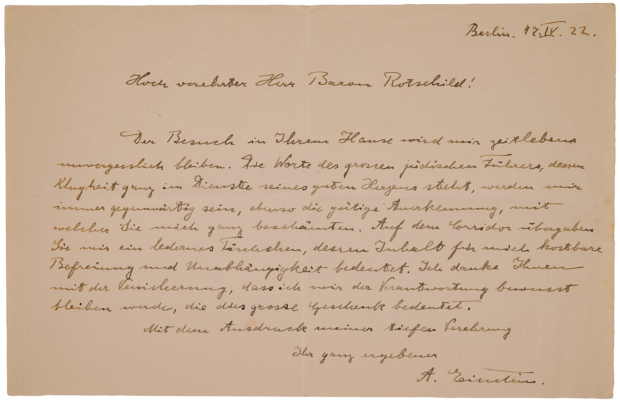 ALS in German, signed “A. Einstein,” one page, 8.5 x 11, April 17, 1922. Handwritten letter to Edmond de Rothschild, thanking him for his financial gift. Rothschild, a Zionist philanthropist since the end of the 19th century, had just given the scientist a sum of money which Einstein considered a symbol 'of liberation and independence.' In full (translated): "Very respected Baron Rothschild! My visit to you will remain engraved in my memory forever. Your words as a great Jewish guide whose intelligence is entirely at the service of his goodness will accompany me forever, just like your generous gesture which totally embarrasses me. You handed me a small leather briefcase in the hallway, the contents of which mean something precious to me: liberation and independence. I thank you with the assurance that I will remain aware of the responsibility brought by this present. With the expression of my deep admiration." In fine condition.