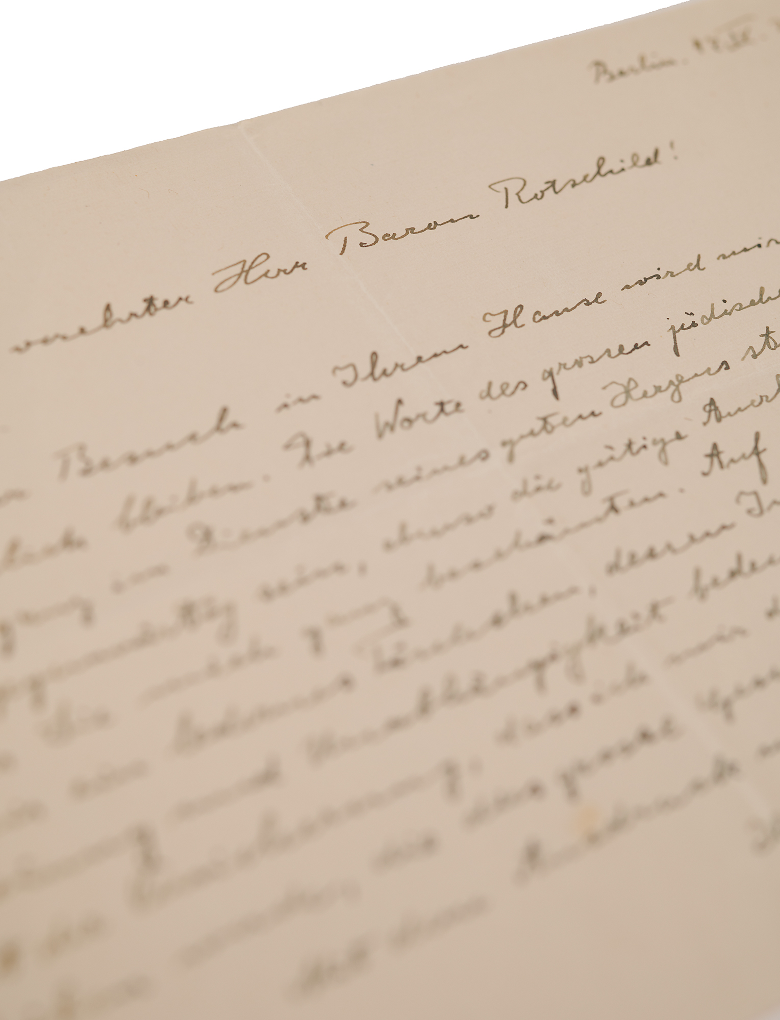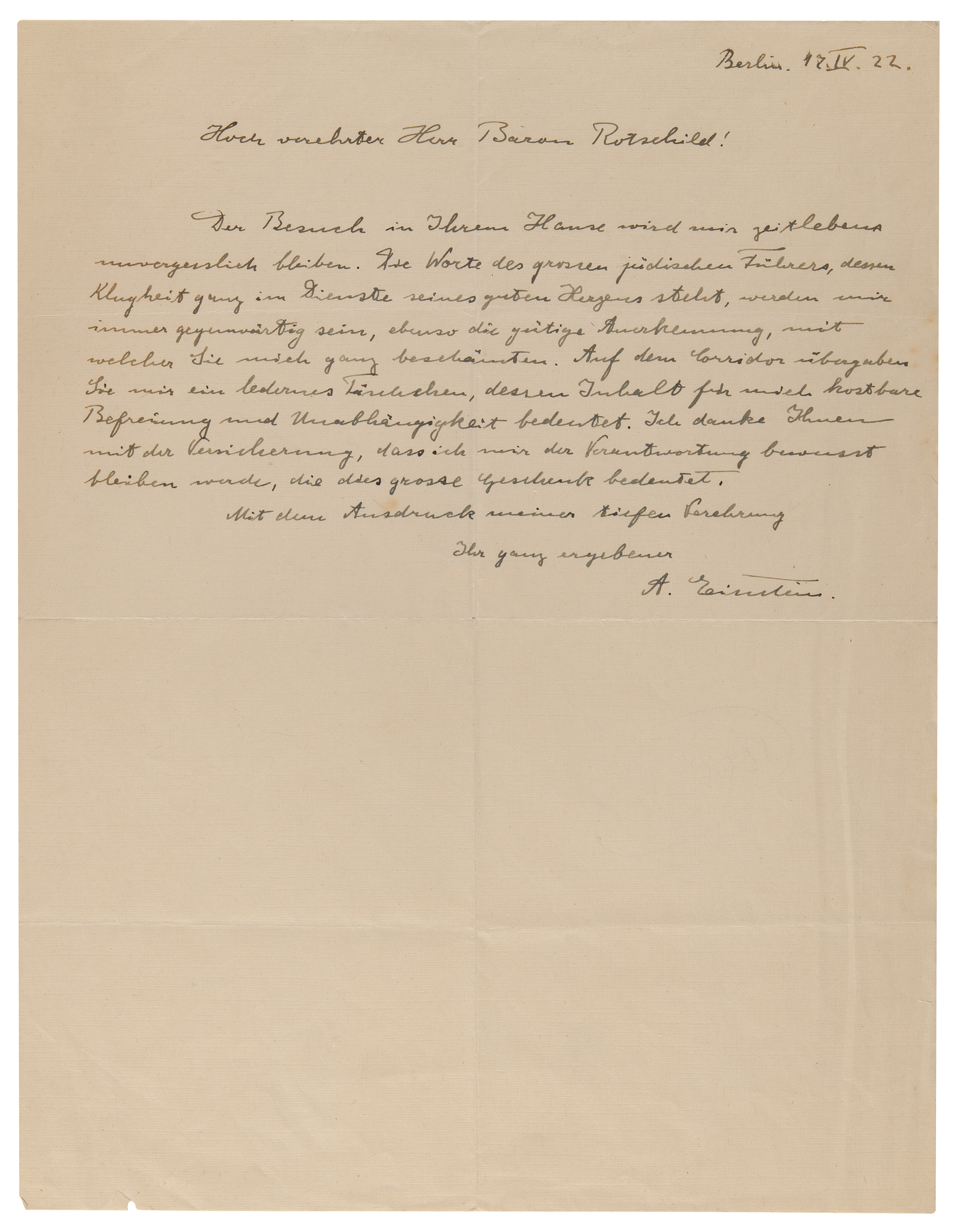 At the dawn of the 1920s, Einstein—internationally admired for his scientific discoveries—was asked by Chaim Weizmann, leader of the World Zionist Organization, to raise the funds necessary to support the Jewish people and their settlement in Palestine. The scientist dedicated himself body and soul to this cause and undertook, throughout 1921, a tour on American soil calling for unwavering support for the Jewish cause. It was in this circumstance that he met, in Paris, on April 7, 1922, an early Zionist proselyte, Baron Edmond de Rothschild (1845–1934). 'Yesterday I visited Rothschild who gave me a briefcase full of money. A clever man,' he confided the next day to his wife Elsa. This letter from Einstein—the only one known addressed to Rothschild—was transmitted through his friend Maurice Solovine. Indeed, Einstein, returning to Berlin, had lost the philanthropist's address.